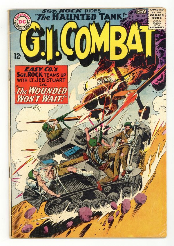 Cover by Joe Kubert. Written by Robert Kanigher and Hank Chapman. Art by Joe Kubert and Jerry Grandenetti. Lt. Stuart is trying to get his three wounded crewmen to an army hospital when he is helped by Sgt. Rock and a couple of Easy Company soldiers. But they are also wounded. Tank commander and sergeant dodge more tanks to reach a field hospital, but it's under fire from an enemy advance in "The Wounded Won't Wait!" by Robert Kanigher and Joe Kubert. Starring the Haunted Tank, Jeb Stuart, Arch Asher, Rick Rawlins, Slim Stryker, General J.E.B. Stuart (ghost), Sgt. Rock and Easy Company [Ice Cream Soldier, Wild Man]. Plus: "Private War!" by Hank Chapman and Jerry Grandenetti. 36 Pages, Full Color. Cover price $0.12.