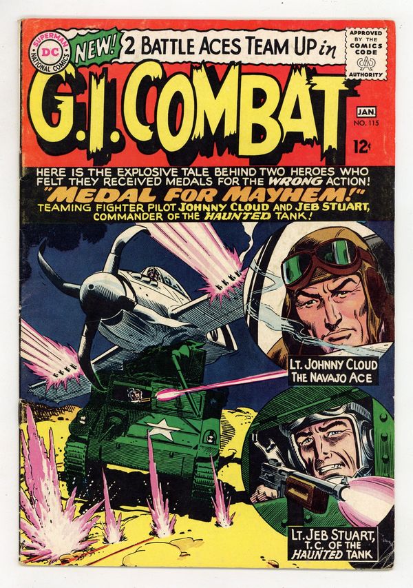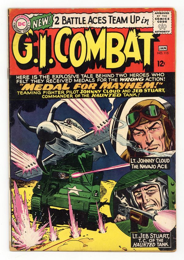 Cover by Russ Heath. Written by Robert Kanigher and Hank Chapman. Art by Russ Heath and Jack Abel. Here is the explosive tale behind two heroes who felt they received medals for the wrong action! Teaming fighter pilot Johnny Cloud and Jeb Stuart, commander of the Haunted Tank! Don't miss..."Medal for Mayhem!" by Robert Kanigher and Russ Heath. Starring the Haunted Tank, Jeb Stuart, Arch Asher, Rick Rawlins, Slim Stryker, General J.E.B. Stuart (ghost), Johnny Cloud and Sgt Rock. Plus: "Deep-Freeze Frogs!" by Hank Chapman and Jack Abel. 36 Pages, Full Color. Cover price $0.12.
