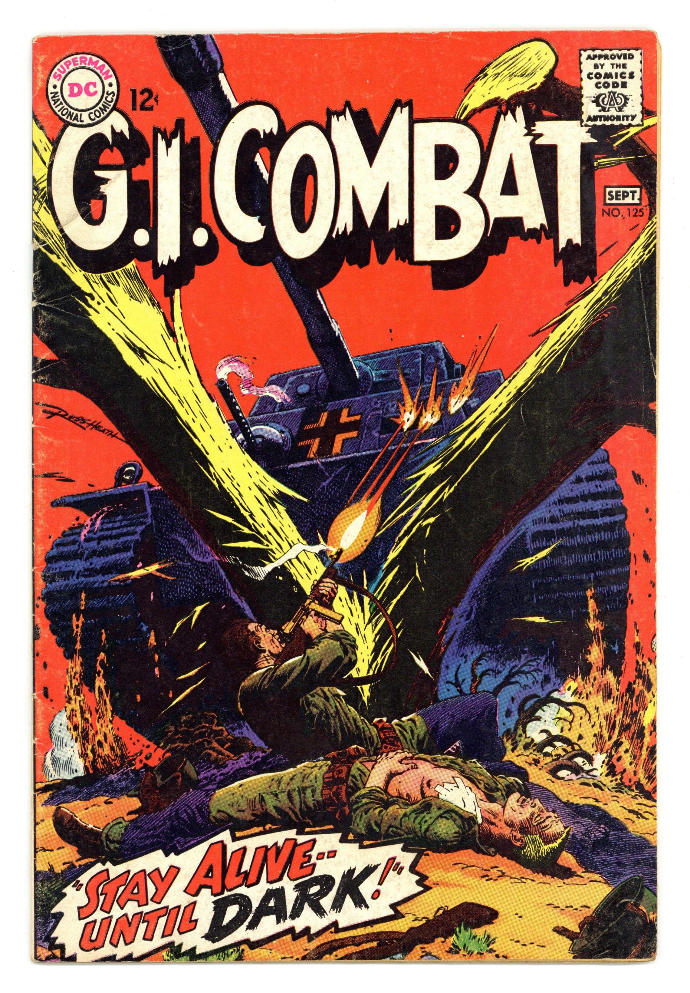 Written by Robert Kanigher and Bob Haney. Art and Cover by Russ Heath. Featuring the Haunted Tank in "Stay Alive -- Until Dark!" by Robert Kanigher and Russ Heath. Plus: "Clay Pigeon Sub!" by Bob Haney and Heath, reprinted from Our Army at War (1952) #47. 36 Pages, Full Color. Cover price $0.12.