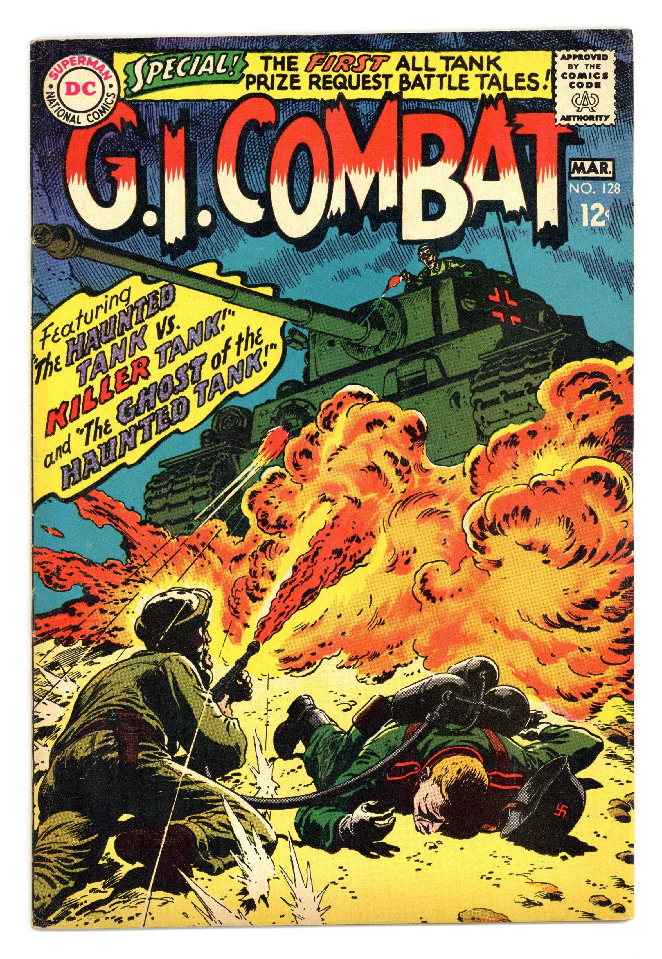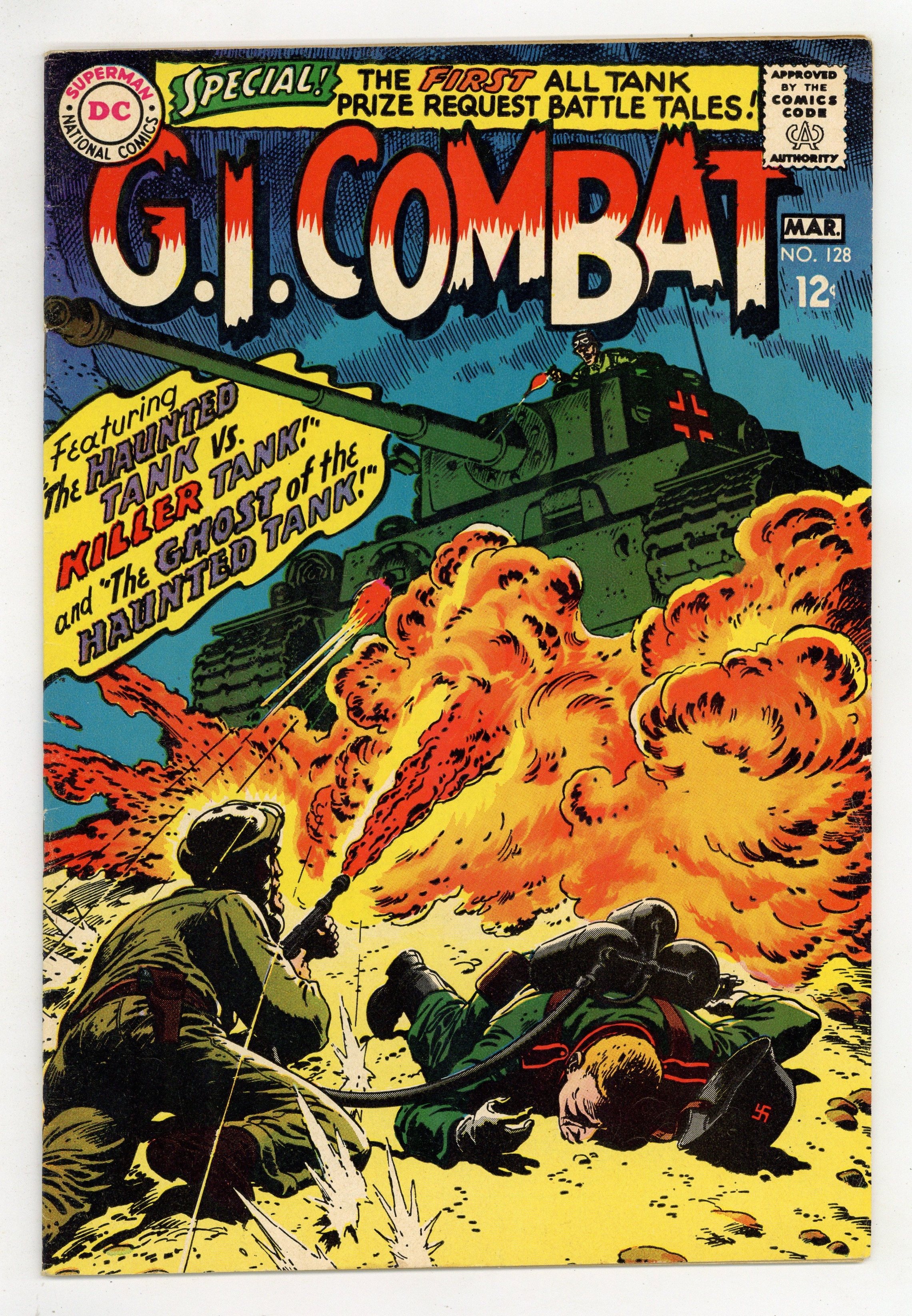 Written by Robert Kanigher. Art and Cover by Russ Heath. Special! The first all tank prize request battle tales! The crew of the Haunted Tank begins to think Jeb Stuart is crazy because he sees the ghost of General Stuart in "The Ghost of the Haunted Tank!", reprinted from issue #95. Plus: The Haunted Tank crew must figure out how the Nazis are able to destroy their tanks in numerical order in "The Haunted Tank vs. Killer Tank!", reprinted from issue #94. 36 Pages, Full Color. Cover price $0.12.