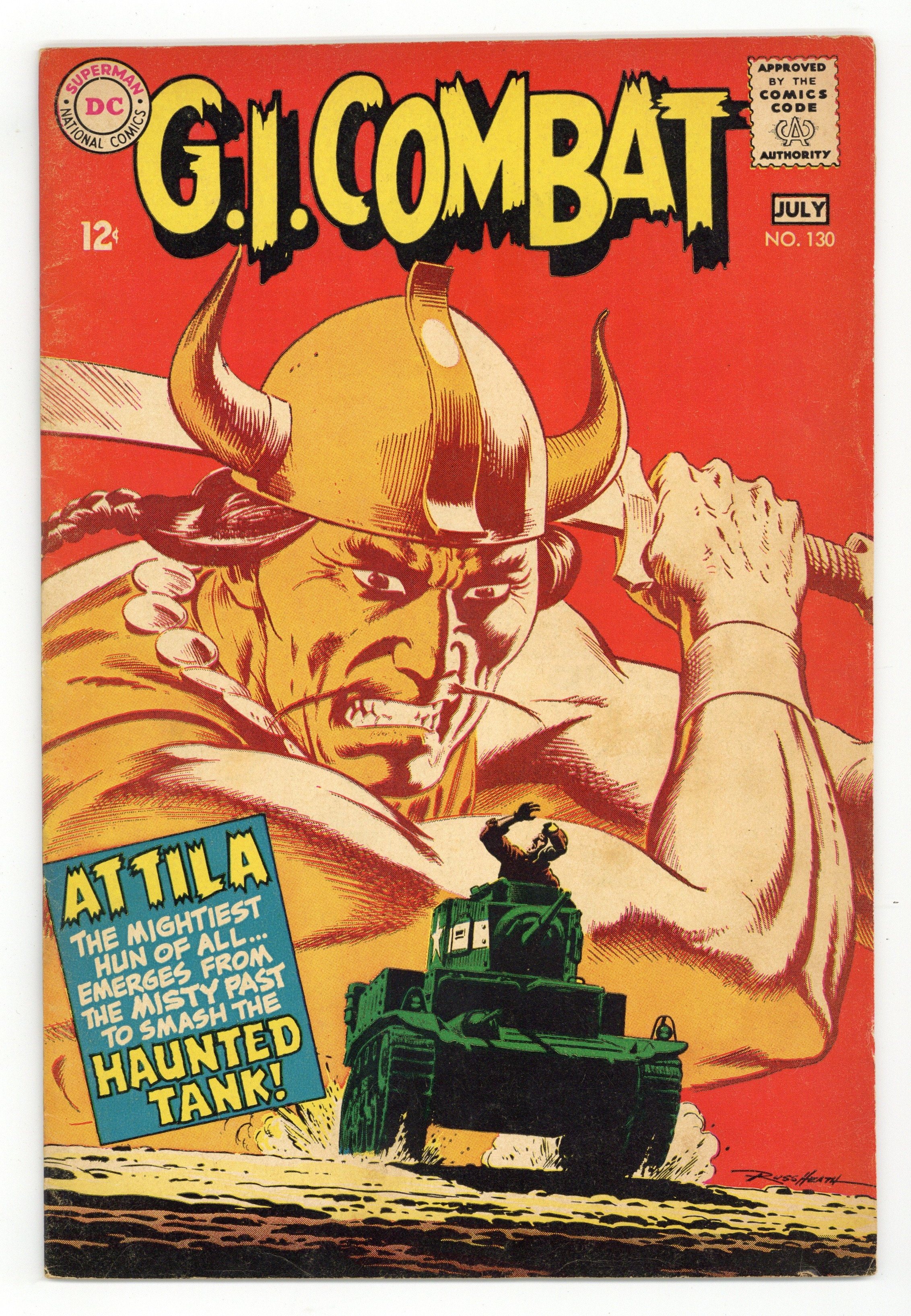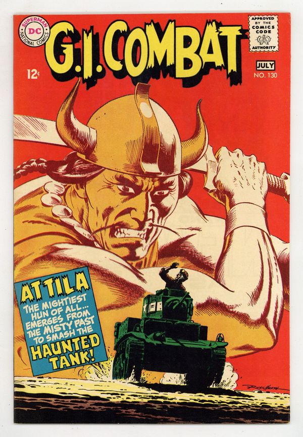$19.75Cover by Russ Heath. Written by Robert Kanigher. Art by Russ Heath, Ross Andru and Mike Esposito. Attila, the mightiest Hun of all, emerges from the misty past to smash the Haunted Tank in "Battle of the Generals!" by Robert Kanigher and Russ Heath. Plus: "Landing Postponed!" by Kanigher, Ross Andru and Mike Esposito, reprinted from Our Army at War (1952) #49. Also: In the letters section, Joe Kubert explains that Robert Kanigher has stepped down from his editorial post to concentrate on writing and that he is the new editor. 36 Pages, Full Color. Cover price $0.12.