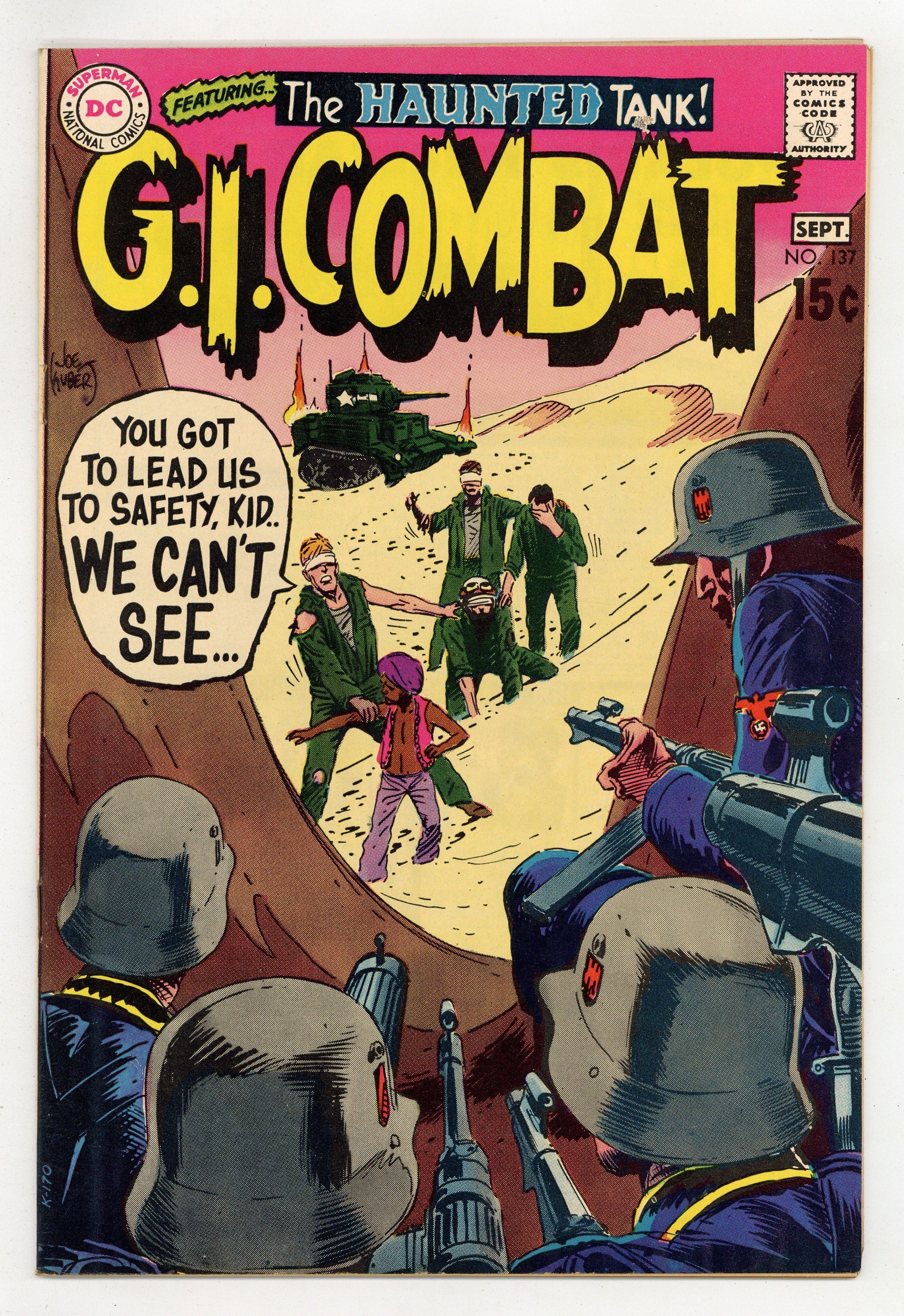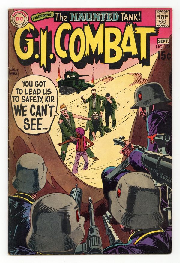 First 15c cover-priced issue. Cover by Joe Kubert. Written by Robert Kanigher, Bob Haney and John Costanza. Art by Russ Heath, Joe Kubert, John Costanza and Ken Barr. Featuring the Haunted Tank in "We Can't See" by Robert Kanigher and Russ Heath. Plus: "Story of a Boot!" by Bob Haney and Joe Kubert, reprinted from All American Men of War (1952) #64; 1-pager "G.I. Jinx" by John Costanza; 1.5-pager "Navy Talk" by Costanza; and Battle Album 2-pager "Armor at War," with art by Ken Barr. 36 Pages, Full Color. Cover price $0.15.