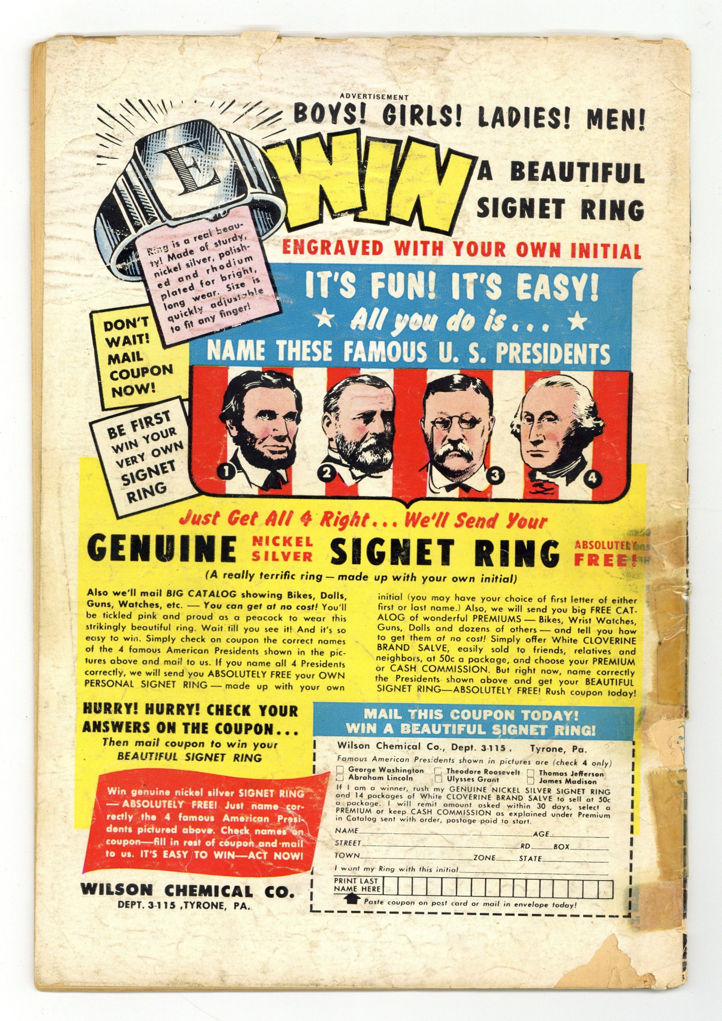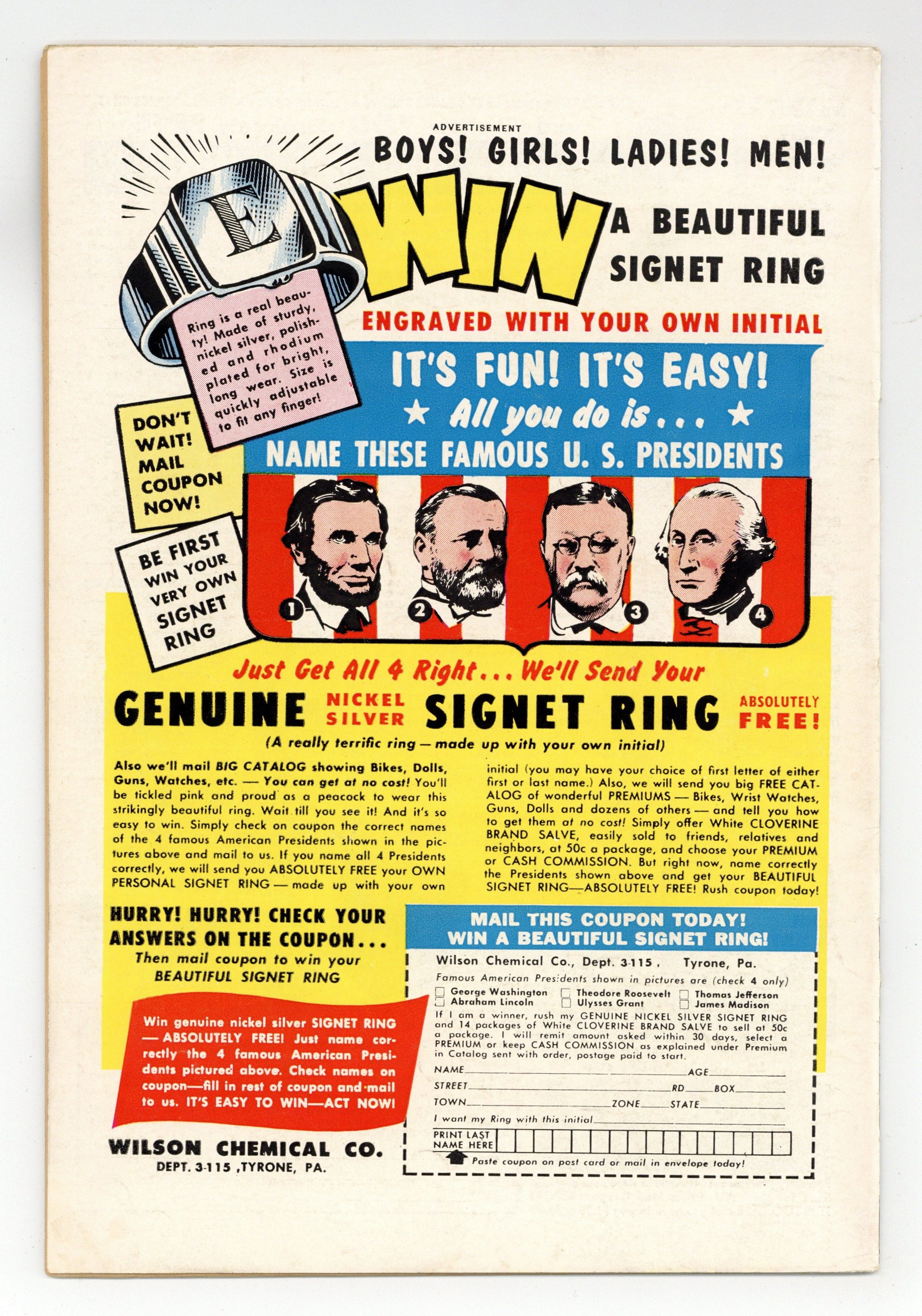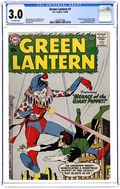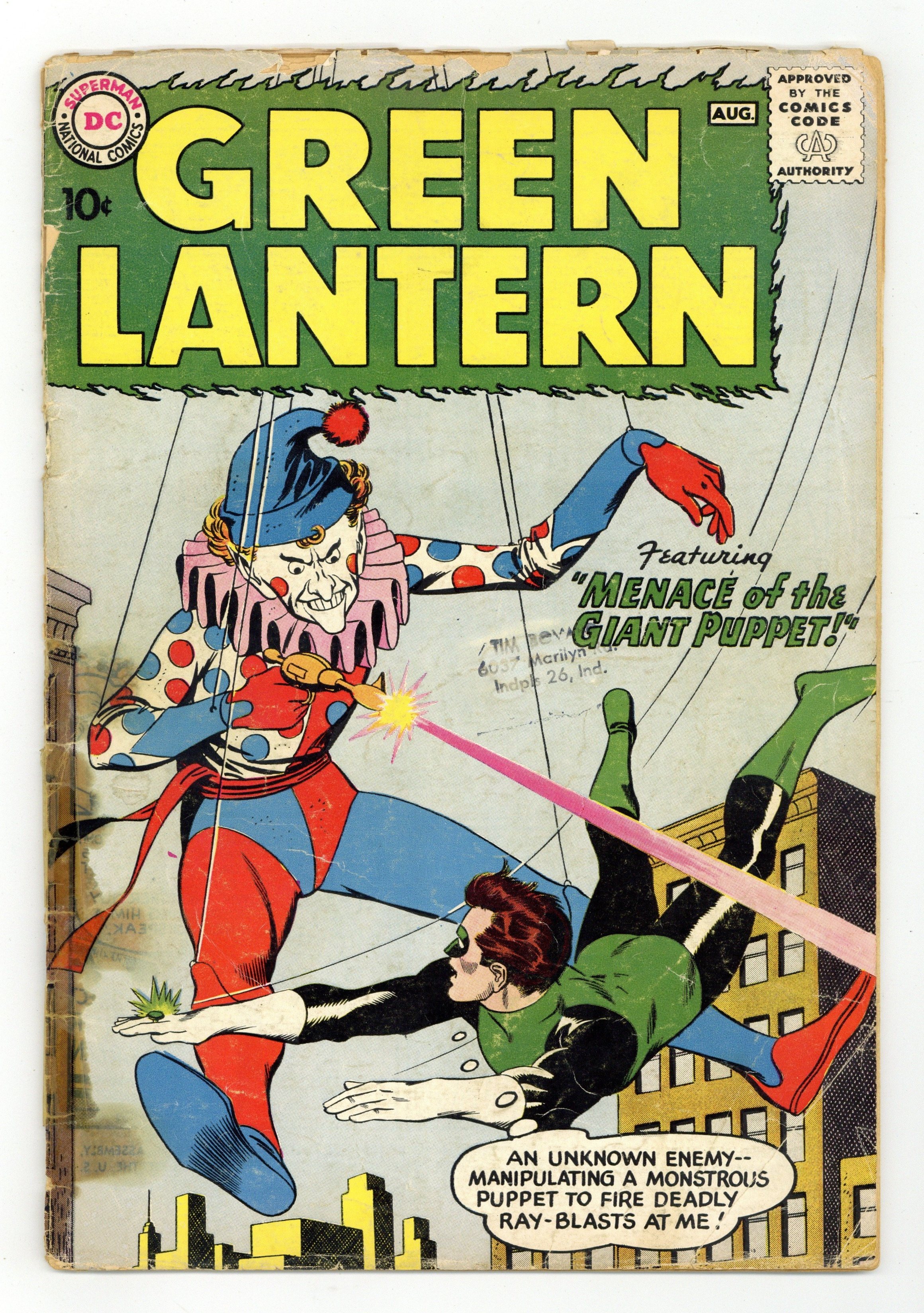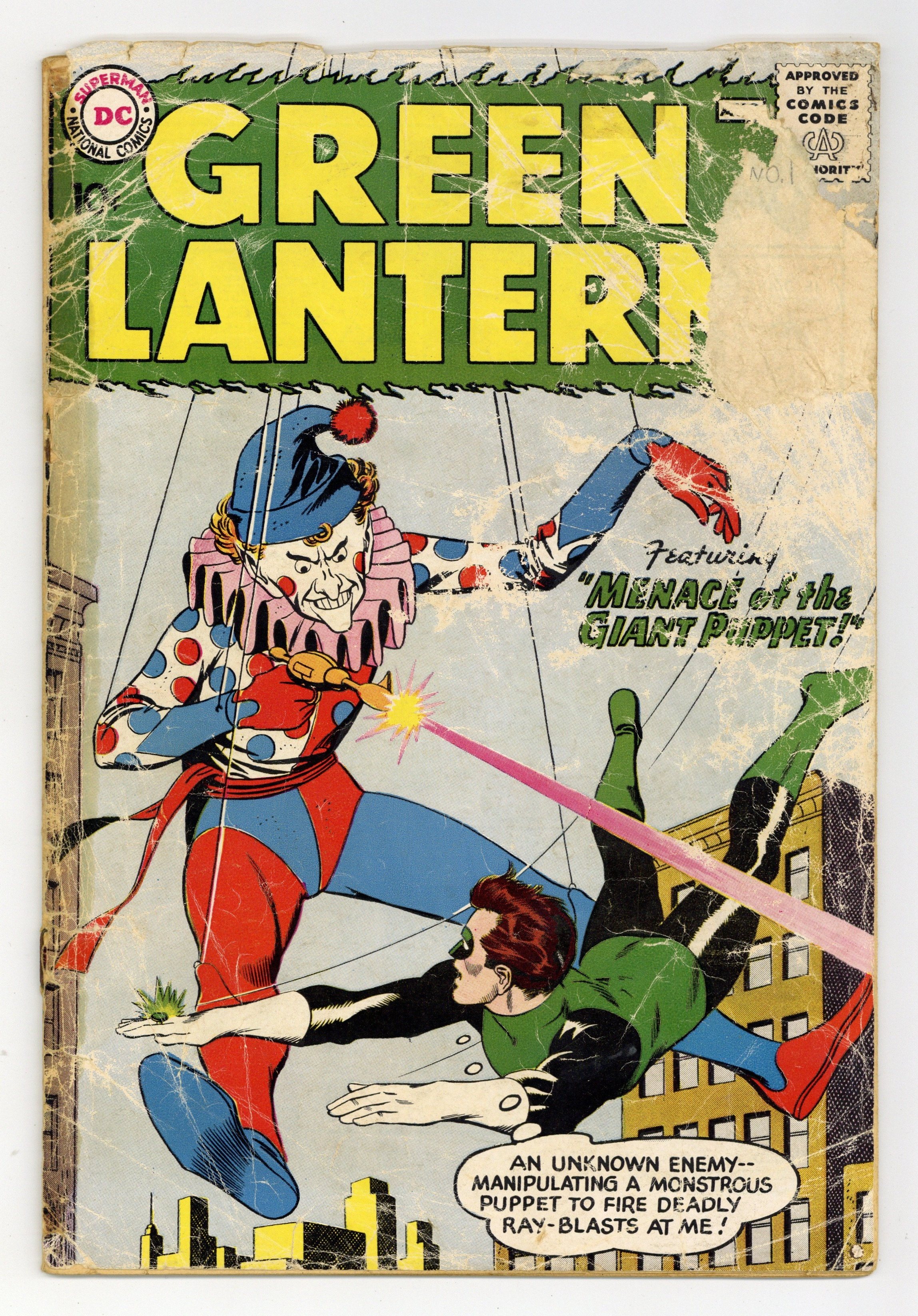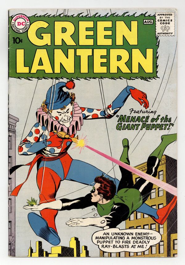 Cover pencils by Gil Kane, inks by Joe Giella. Buzzy Says: Free Speech -- Free For All! public service announcement, script by Jack Schiff, art by Win Mortimer. The Planet of Doomed Men, script by John Broome, pencils by Gil Kane, inks by Murphy Anderson; Hal Jordan's energy-duplicate is summoned by the Guardians for the first time. After he is returned to Earth the Guardians send him to Calor, a nearby planet, to save the Calorians from the ape-monster Dryg. Many Loves of Dobie Gillis ad, art by Bob Oksner. Menace of the Giant Puppet!, script by John Broome, pencils by Gil Kane, inks by Joe Giella; The Puppet-Master invents a Hypno-Ray and commits crimes using others as puppets, until he attempts to capture Green Lantern, who instead captures him. Meanwhile, Carol Ferris daydreams of marrying Green Lantern. Letter to the editor from comic writer Roy Thomas. 36 pages, full color. Cover price $0.10.