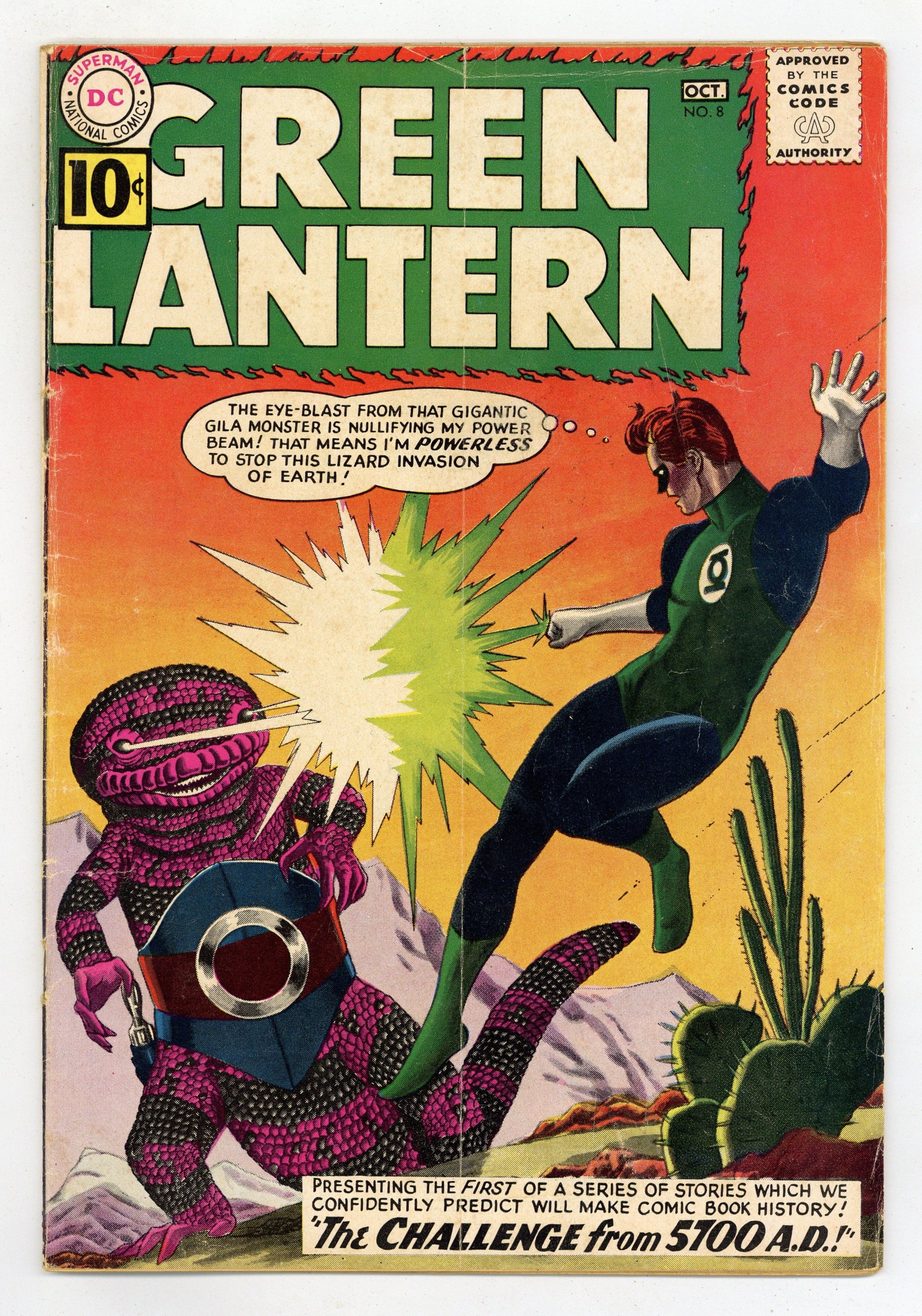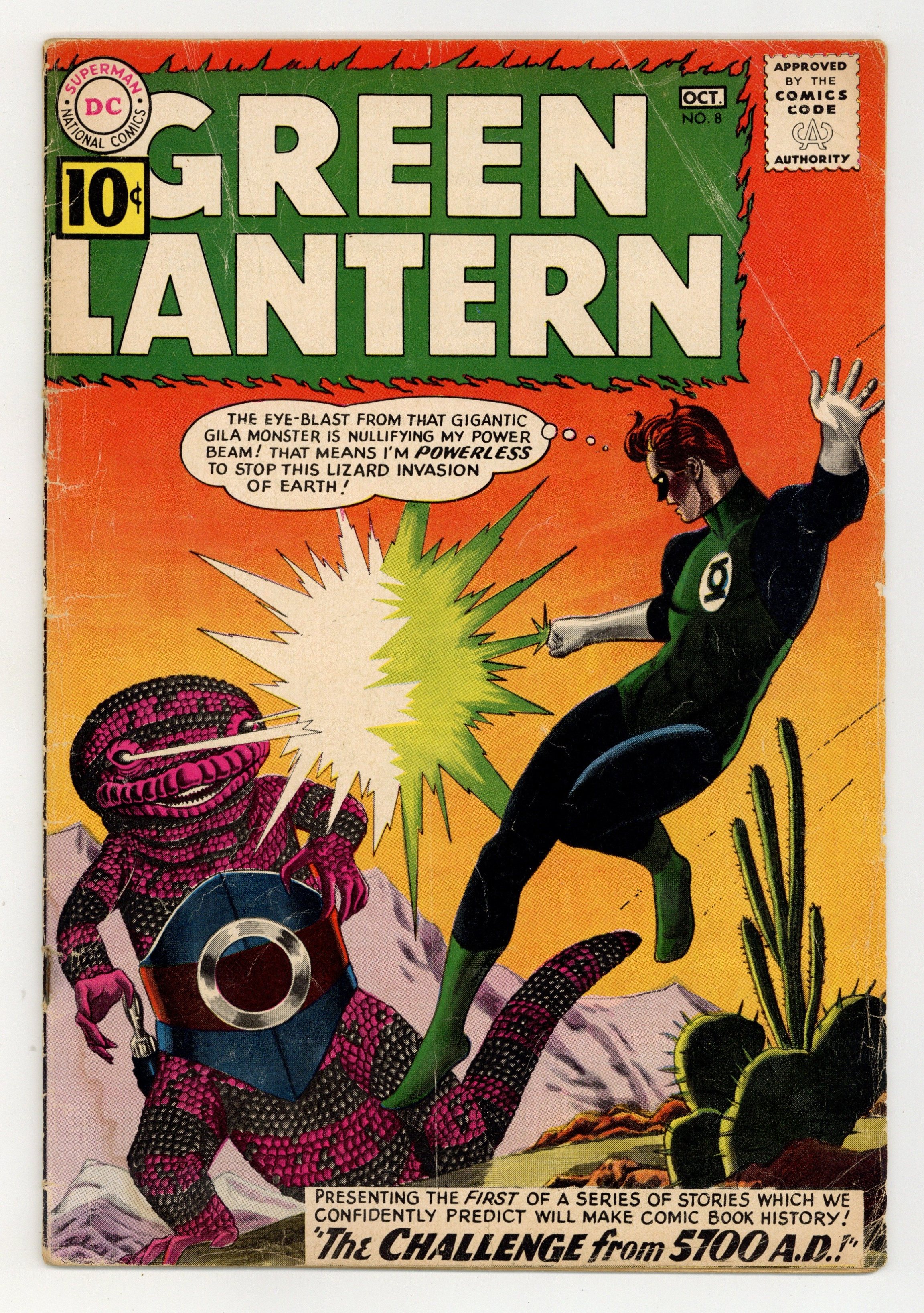 Cover pencils by Gil Kane, inks by Jack Adler. The Challenge From 5700 A.D.!, script by John Broome, pencils by Gil Kane, inks by Joe Giella; Zegors, a highly evolved gila monster form, have the earth under attack in 5700 AD, and the ruling Solarite council brings Hal Jordan to defeat them; He does so by destroying their main weapon and is returned to the present, with no knowledge of his adventure. 36 pgs. $0.10. Cover price $0.10.