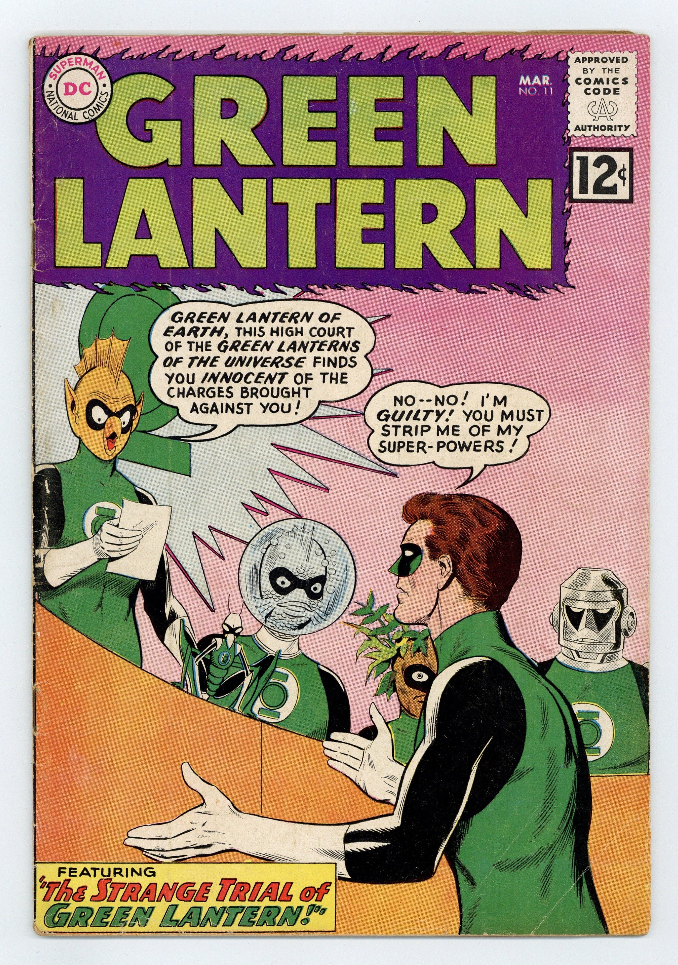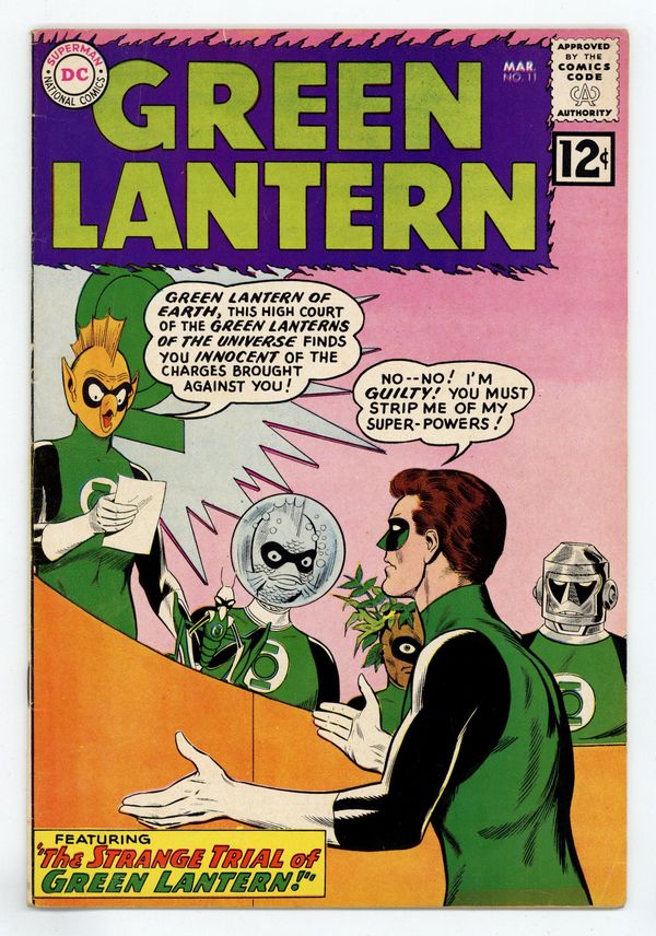 Cover pencils by Gil Kane, inks by Joe Giella. The Strange Trial of Green Lantern!, script by John Broome, pencils by Gil Kane, inks by Joe Giella; Sinestro tries to mind control Hal Jordan. Hal's behavior gets him called before the Green Lantern Corps. Trail of the Missing Power Ring!, script by John Broome, pencils by Gil Kane, inks by Joe Giella; Hal Jordan loses his power ring and it's found by a child. Letter to the editor from comic artist Joe Staton. 36 pgs. $0.12. Cover price $0.12.