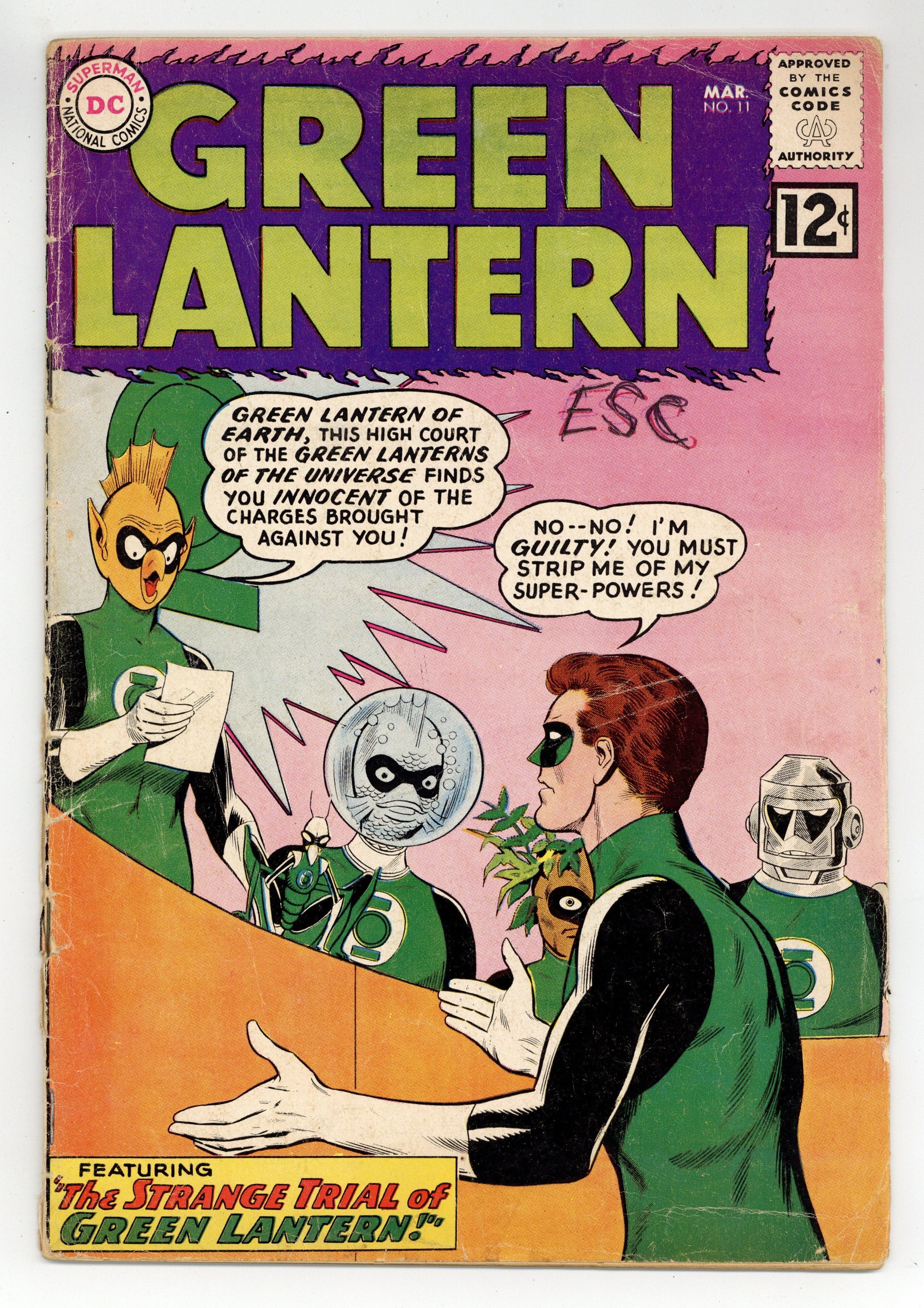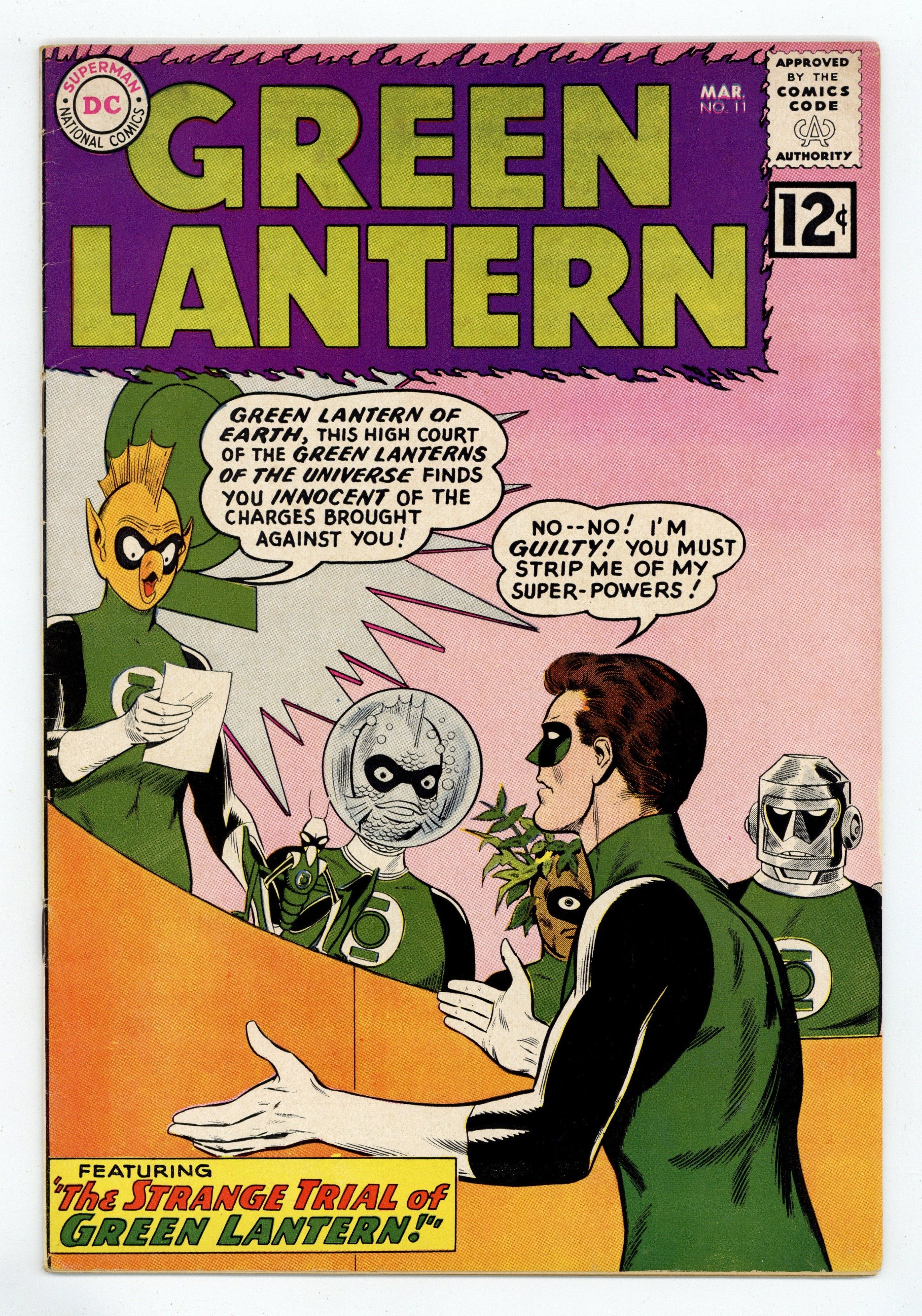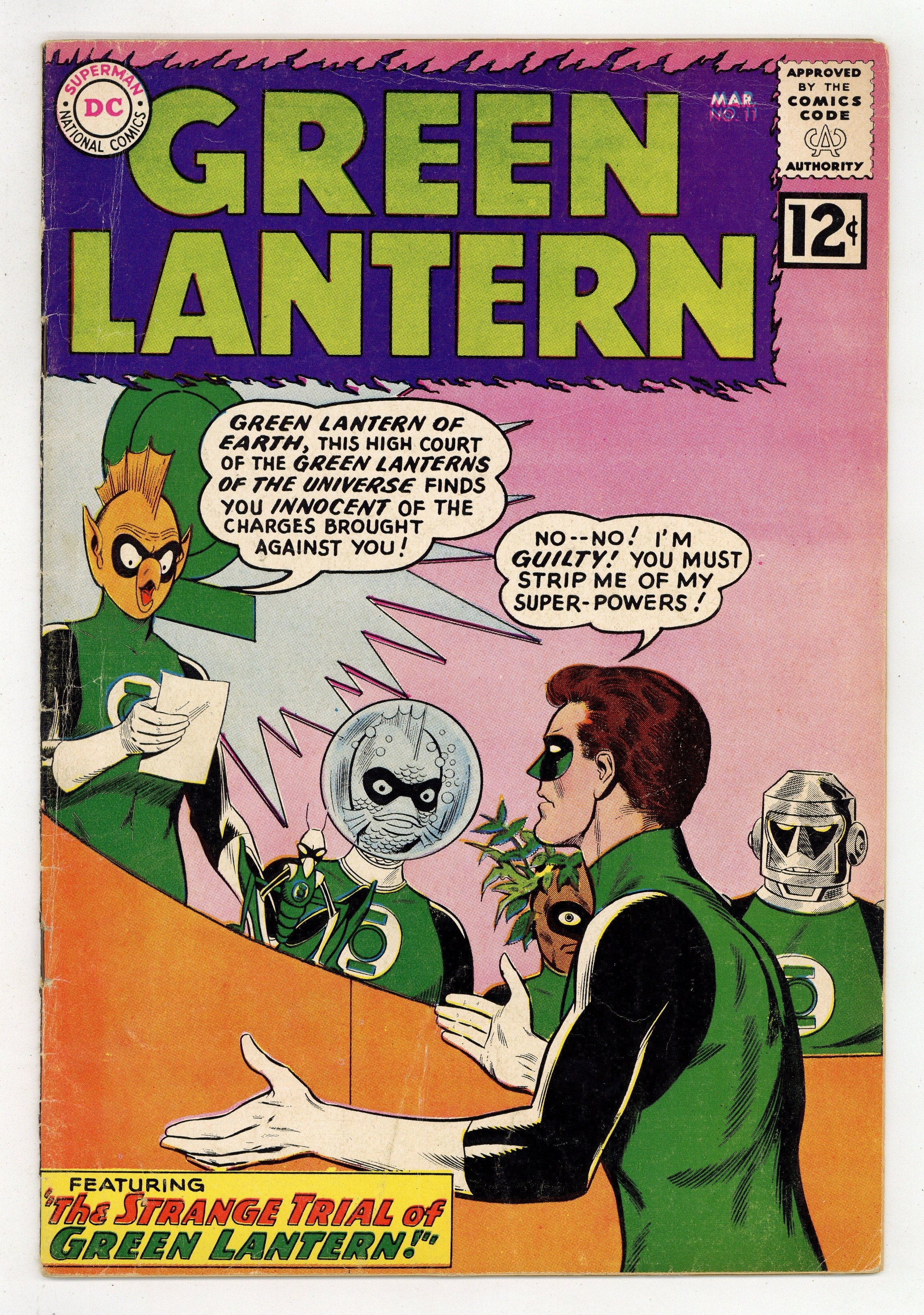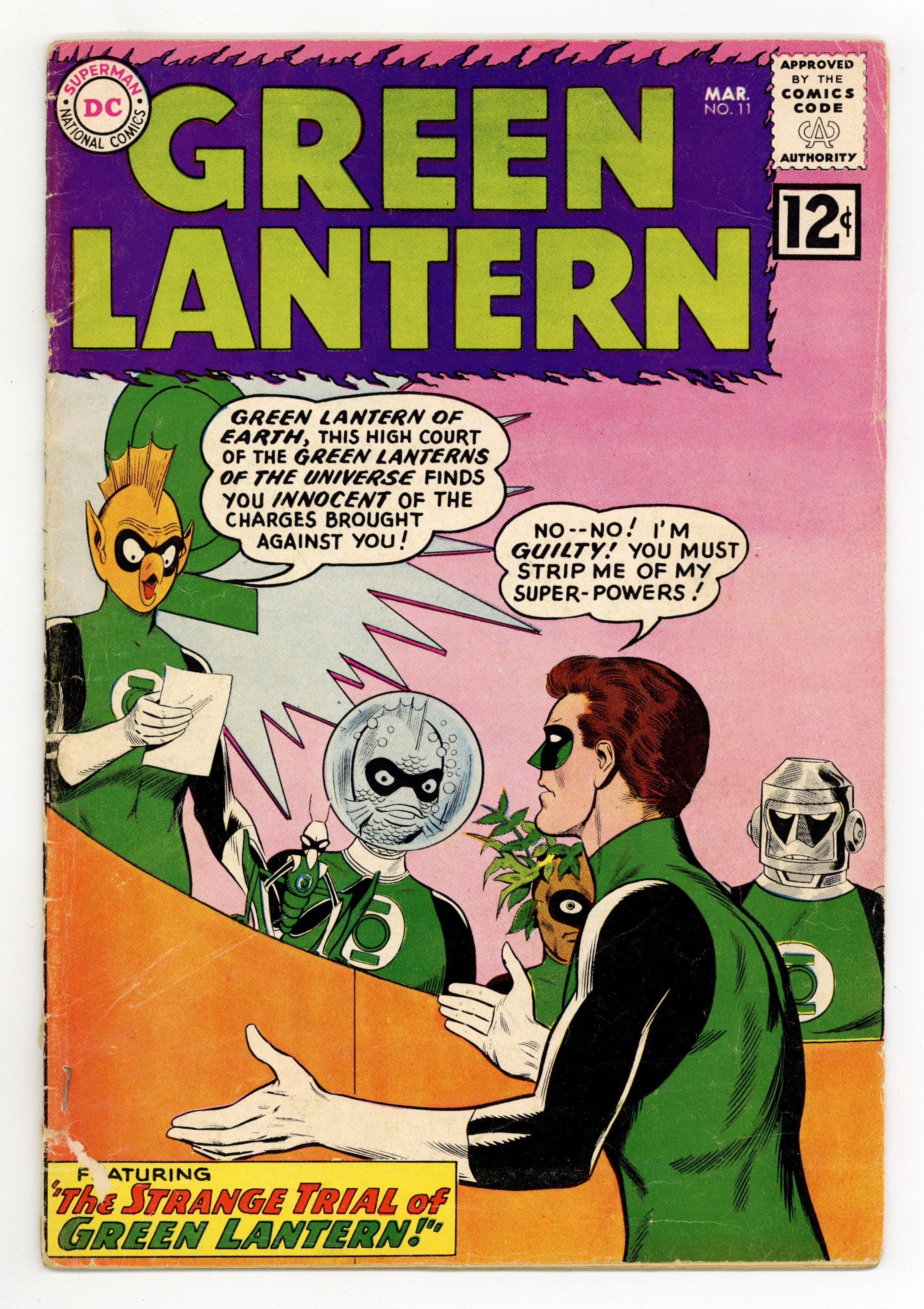 Starts Dec 8 Cover pencils by Gil Kane, inks by Joe Giella. The Strange Trial of Green Lantern!, script by John Broome, pencils by Gil Kane, inks by Joe Giella; Sinestro tries to mind control Hal Jordan. Hal's behavior gets him called before the Green Lantern Corps. Trail of the Missing Power Ring!, script by John Broome, pencils by Gil Kane, inks by Joe Giella; Hal Jordan loses his power ring and it's found by a child. Letter to the editor from comic artist Joe Staton. 36 pgs. $0.12. Cover price $0.12.