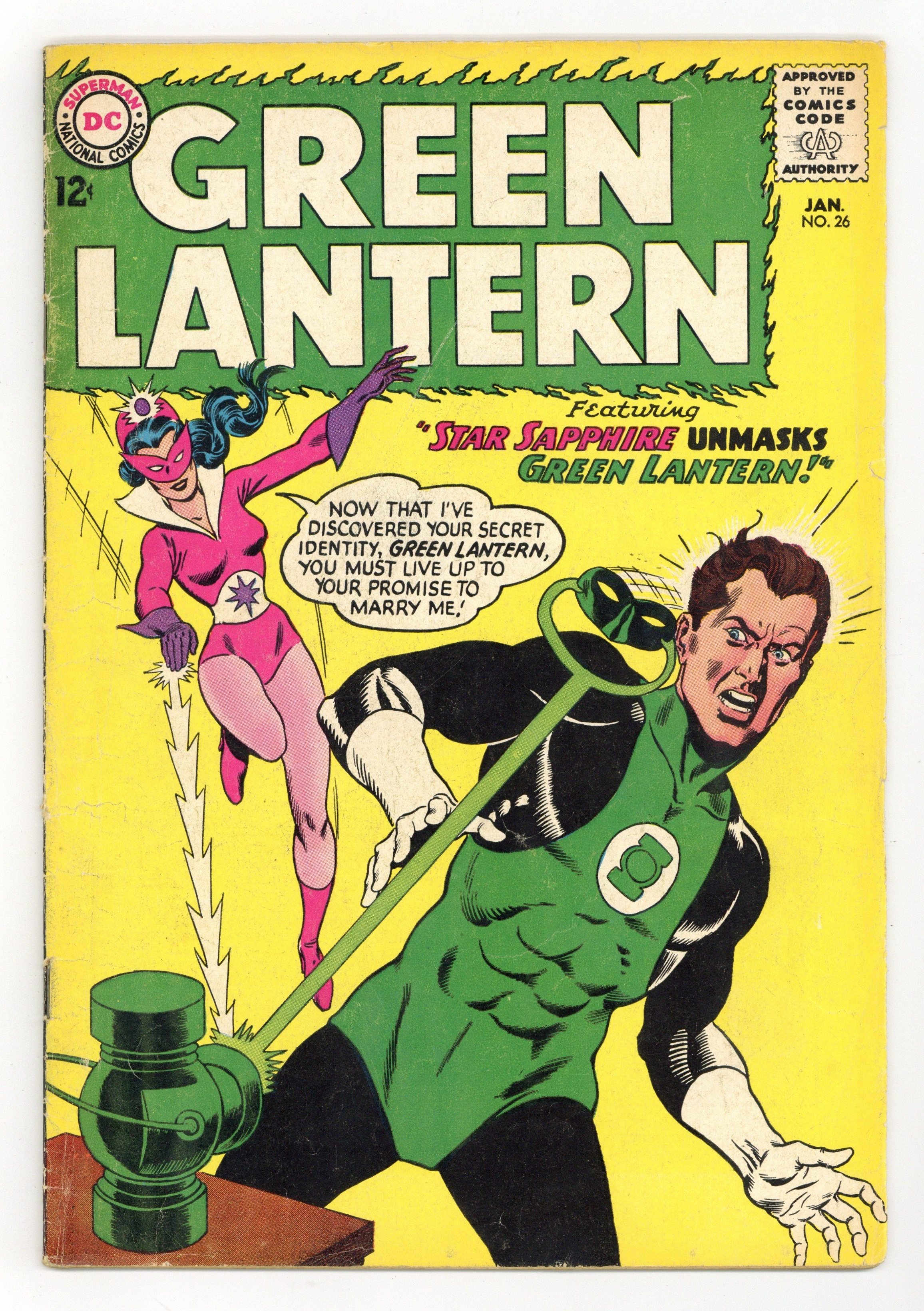 Cover pencils by Gil Kane, inks by Joe Giella. You Get What You Vote For! public service announcement starring Buzzy, script by Jack Schiff, art by Win Mortimer. Star Sapphire Unmasks Green Lantern!, script by Gardner Fox, pencils by Gil Kane, inks by Joe Giella; Carol Ferris becomes Star Sapphire again and engages Hal Jordan in a contest to prove who is superior. Hal Jordan loses and is unmasked by Star Sapphire, but accidently causes her to change back to Carol Ferris and forget the entire adventure. World Within the Power Ring!, script by Gardner Fox, pencils by Gil Kane, inks by Joe Giella; Imprisoned inside the Green Lantern ring by Abin Sur, Myrwhydden has regained his magical powers after Abin Sur's death and Hal Jordan enters the ring to defeat him and leave him re-imprisoned within the ring. Meteorites! fact half-page by Julius Schwartz. 36 pgs. $0.12. Cover price $0.12.