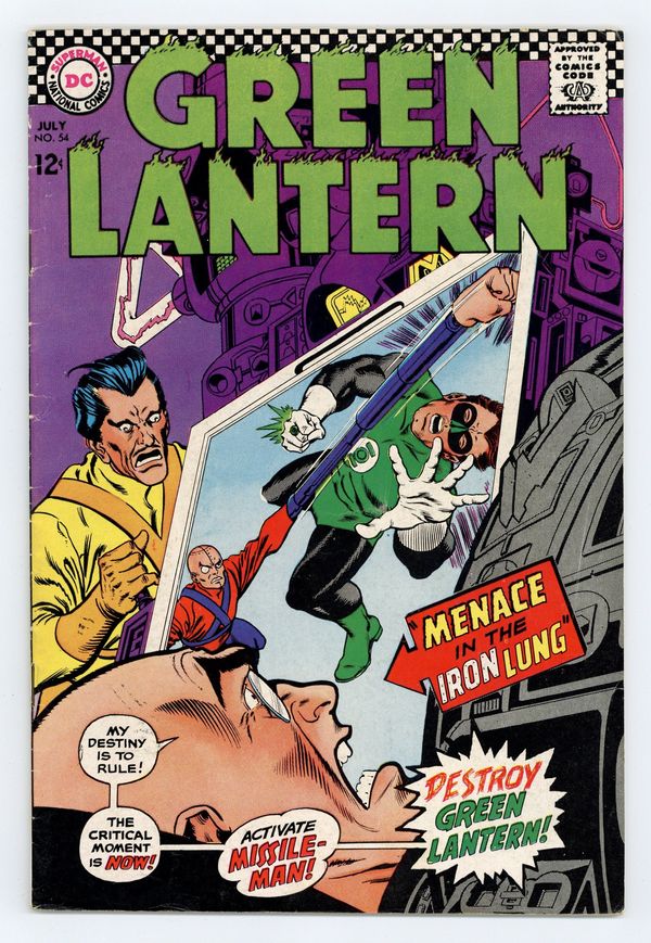 Tags: Green Lantern$16.50Cover pencils by Gil Kane, inks by Murphy Anderson. Menace in the Iron Lung, script by John Broome, art by Gil Kane; Baron Tyrano discovers a way to separate Green Lantern and Hal Jordan into two separate people, and they can only beat the villain by re-uniting themselves. The House the Joker Built ad for Batman. Letter to the editor from comic writer Marv Wolfman ("Martin").36 pgs., full color. $0.12. Cover price $0.12.