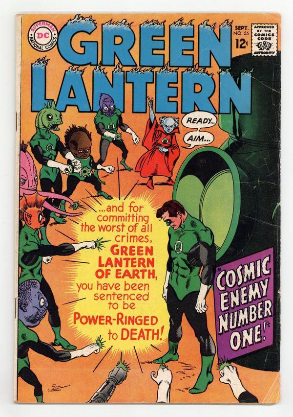 Tags: Green Lantern$21.50Cover pencils by Gil Kane, inks by Murphy Anderson. Cosmic Enemy Number One, script by John Broome, art by Gil Kane; The murder of a television actor playing Green Lantern connects to an intergalactic plot against the GL Corps masterminded by Earth criminal Al Magone, once captured by Abin Sur and imprisoned on a remote planet by the Guardians; Several Green Lanterns are killed and the rest fight for their lives against other villains freed by Magone. Cap's Hobby Hints by Henry Boltinoff. 36 pgs., full color. $0.12. Cover price $0.12.