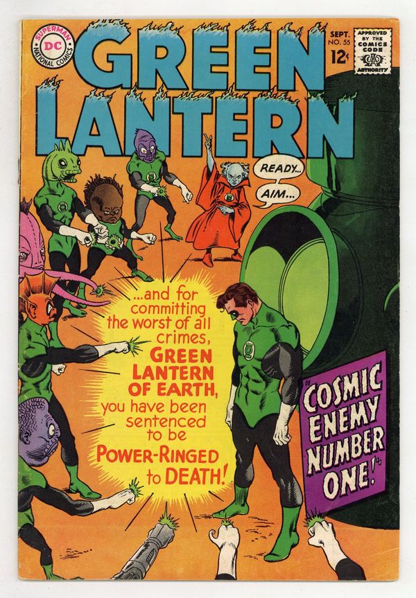 Cover pencils by Gil Kane, inks by Murphy Anderson. Cosmic Enemy Number One, script by John Broome, art by Gil Kane; The murder of a television actor playing Green Lantern connects to an intergalactic plot against the GL Corps masterminded by Earth criminal Al Magone, once captured by Abin Sur and imprisoned on a remote planet by the Guardians; Several Green Lanterns are killed and the rest fight for their lives against other villains freed by Magone. Cap's Hobby Hints by Henry Boltinoff. 36 pgs., full color. $0.12. Cover price $0.12.