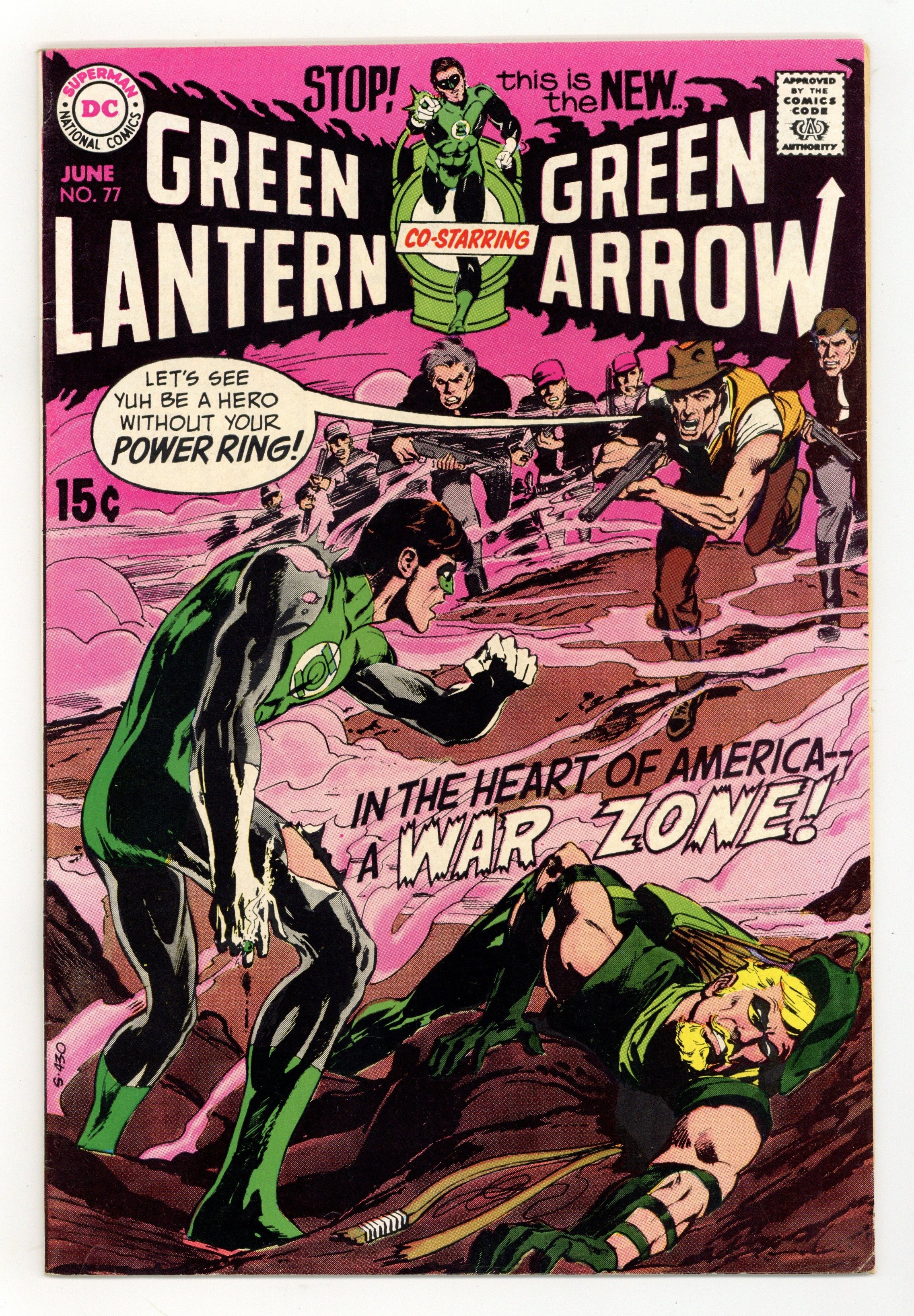 Cover art by Neal Adams. Journey to Desolation, script by Denny O'Neil, pencils by Neal Adams, inks by Frank Giacoia; Green Lantern, Green Arrow, and the Old-Timer come across the company town of Desolation, where the boss Slapper Soames plans to execute Johnny Walden to silence the songs he sings which have inspired the people of Desolation to think about a better way of life; As Green Lantern joins the townspeople in attacking Soames' stronghold, the Guardians inform him that since he is on a leave of absence they have reduced the power of his ring; But even weakened, Green Lantern and Green Arrow are able to free Johnny and turn Soames and his men over to the authorities. Letters to the editor from comic writers Don McGregor and Mike Barr. 36 pgs. $0.15. Cover price $0.15.