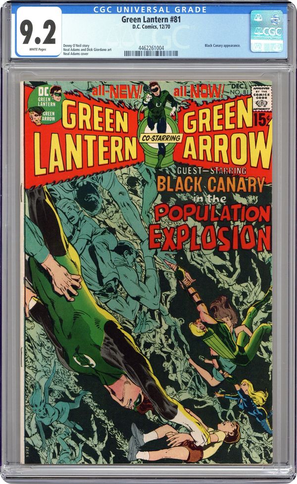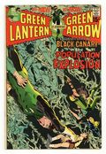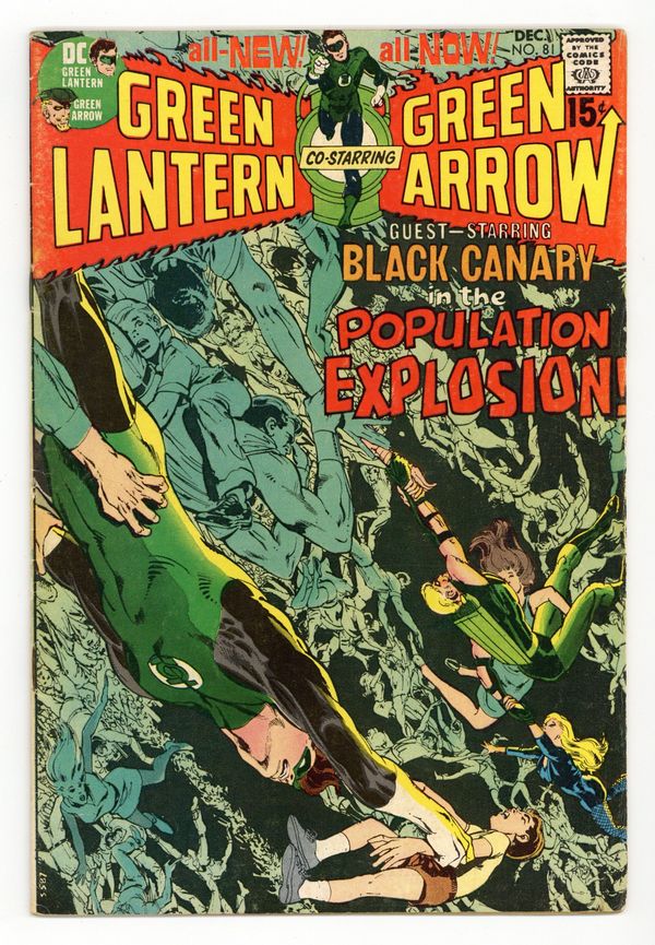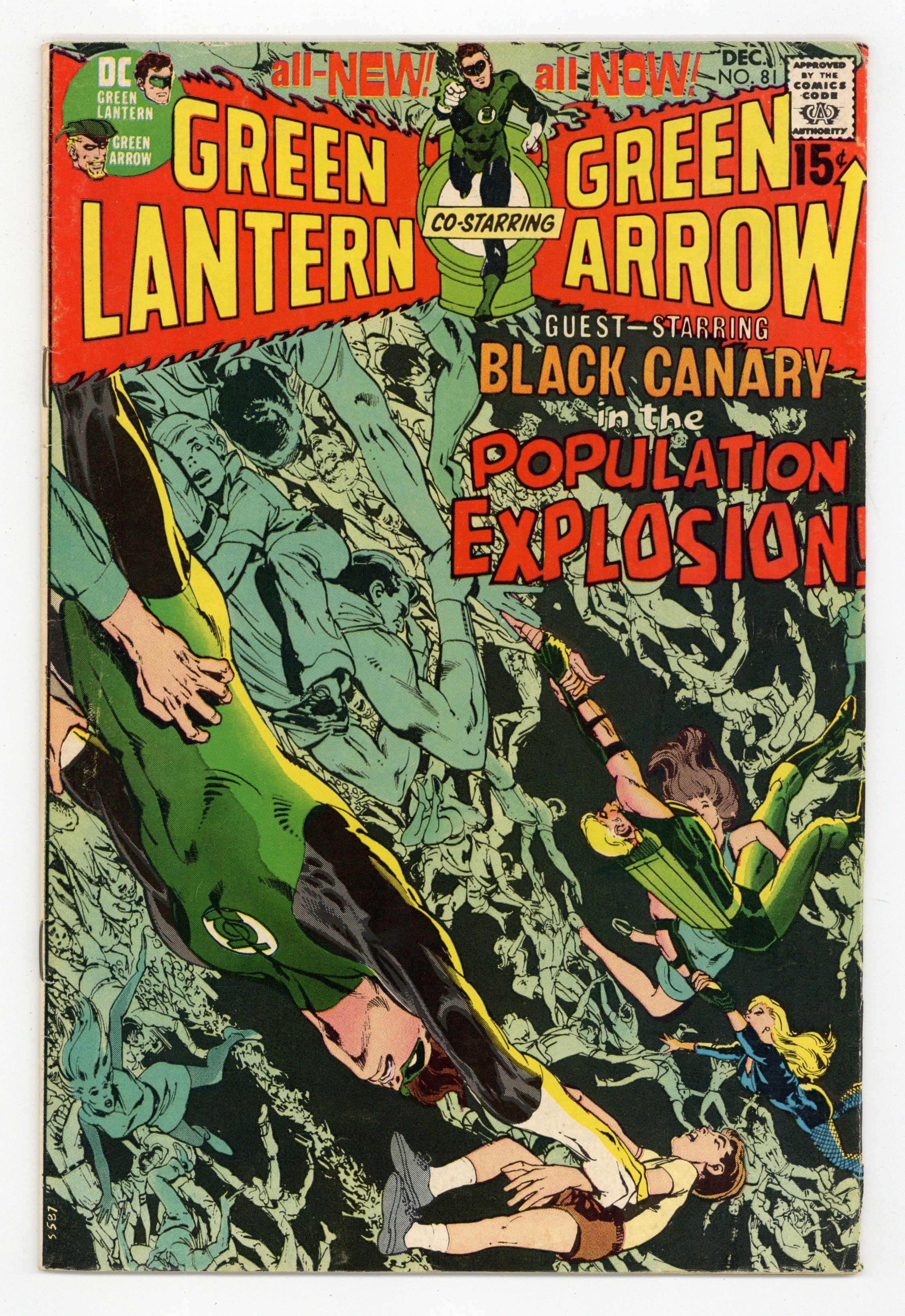 Cover art by Neal Adams. Death Be My Destiny!, script by Denny O'Neil, pencils by Neal Adams, inks by Dick Giordano; Green Lantern and Green Arrow, now joined by Black Canary, travel to Oa and find that Old-Timer has been found guilty by the Tribune; The Guardians strip him of his immortality and sentence him to live out his days on the planet Maltus; The heroes go with him into his exile and discover a planet wildly over-populated due to the efforts of Mother Juna. After they put a stop to her work, the Old-Timer vows to restore balance to Maltus. 36 pgs. $0.15. Cover price $0.15.