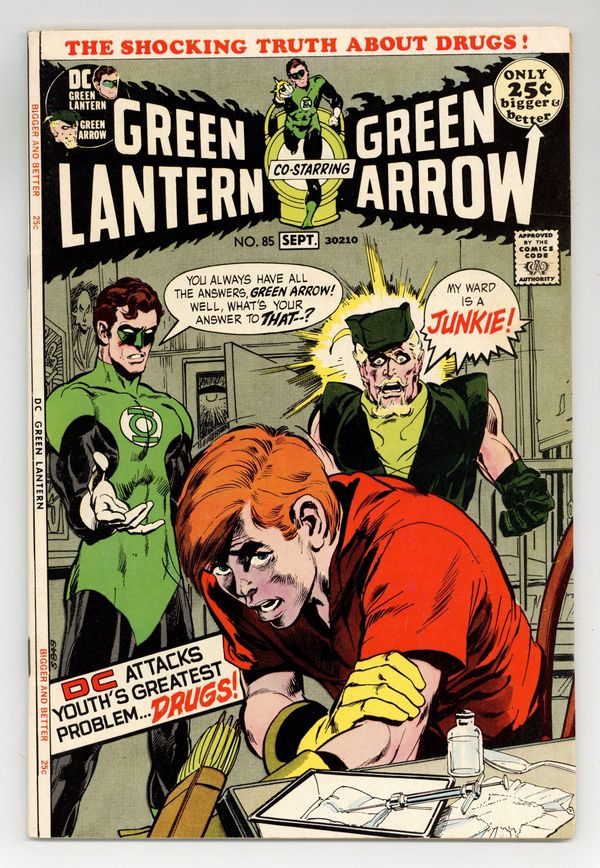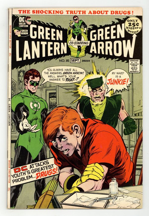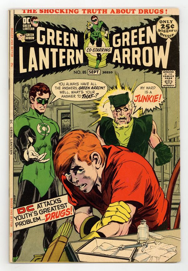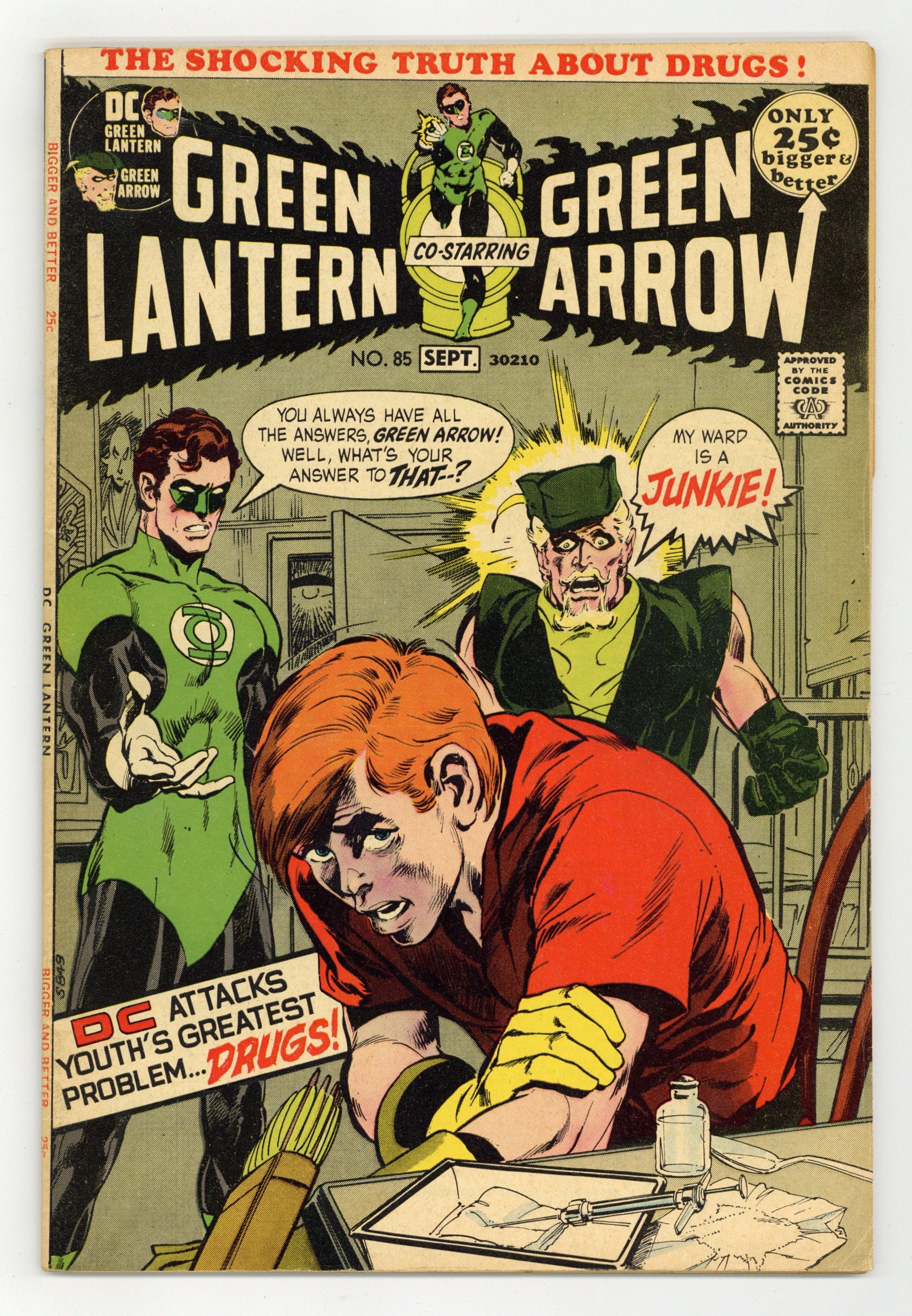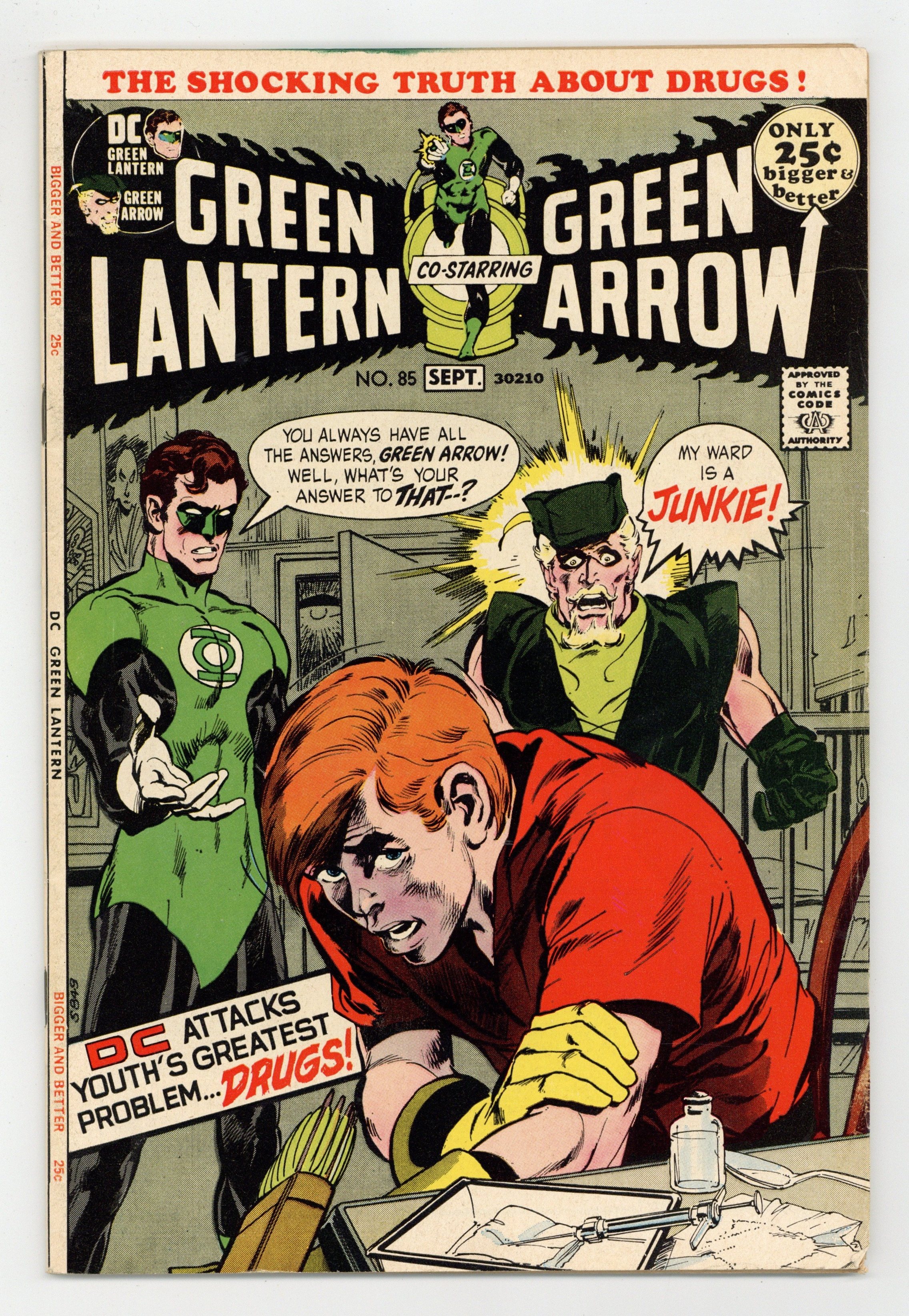 Giant-size issue. Cover art by Neal Adams. Snowbirds Don't Fly, script by Denny O'Neil, art by Neal Adams; When Oliver is jumped by junkies, he is shocked when one of them shoots him with one of his own arrows; Green Arrow, now teamed with Green Lantern, follows the leads to find the junkies, including the missing Roy Harper, who lets GA assume he has been working undercover; Later, the junkies lead the heroes to an airplane hangar, but help the dealers knock out GL and GA and inject them with drugs. Roy arrives in time to get the messed up duo home; There he tries to explain the attraction of doing drugs, but Green Arrow remains baffled, and is shocked to soon find Roy getting ready to shoot up. The Strange Trial of Green Lantern, script by John Broome, pencils by Gil Kane, inks by Joe Giella; Sinestro tries to mind control Hal Jordan; Hal's behavior gets him called before the Green Lantern Corps. 52 pgs. $0.25. Cover price $0.25.