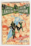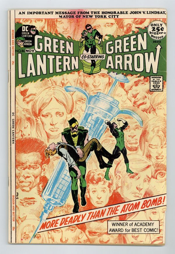 Giant-size issue. Cover by Neal Adams. Green Arrow co-stars in this famous anti-drug issue. They Say It'll Kill Me... But They Won't Say When!, script by Denny O'Neil, pencils by Neal Adams, inks by Dick Giordano; Having discovered that Roy is a junkie, Green Arrow sets out to bring the drug traffickers down; Green Lantern returns to Oliver's building and finds Roy curled up in the basement; He takes Roy to Dinah's to straighten out and heads out to find Green Arrow, who has been knocked out by the drug dealers and tossed into the harbor to drown; GA escapes just as GL arrives to take out the goons who threw him into the water; Together the two trace the drugs to pharmaceutical magnate Salomon Hooper and put him out of business; But Roy explains that drugs are not the root problem, just a symptom of it. Anti-drug message from John V. Lindsay, mayor of New York City (1966-1973), thanking DC Comics for publishing the Green Lantern story in this and the previous issue. Reprint story: The Icicle Goes South! (from All-American Comics 92, December 1947), script by Robert Kanigher, art by Alex Toth; Green Lantern must stop the Icicle, who is helping a dictator to take over the South American country of Perumbia. 52 pgs., full color. $0.25. Cover price $0.25.