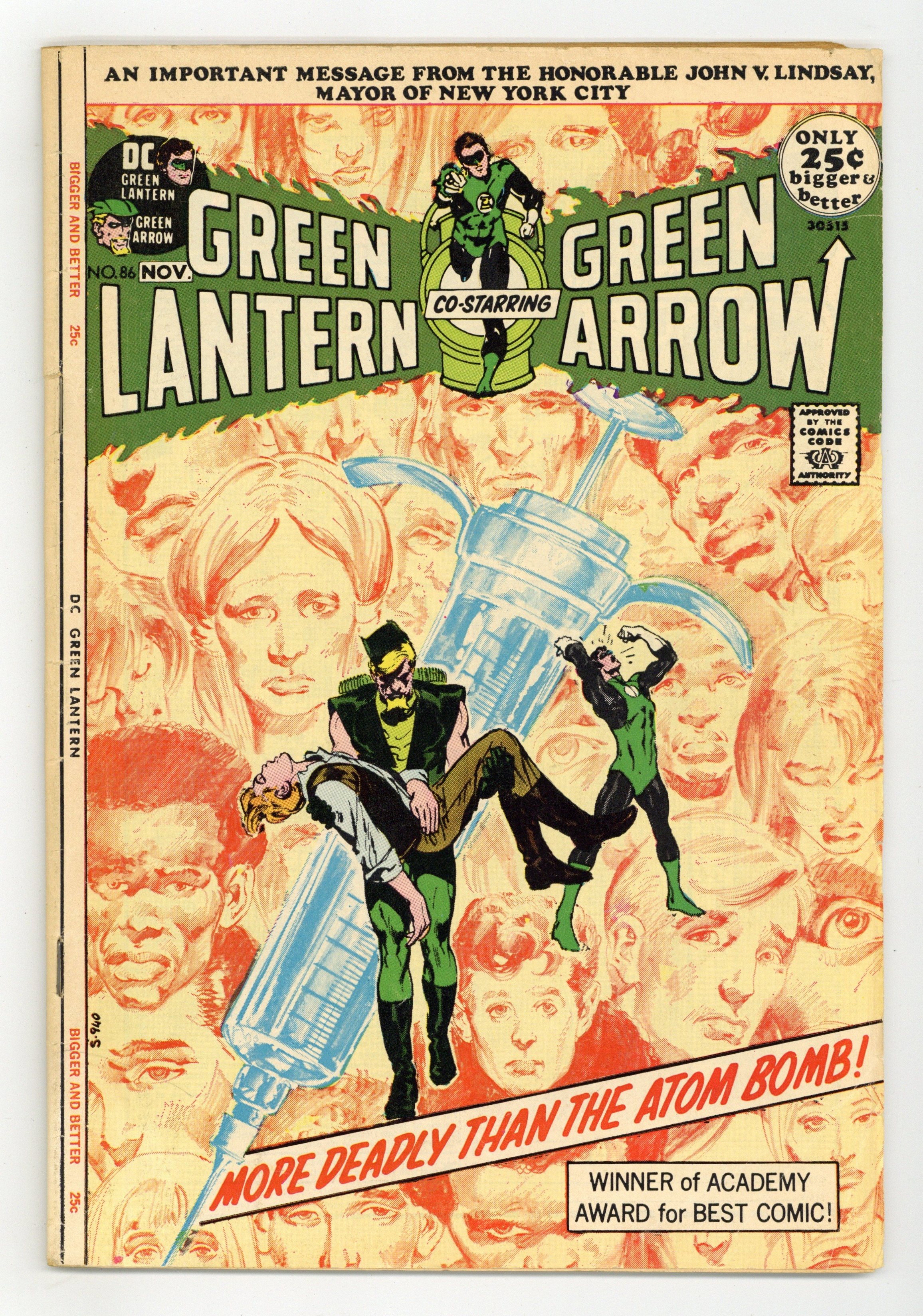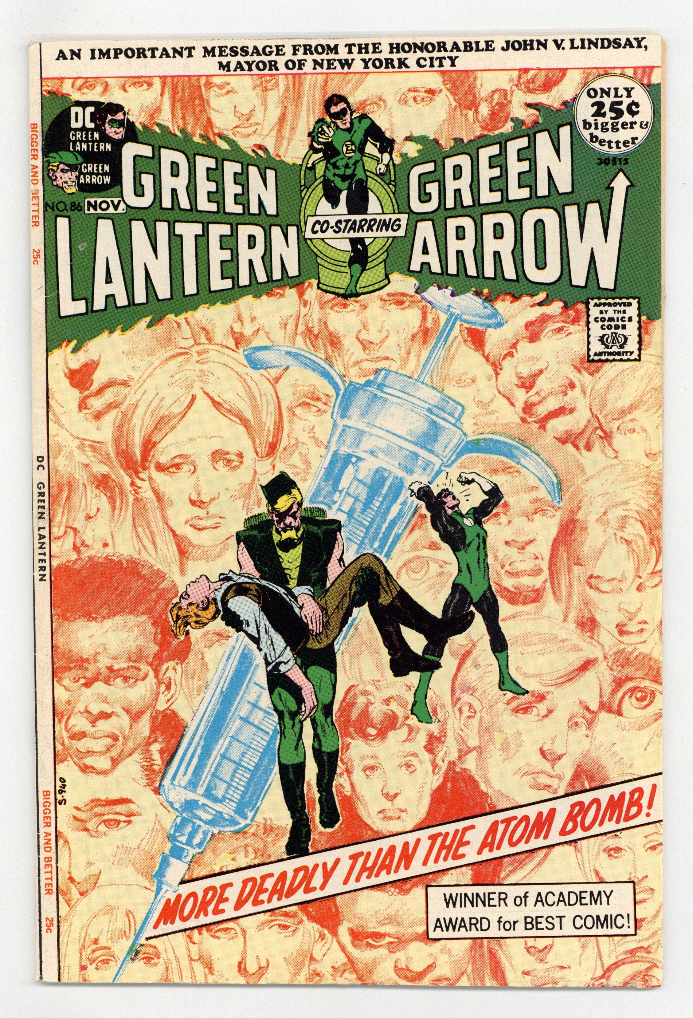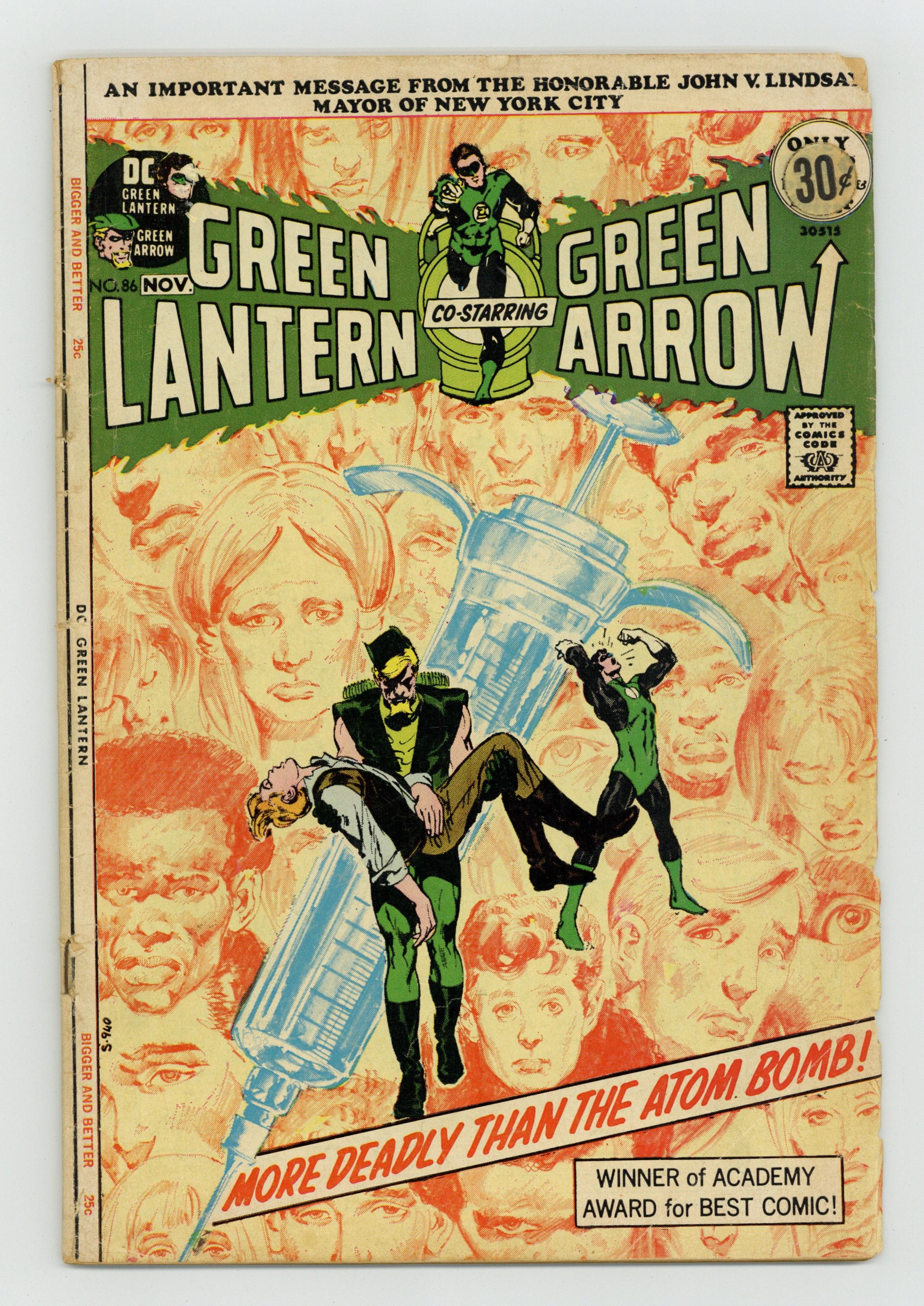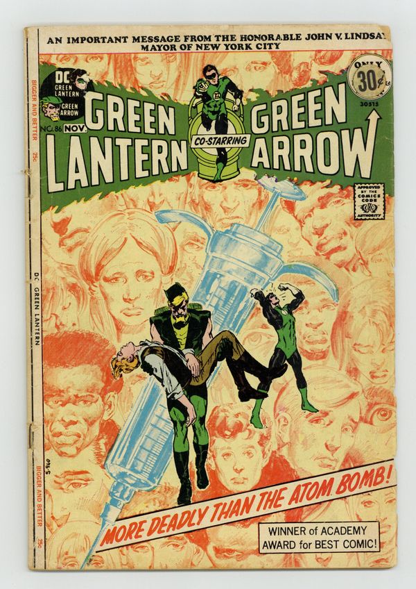Starts Dec 15 Giant-size issue. Cover by Neal Adams. Green Arrow co-stars in this famous anti-drug issue. They Say It'll Kill Me... But They Won't Say When!, script by Denny O'Neil, pencils by Neal Adams, inks by Dick Giordano; Having discovered that Roy is a junkie, Green Arrow sets out to bring the drug traffickers down; Green Lantern returns to Oliver's building and finds Roy curled up in the basement; He takes Roy to Dinah's to straighten out and heads out to find Green Arrow, who has been knocked out by the drug dealers and tossed into the harbor to drown; GA escapes just as GL arrives to take out the goons who threw him into the water; Together the two trace the drugs to pharmaceutical magnate Salomon Hooper and put him out of business; But Roy explains that drugs are not the root problem, just a symptom of it. Anti-drug message from John V. Lindsay, mayor of New York City (1966-1973), thanking DC Comics for publishing the Green Lantern story in this and the previous issue. Reprint story: The Icicle Goes South! (from All-American Comics 92, December 1947), script by Robert Kanigher, art by Alex Toth; Green Lantern must stop the Icicle, who is helping a dictator to take over the South American country of Perumbia. 52 pgs., full color. $0.25. Cover price $0.25.