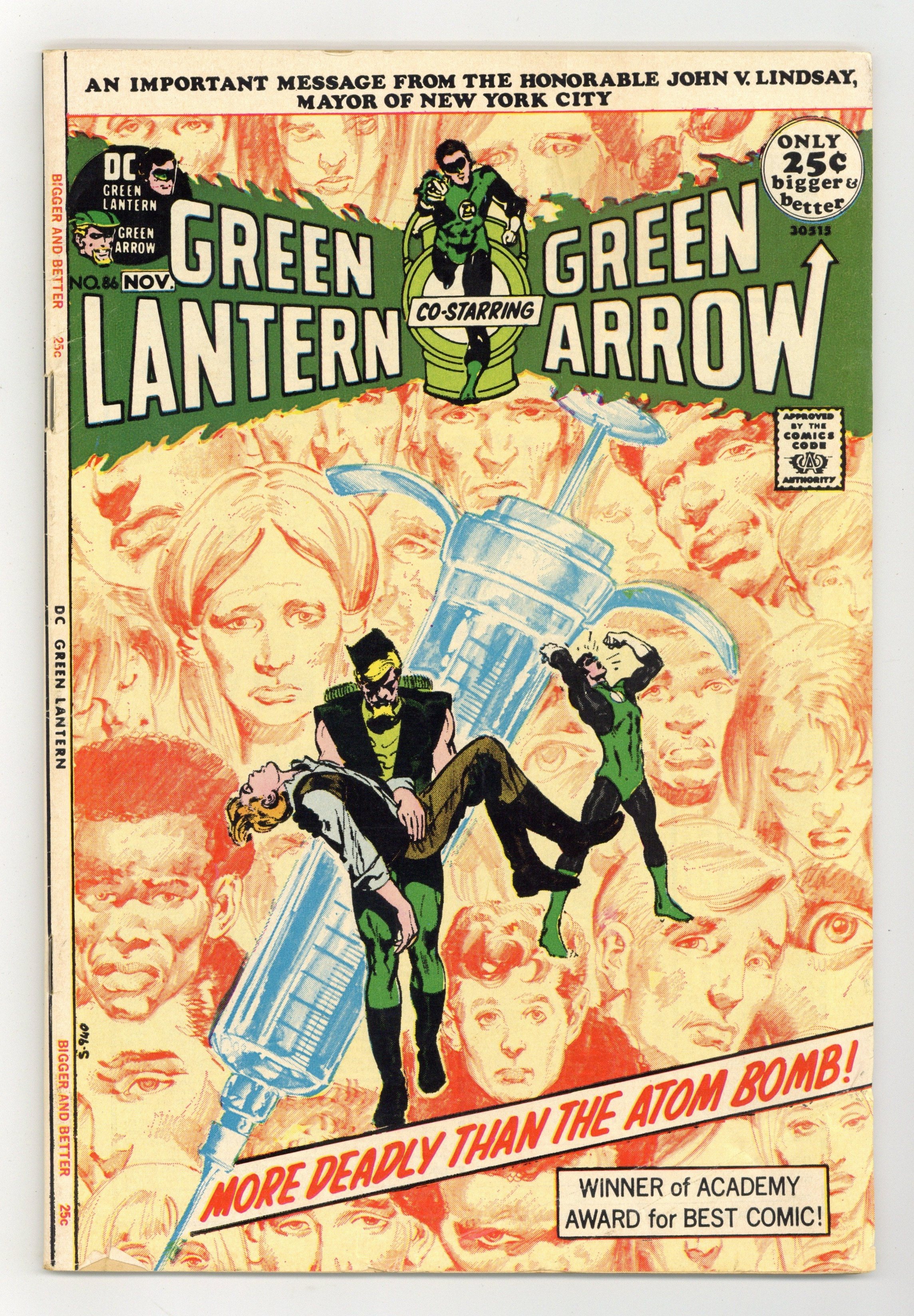 Starts Apr 4 Giant-size issue. Cover by Neal Adams. Green Arrow co-stars in this famous anti-drug issue. They Say It'll Kill Me... But They Won't Say When!, script by Denny O'Neil, pencils by Neal Adams, inks by Dick Giordano; Having discovered that Roy is a junkie, Green Arrow sets out to bring the drug traffickers down; Green Lantern returns to Oliver's building and finds Roy curled up in the basement; He takes Roy to Dinah's to straighten out and heads out to find Green Arrow, who has been knocked out by the drug dealers and tossed into the harbor to drown; GA escapes just as GL arrives to take out the goons who threw him into the water; Together the two trace the drugs to pharmaceutical magnate Salomon Hooper and put him out of business; But Roy explains that drugs are not the root problem, just a symptom of it. Anti-drug message from John V. Lindsay, mayor of New York City (1966-1973), thanking DC Comics for publishing the Green Lantern story in this and the previous issue. Reprint story: The Icicle Goes South! (from All-American Comics 92, December 1947), script by Robert Kanigher, art by Alex Toth; Green Lantern must stop the Icicle, who is helping a dictator to take over the South American country of Perumbia. 52 pgs., full color. $0.25. Cover price $0.25.