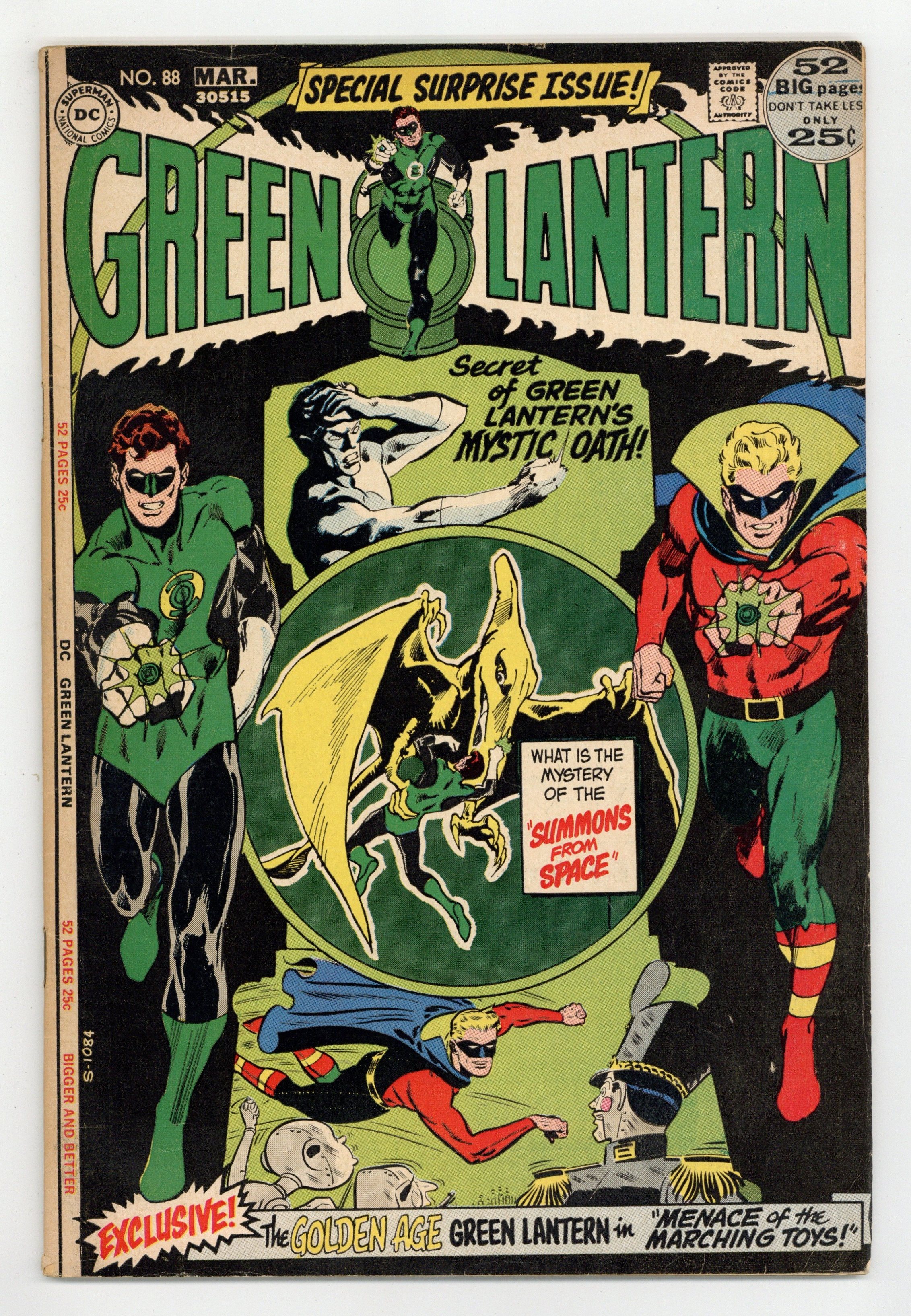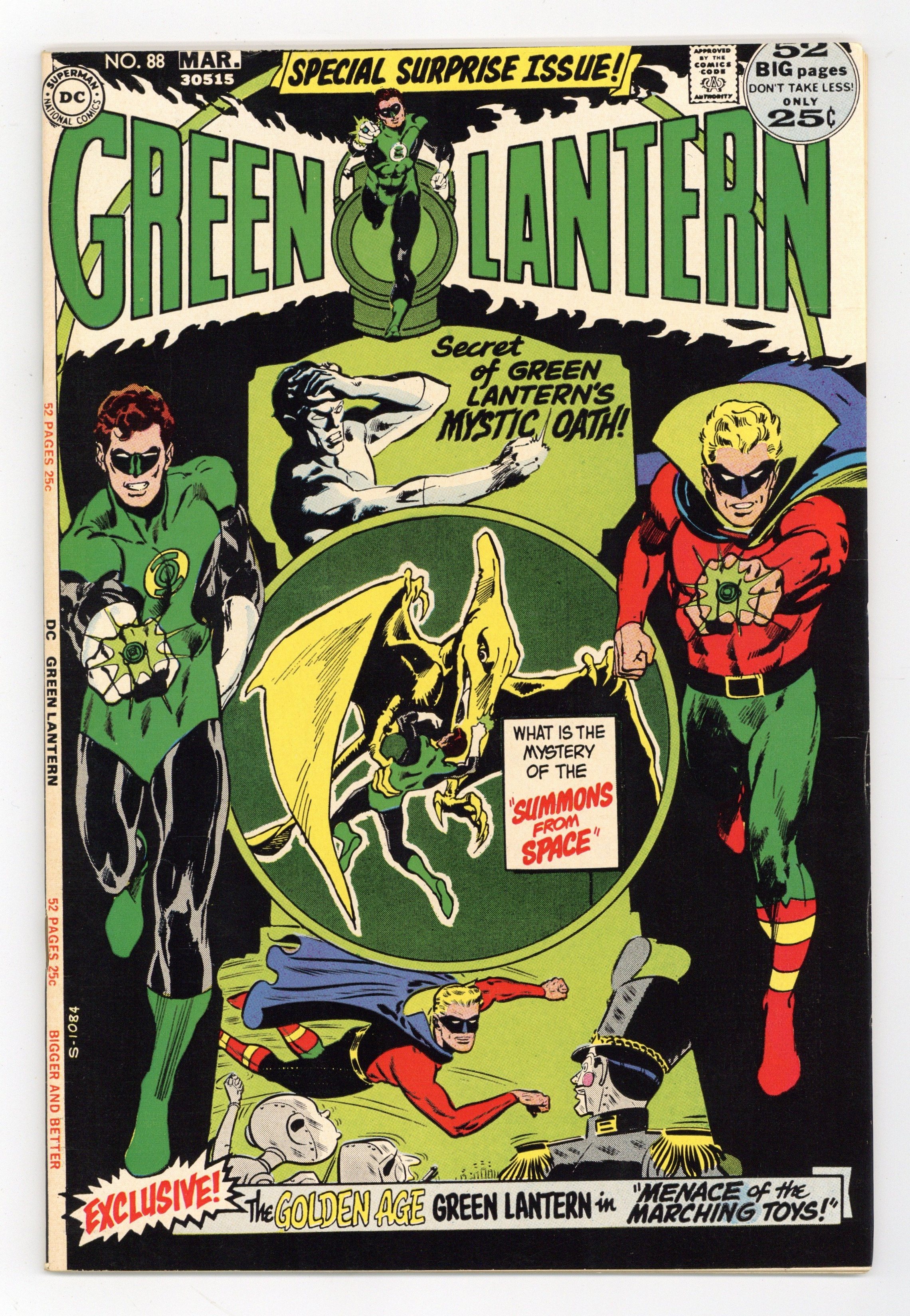 Giant-size issue. Neal Adams cover and one interior page (the pencilled version of the cover of Green Lantern 89). The rest of the issue contains reprints: "Summons From Space!" with script by John Broome, pencils by Gil Kane, inks by Joe Giella (from Showcase 23); "The Origin of Green Lantern's Oath!" with script by Broome, pencils by Kane, inks by Murphy Anderson; and the Golden Age Green Lantern in "The Menace of the Marching Toys!" with pencils by Carmine Infantino, inks by Bernard Sachs (from a 1949 issue of the original Green Lantern series). Letter to the editor from comic writer Martin Pasko and writer Dwight Decker. Cover price $0.25.