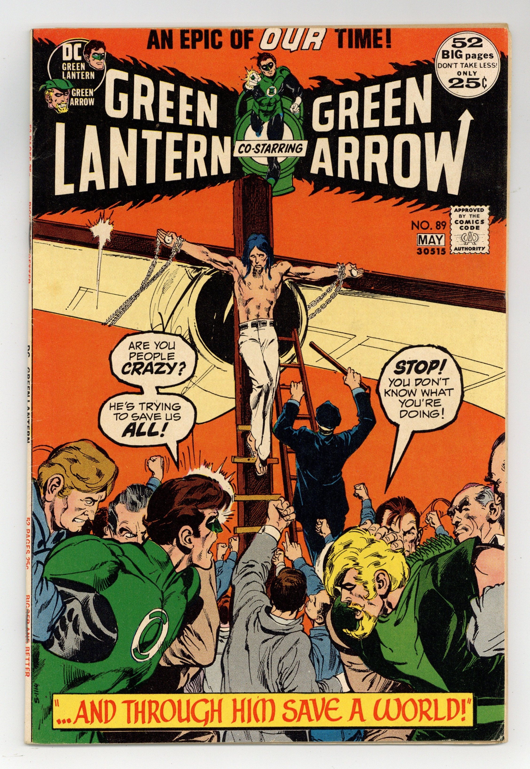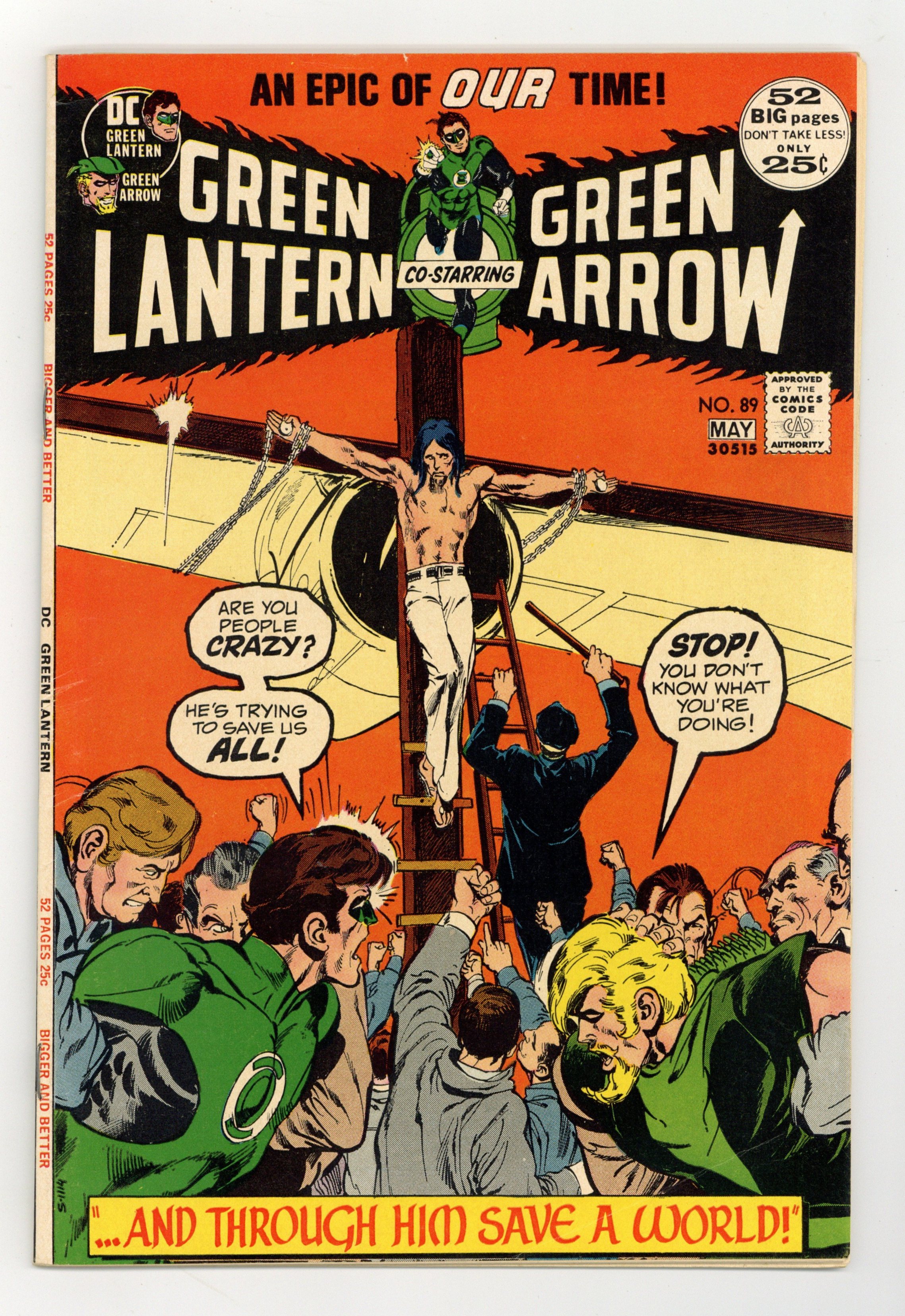 Giant-size issue. Cover by Neal Adams. ...And through Him Save a World..., script by Denny O'Neil, pencils by Neal Adams, inks by Neal Adams; Green Arrow goes with Green Lantern and Carol Ferris to the Ferris Aircraft plant in Abraham, which has been the target of ecological prankster Isaac; When Isaac accidentally threatens Carol, GL tries to take him into custody, but GA gases him. Reprint back-up story: the Golden Age Green Lantern stars in The Impossible Mr. Paradox! (from the original Green Lantern 38, May 1949), script by John Broome, art by Irwin Hasen; The cancellation of Clay Chalmers' program at Station WXYZ leads Alan Scott to believe Chalmers is the new criminal haunting Gotham City, Mr. Paradox, who attempts to defeat Green Lantern by employing illusions based on scientific paradoxes. Tarzan ad. 52 pgs., full color. $0.25. Cover price $0.25.