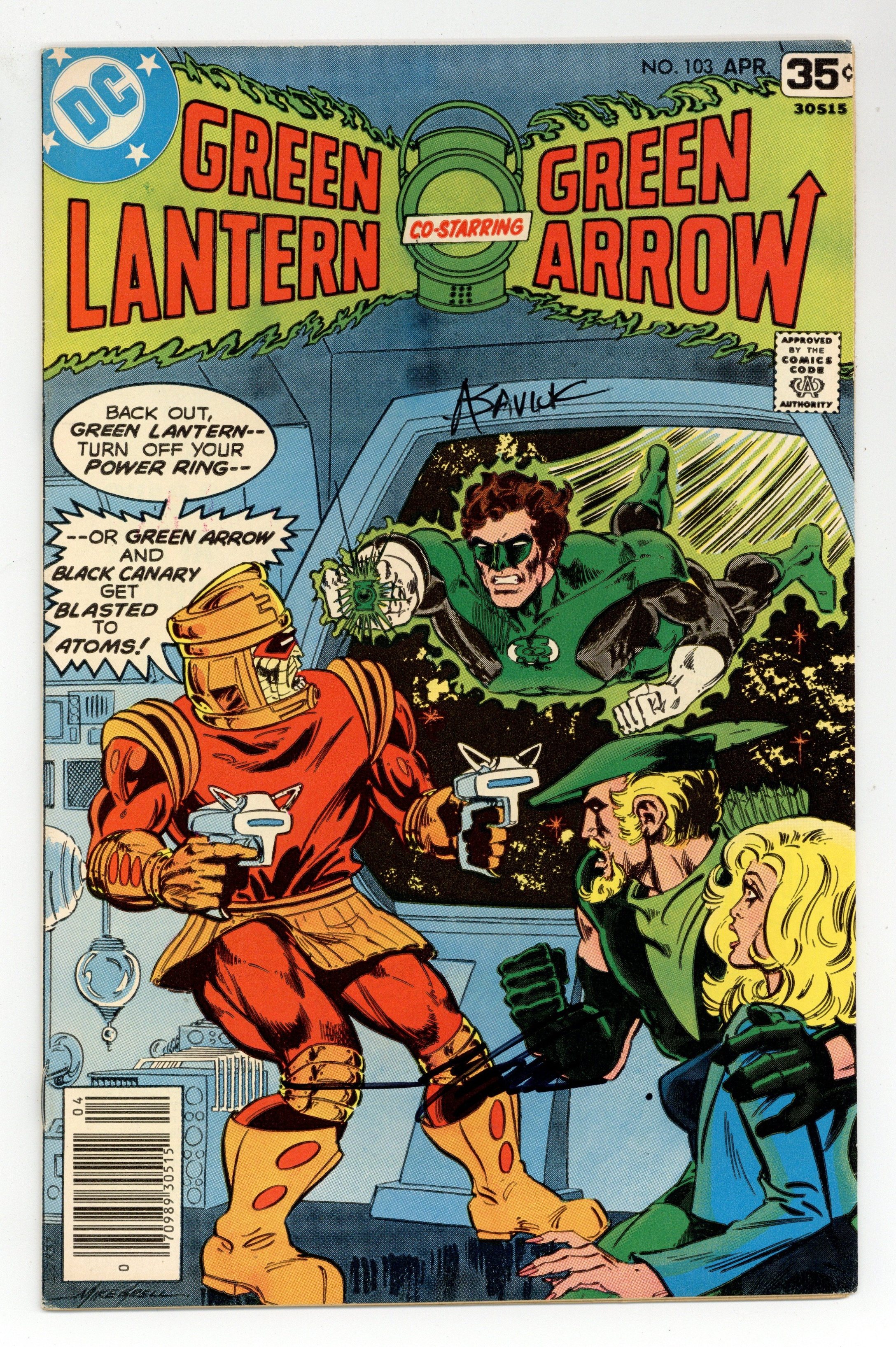 "Earth-Asylum." Guest-starring Black Canary. Taupin seeks U.N. Asylum while an alien policeman demands he be turned over to him, lest a ship of Earthlings die. Meanwhile, Green Lantern is in a null-time field. Guest appearance by Itty. Script by Denny O'Neil, pencils by Alex Saviuk, inks by David Hunt. Cover by Mike Grell. Cover price $0.35.