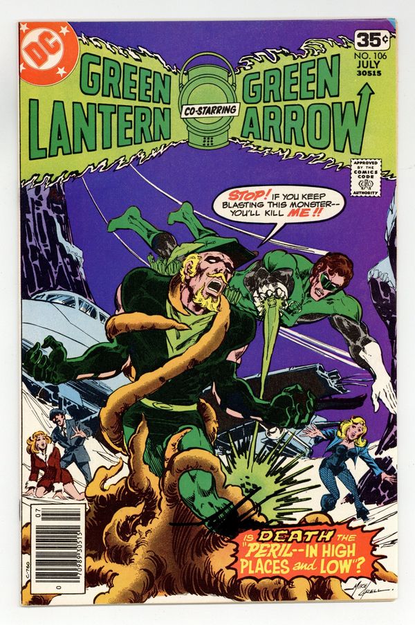 "Panic in High Places and Low." Guest-starring Black Canary, & Air Wave. While Green Lantern remains in jail in Modora for bringing back Sonar and violating airspace, Green Arrow, Black Canary, and Air Wave face Itty (GL's former pal, who has mutated) in the Arctic. Script by Denny O'Neil, pencils by Mike Grell, inks by Bruce Patterson. Cover by Grell. Cover price $0.35.