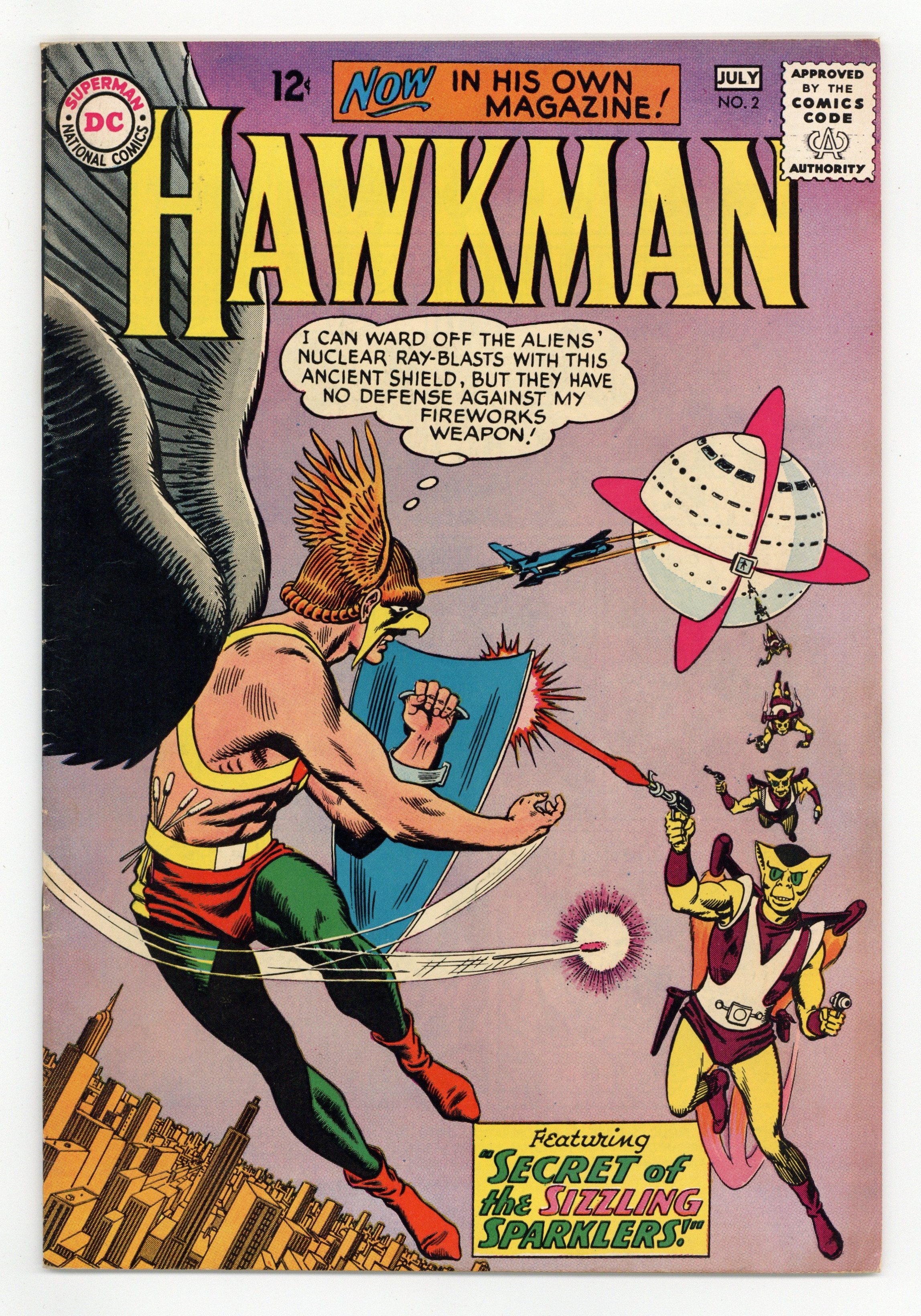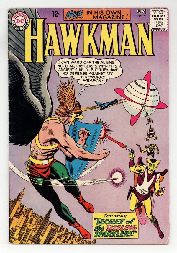$14.00Cover art by Murphy Anderson. Are You a Good Neighbor? public service announcement about littering, script by Jack Schiff, art by Sheldon Moldoff. Secret of the Sizzling Sparklers!, script by Gardner Fox, art by Murphy Anderson; Invading aliens called the Tralls attack the Hawks first because they know how dangerous the Thanagarians can be to their evil plans. House ad for Superboy Annual (DC, 1964 series) #1. House ad for the "New Look" Batman; includes cover art from Batman (DC, 1949 series) #164 and Detective Comics (DC, 1928 series) #327 (first issues under new editor Julius Schwartz). Letter from Bruce Lowry. Wings Across Time, script by Gardner Fox, art by Murphy Anderson; The wings of Icarus are discovered and exhibited in the Midway City Museum; When Hawkman's wings are damaged in an encounter with mobsters, he uses the historic pair. 36 pgs. $0.12. Cover price $0.12.