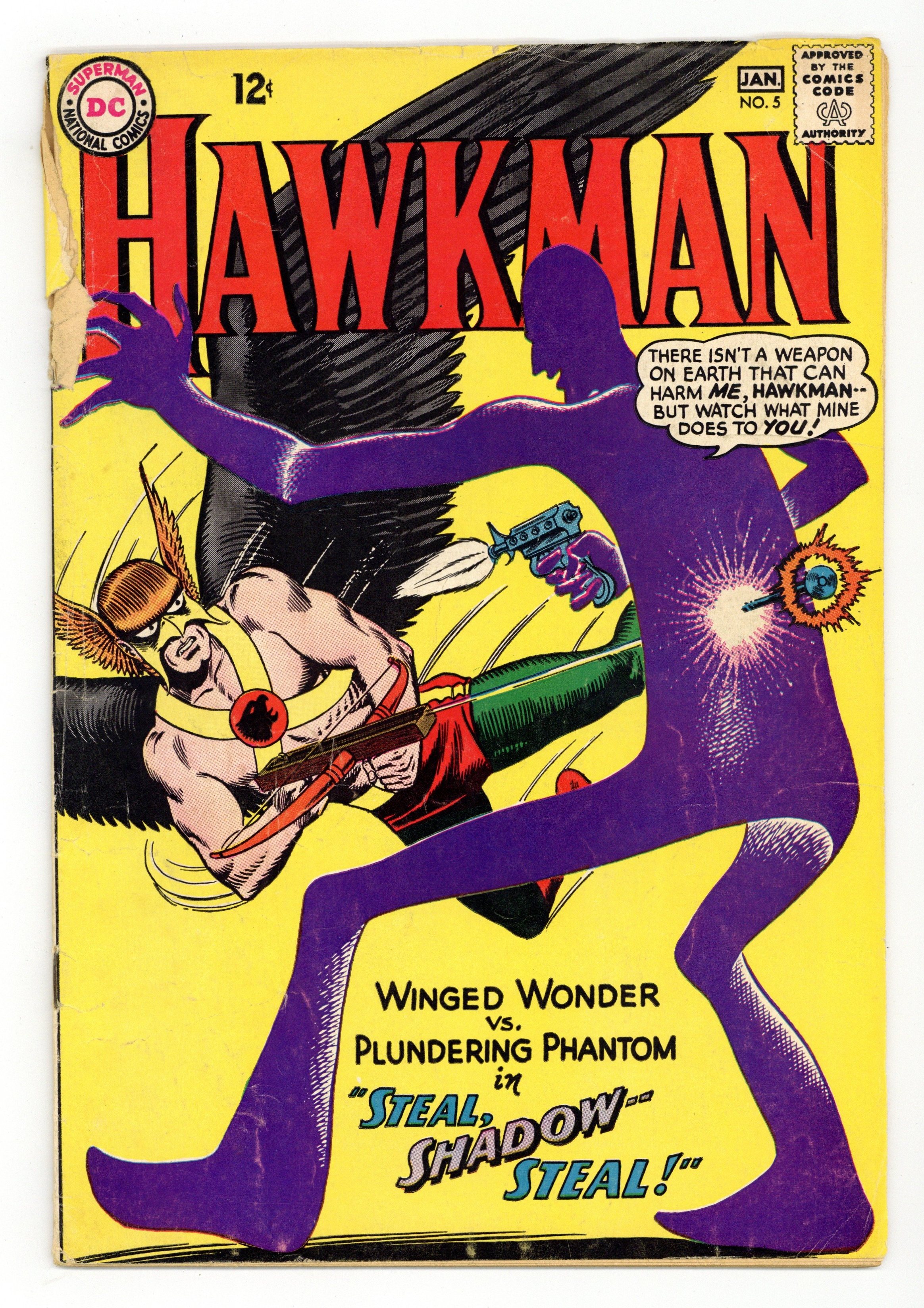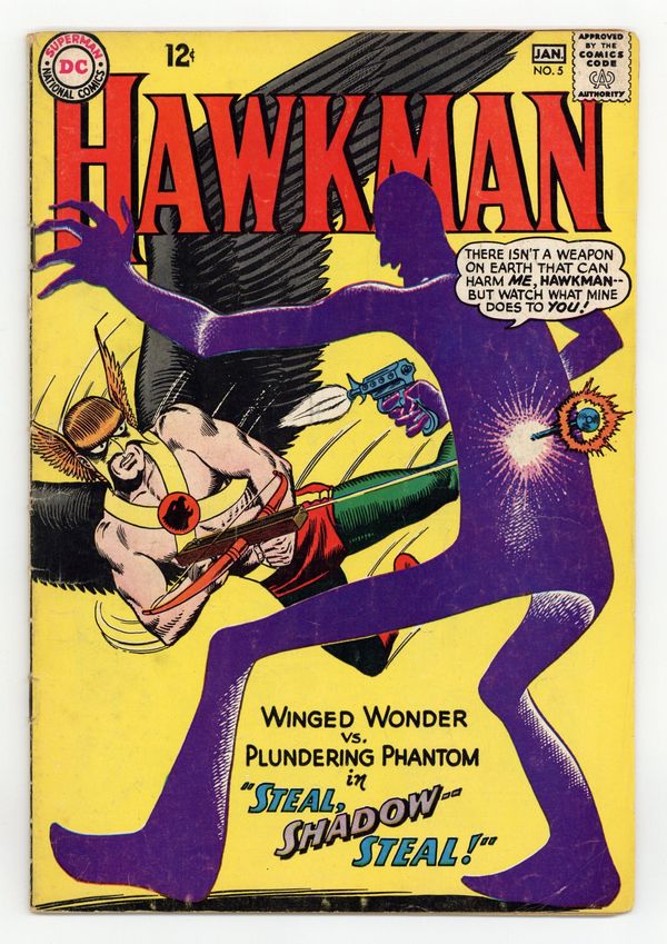 Cover art by Murphy Anderson. Steal, Shadow -- Steal!, script by Gardner Fox, art by Murphy Anderson; The Shadow-Thief returns for another crime spree, and uses his Dimensiometer to transform the Hawks into living shadows like him, but without the power to move. House ad for Batman 80 Page Giant (DC, 1964 series) #5 [Silver Anniversary Issue]. Hunting Hawks fact page by Julius Schwartz. House ad for The Brave and the Bold (DC, 1955 series) #57. Rocky and Bullwinkle star in a one-page Cheerios ad. 36 pgs. $0.12. Cover price $0.12.
