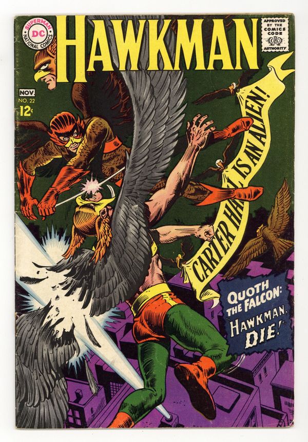 Cover pencils by Dick Dillin, inks by Chuck Cuidera. Quoth the Falcon, "Hawkman, Die", script by Bob Haney, pencils by Dick Dillin, inks by Chuck Cuidera; The Falcon thinks he has discovered Hawkman's identity as Carter Hall so he exposes Hall an as alien, believing that Hawkman will leave Midway City so that the Falcon can go on a crime spree; The Hawks return to foil his plans and Carter Hall admits to being an alien from Thanagar (though not to being Hawkman). House ad for World's Finest Comics (DC, 1941 series) #179, pencils by Curt Swan and Dick Sprang, inks by Stan Kaye. 36 pgs. $0.12. Cover price $0.12.