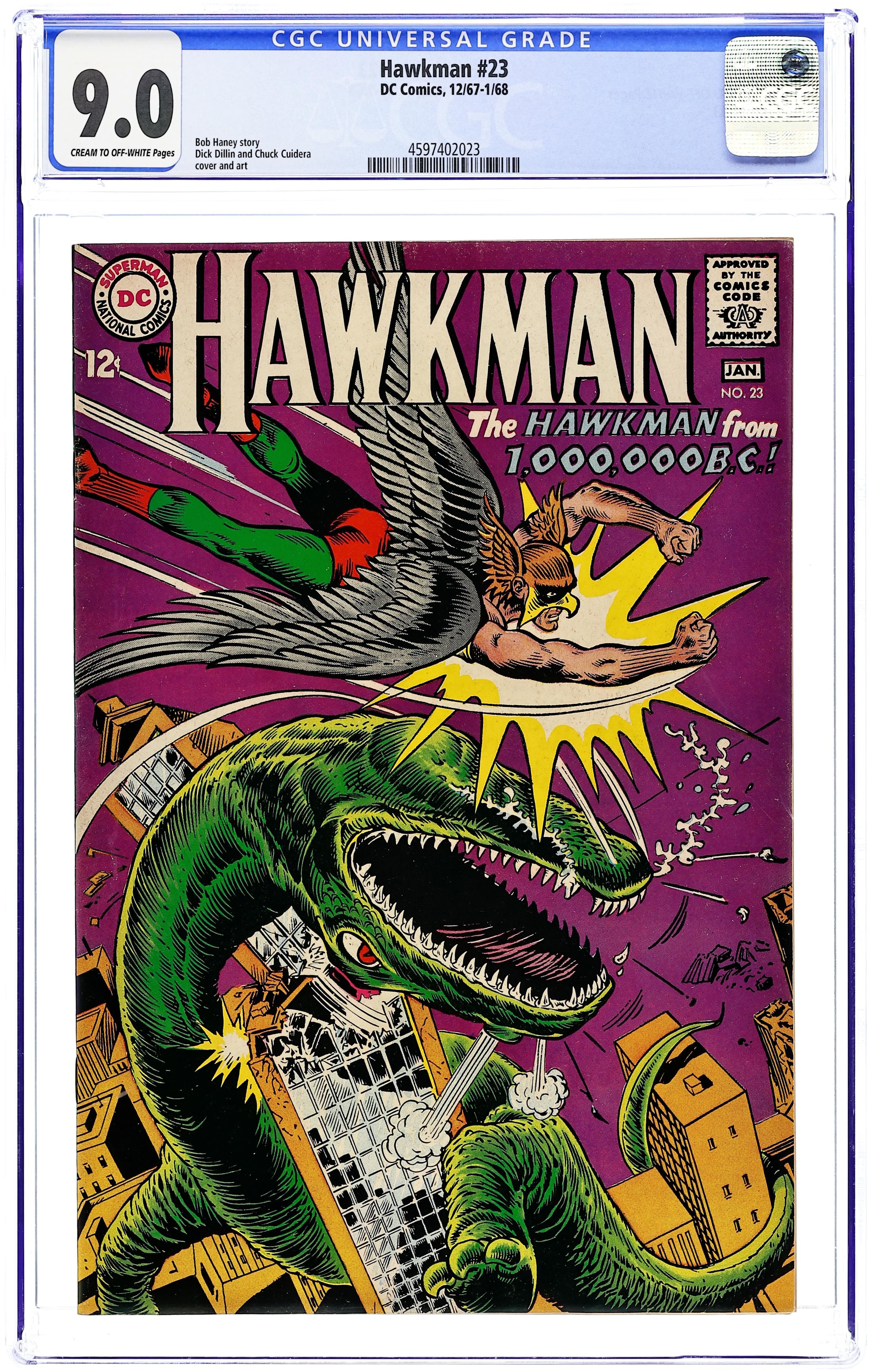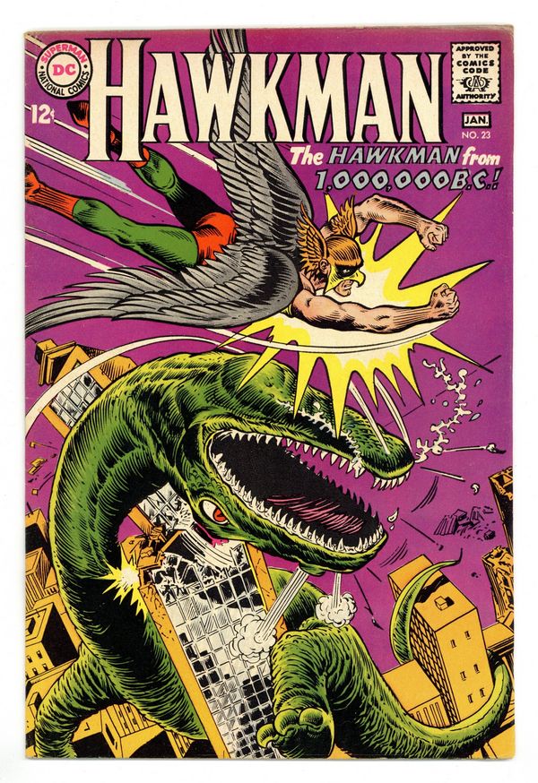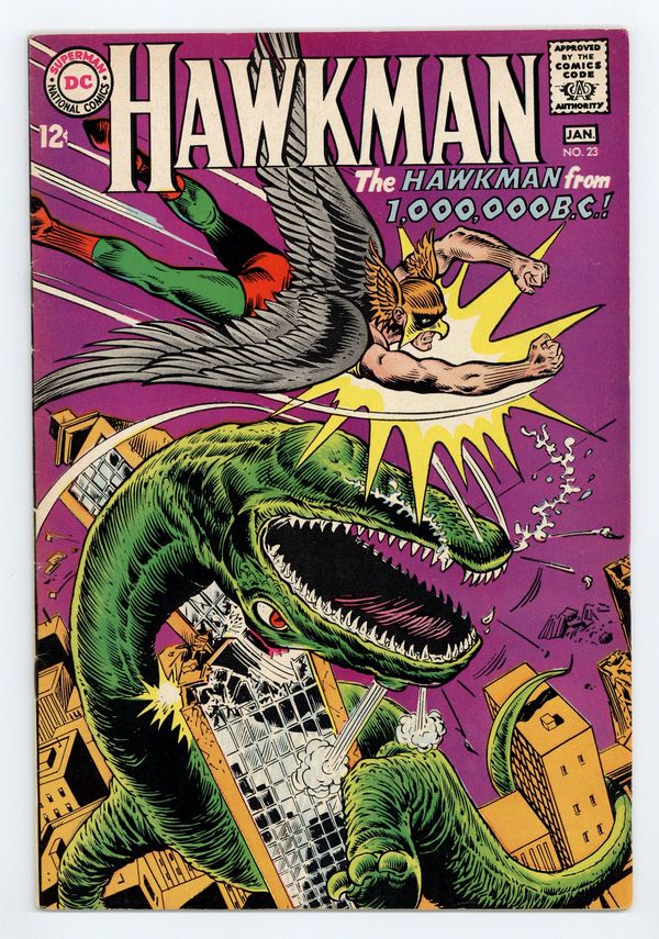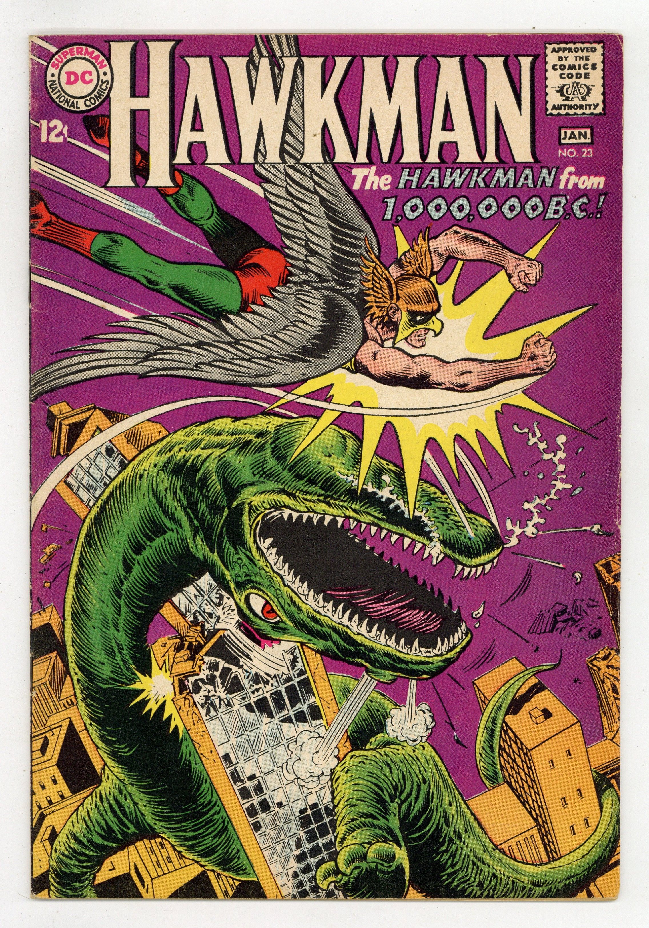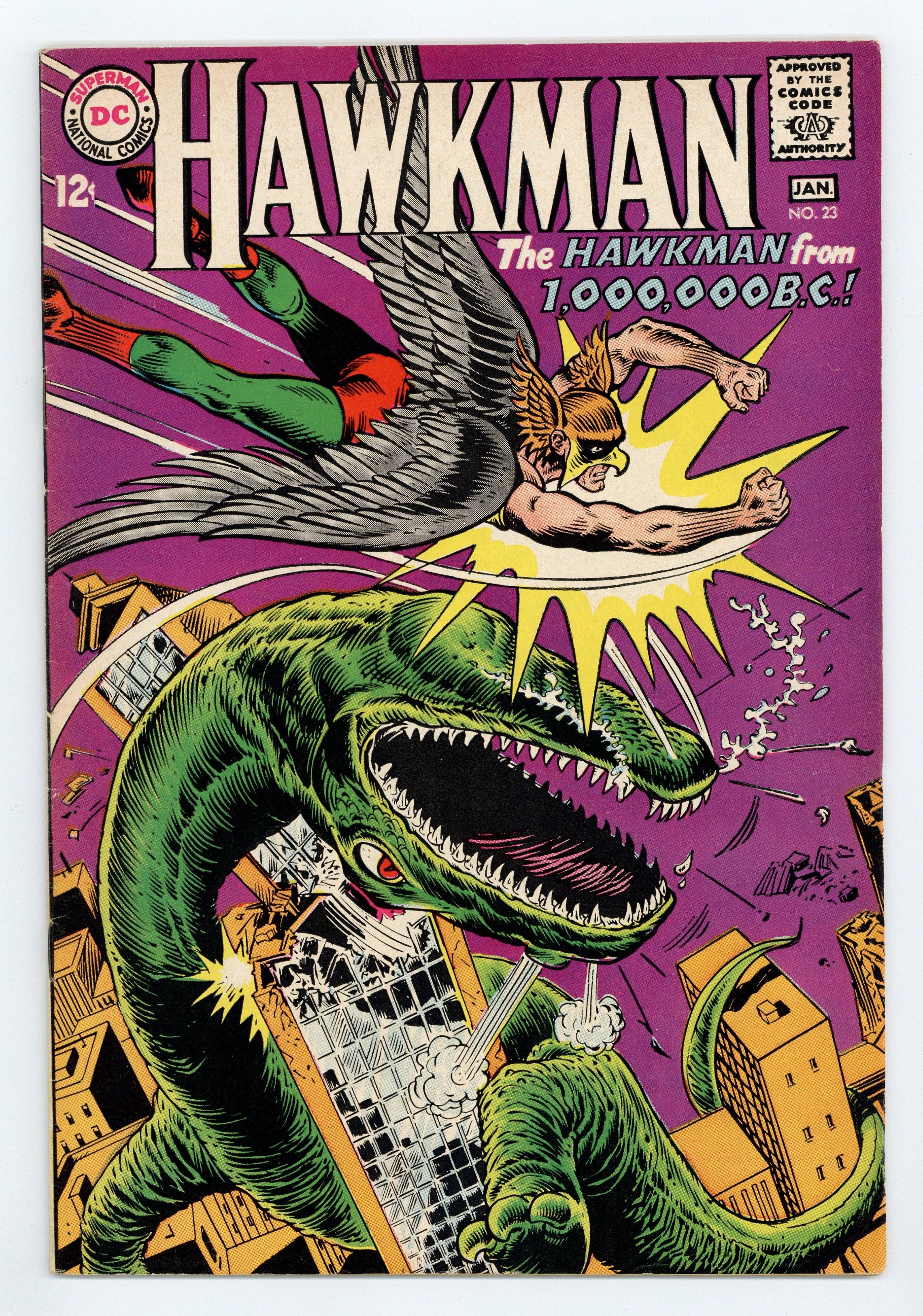 Cover pencils by Dick Dillin, inks by Chuck Cuidera. The Hawkman from 1,000,000 B.C.!, script by Richard Hughes, pencils by Dick Dillin, inks by Chuck Cuidera; Dr. Malevolo's time machine brings cavemen and dinosaurs into the present to carry out his evil plans and sends Hawkman back to prehistoric times. House ad for Superman (DC, 1939 series) #202, pencils by Curt Swan, inks by George Klein. 36 pgs. $0.12. Cover price $0.12.