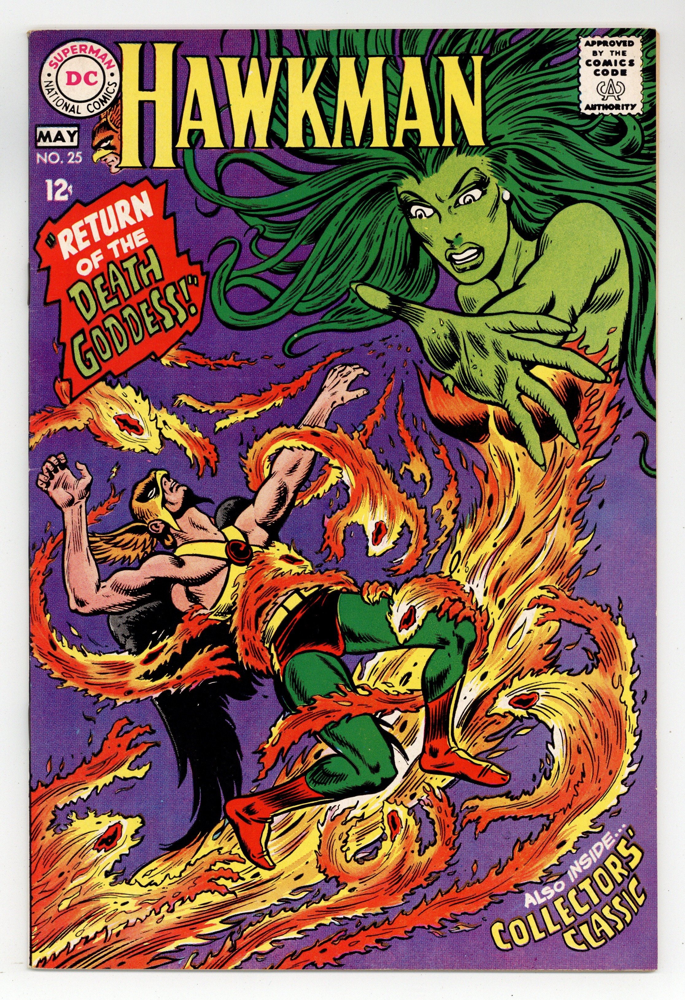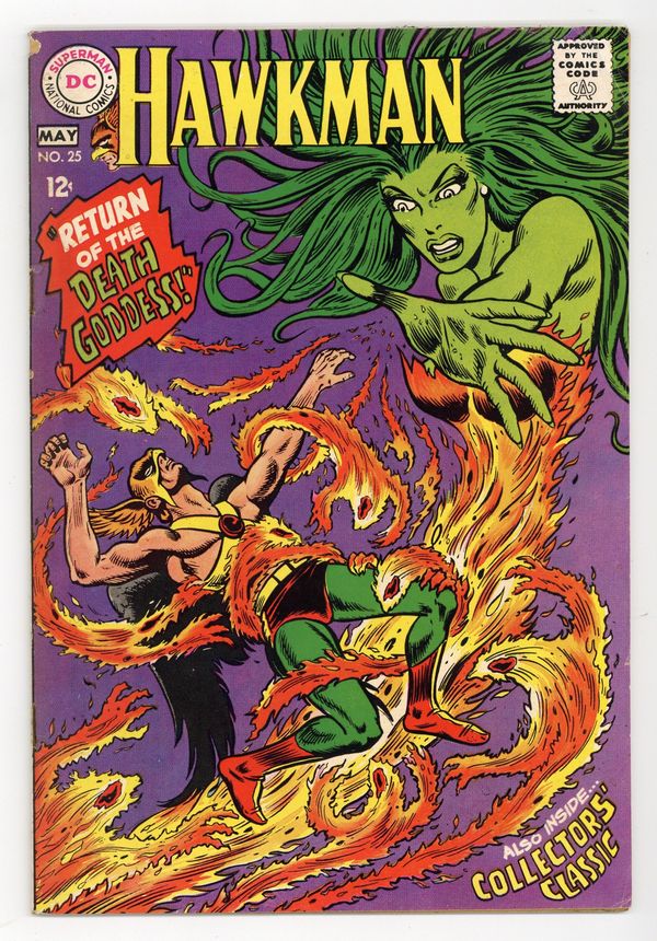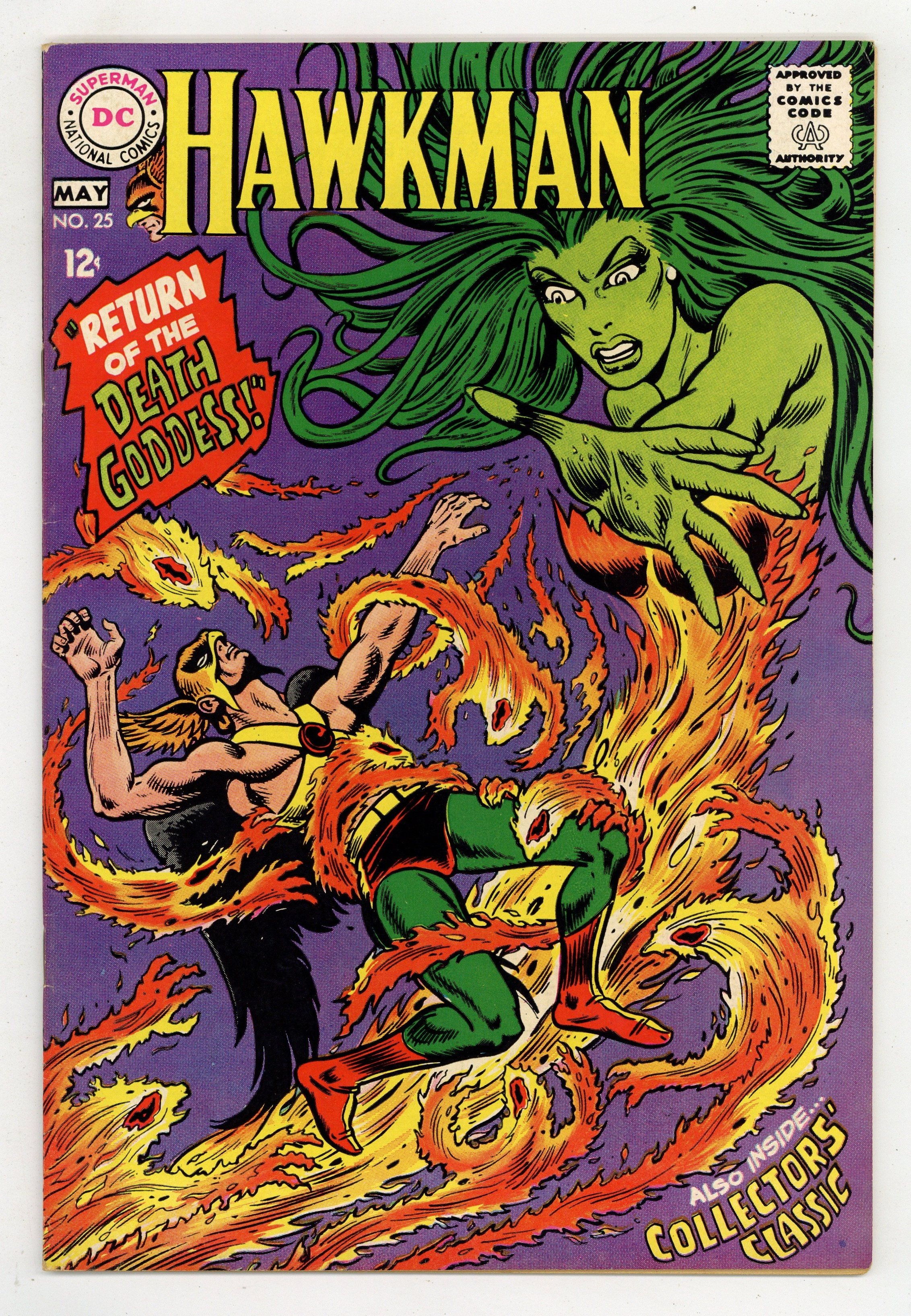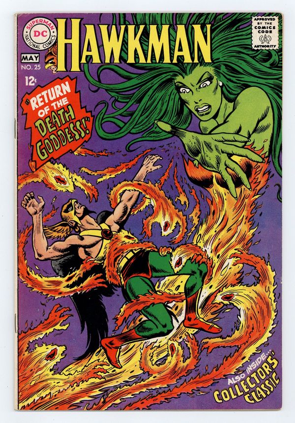 Cover pencils by Dick Dillin, inks by Chuck Cuidera. Return of the Death-Goddess!, script by Richard Hughes, pencils by Dick Dillin, inks by Chuck Cuidera; A blind archaeologist brings a statue of Medusa to the Midway City Museum, then accidentally releases the spirit of Medusa, who possesses the body of Shayera Hol and goes an a rampage with her magical powers. House ad for The Flash (DC, 1959 series) #178, pencils by Ross Andru, inks by Mike Esposito. Untitled Hawkman story, script by Gardner Fox, art by Sheldon Moldoff; Carter Hall nearly falls victim to a greedy doctor who is feeding his patients drugs that seem to seriously weaken their hearts. 36 pgs. $0.12. Cover price $0.12.