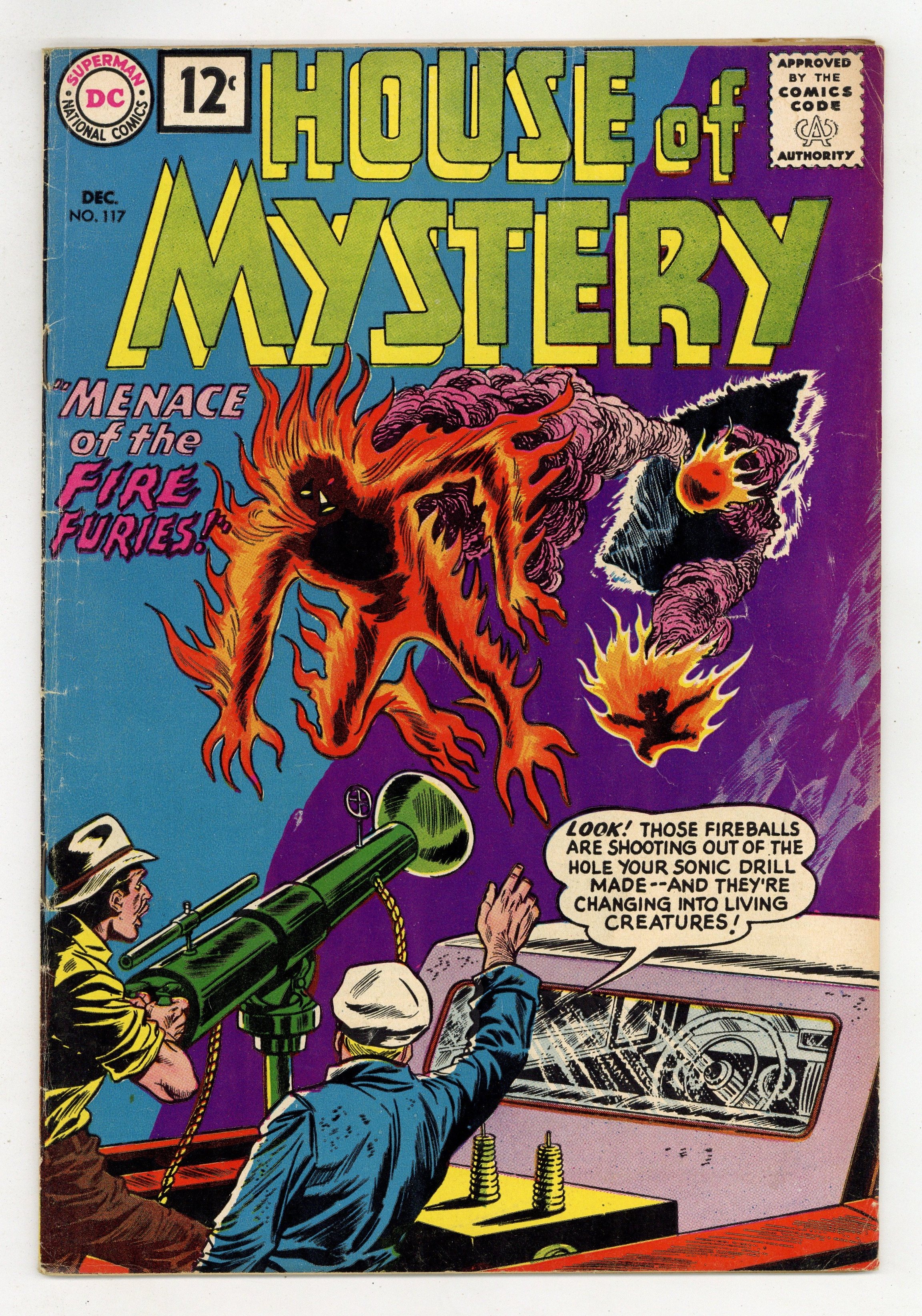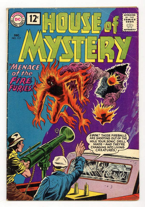 $17.25First 12-cent cover price. Cover pencils by Dick Dillin, inks by Sheldon Moldoff. "The Three Who Changed," art by George Roussos; Three men undergo weird transformations and must figure out what circumstance they have in common that caused the changes. Superboy ad. "People Are People!" public service announcement, script by Jack Schiff, art by Bernard Baily. One-page Moolah the Mystic story by Henry Boltinoff. "The Phantom Battle of General Brujo," art by Lee Elias; The ghosts of two long-dead generals reappear in the middle of a modern-day conflict and renew their former rivalry. Science Shorts filler page by Henry Boltinoff. "Secrets of the Ghostly Sounds" article; Various legends of phantom sounds are recounted with the reason behind some of them. "The Menace of the Fire Furies," art by Howard Sherman; An experimental sonic drill brings three strange fire beings to life and they go on a destructive rampage. Rip Hunter... Time Master ad. 36 Pages, Full Color. Cover price $0.12.