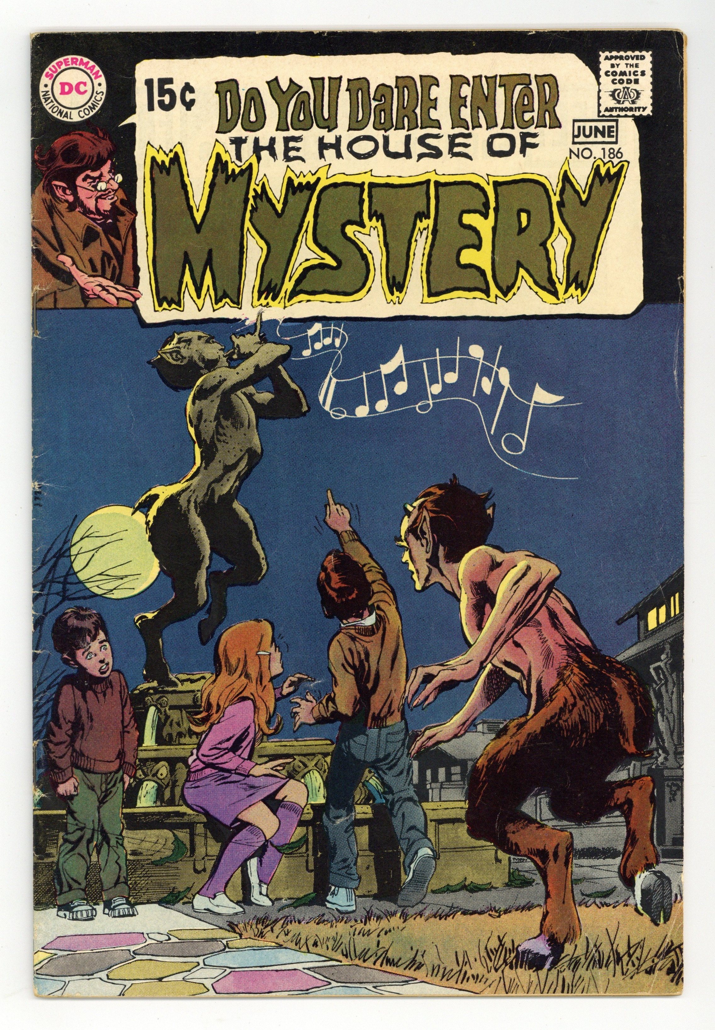 Cover art by Neal Adams. "The Secret of the Egyptian Cat," script by Robert Kanigher, art by Bernie Wrightson; To the House of Mystery comes Konassos, a sorcerer, with his white cat; Cain one night sees the cat transform into a woman who tells her tale; Isha, Egyptian priestess of the temple of Nu-Ta the Cat-God, is captured and held captive by Konassos; The sorcerer, to better control her, transforms the priestess into a white cat. Room 13 activity page by Sergio Aragones. 2-page Cain's Game Room cartoons by Sergio Aragones. "Nightmare," script by Robert Kanigher, pencils by Neal Adams and Joe Orlando (pg 1: Cain head), inks by Dick Giordano and Joe Orlando (pg 1: Cain head); A lonely little girl, Judy, seeks a friend and finds it in Pan, an animated statue; They play together in a fantasy world, but meantime in the real world she is struck by a fever and a doctor tries to cure her. One-page Cain's Game Room cartoon by Sergio Aragones. 36 Pages, Full Color. Cover price $0.15.