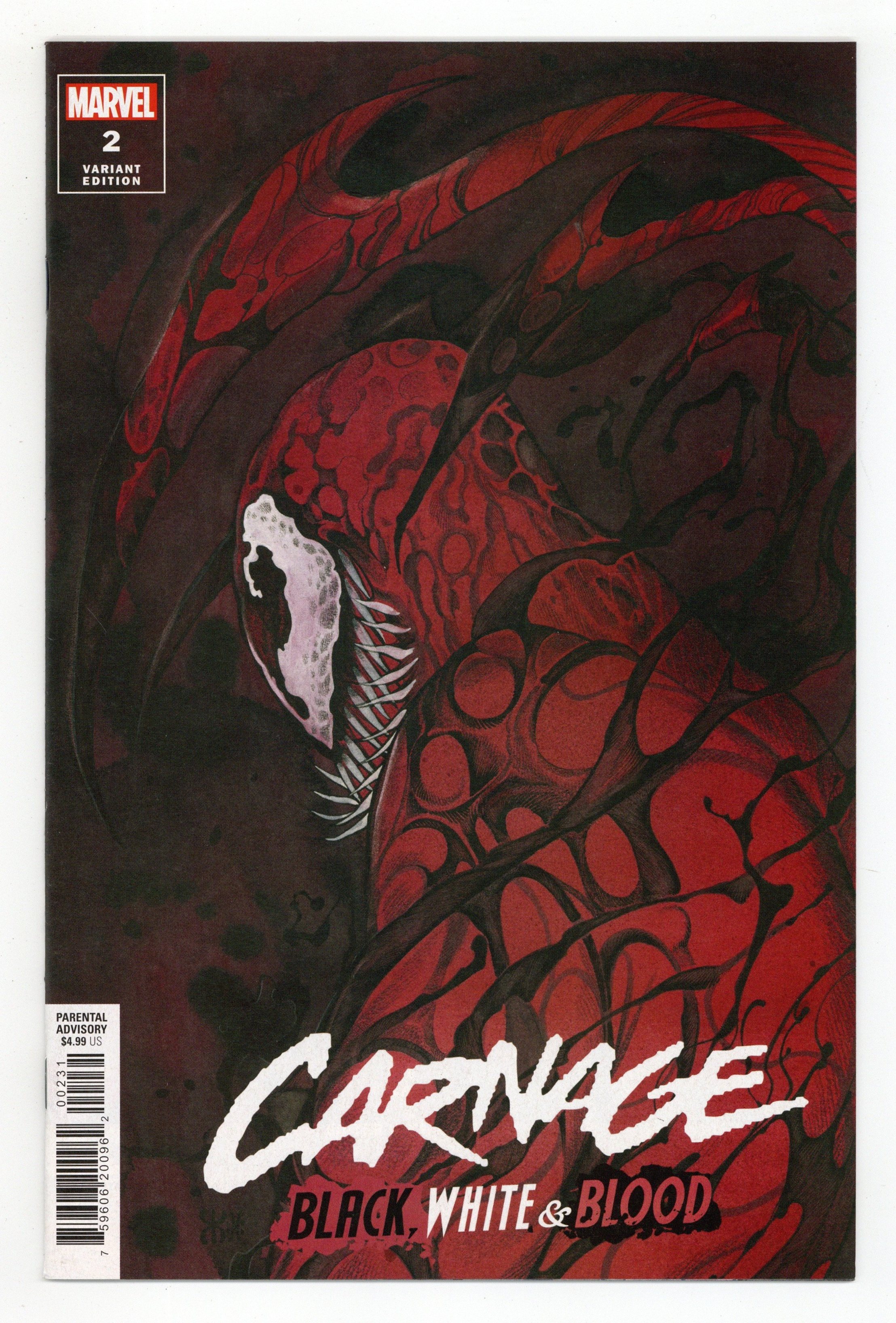 Limited 1 for 25 Retailer Incentive Variant Cover. Written by Chip Zdarsky & Various. Art by Marco Checchetto & More. Cover by Peach Momoko. The symbiotic slaughterfest continues, in the second installment of the stomach-churning study of ultraviolence called CARNAGE: BLACK, WHITE & BLOOD! FIRST! The DAREDEVIL team of Chip Zdarsky & Marco Checchetto lends their brutal sensibilities to an eye-popping story pitting Carnage against THE AMAZING SPIDER-MAN as you've never seen before! THEN! Al Ewing, who's brought a nigh-unthinkable level of body horror to the world of the IMMORTAL HULK, lends his terrifying talents to a tale - and if you thought his HULK stuff looked painful, you ain't ready for what he's done with Carnage! BUT WAIT! Because you readers out there in Mighty Marveldom deserve the best, we've brought comics heavyweight RAM V aboard for a story sure to make your skin crawl! 36 pages, PC/B&W. Parental Advisory Cover price $4.99.