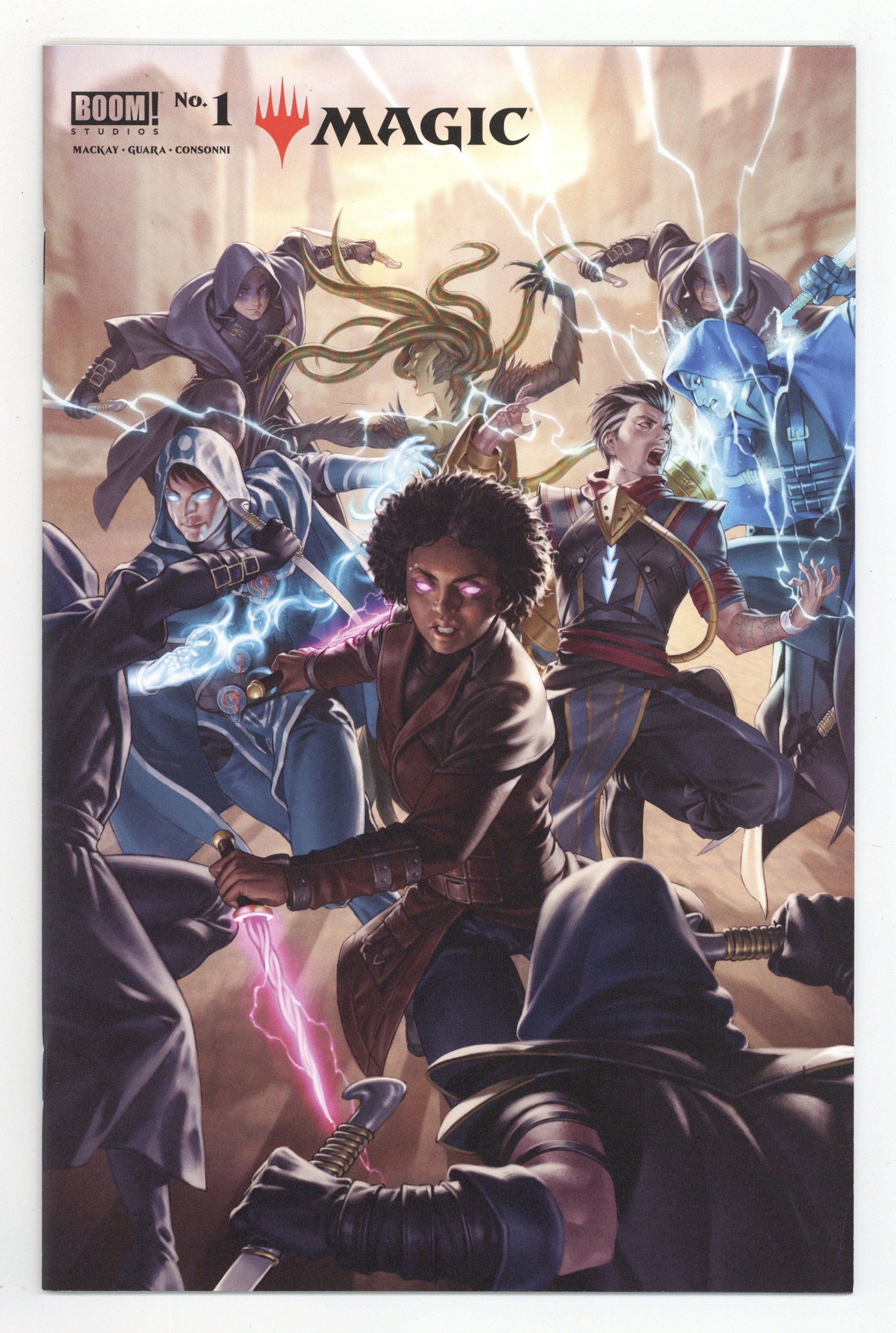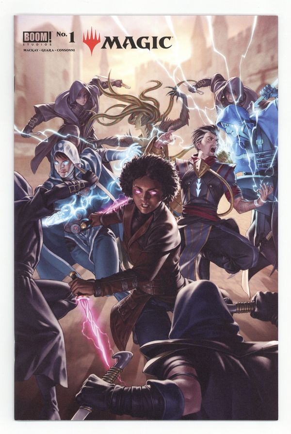 Published Apr 2021 by Boom Studios.$14.00Limited 1 for 50 Retailer Incentive Variant Cover. Written by Jed MacKay. Art by Ig Guara. Cover by Jung-Geun Yoon. A new beginning for the pop culture phenomenon of Magic starts here from Jed MacKay (Marvel's Black Cat) and Ig Guara (Marvel's Ghost-Spider), perfect for new readers and long time fans. Across the vast Multiverse, those gifted with a 'spark' can tap into the raw power of Magic and travel across realms -they are Planeswalkers. When coordinated assassination attempts on Guildmasters Ral Zarek, Vraska and Kaya rock the city of Ravnica and leave Jace Belleren's life hanging in the balance, a fuse is lit that threatens not just these three Guilds, but the entire plane of Ravnica. Now these three must covertly infiltrate the wild plane of Zendikar and form a tenuous alliance to uncover why the targets of the assassins have all been Planeswalkers...which will lead them straight to one of the most enigmatic characters in Magic history! 32 pages, full color. Cover price $4.99.