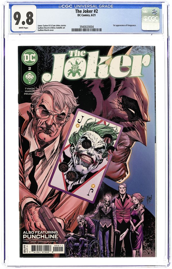 Written by James Tynion IV and Sam Johns. Art by Guillem March and Mirka Andolfo. Cover by Guillem March. As the dust settles on Arkham Asylum and tragic recent events, The Joker is the most wanted man in the world—and powerful forces are lining up around the globe to hunt him...but where exactly is the Clown Price of Crime? Jim Gordon, facing his twilight years haunted by the madman, knows where to start the hunt, and hes been given the go-ahead to pursue him... but will he be willing to pay the price? And what shocking revelation will Gordon stun Batman with before he departs? And in the backup story, within the walls of Blackgate Penitentiary, Punchline has become the target of the Queen of Spades from the Royal Flush Gang. Itll take everything Punchline has just to survive, while on the outside, Bluebird digs deeper into Punchlines horrific past! 36 pages, full color. Rated T+ Cover price $5.99.