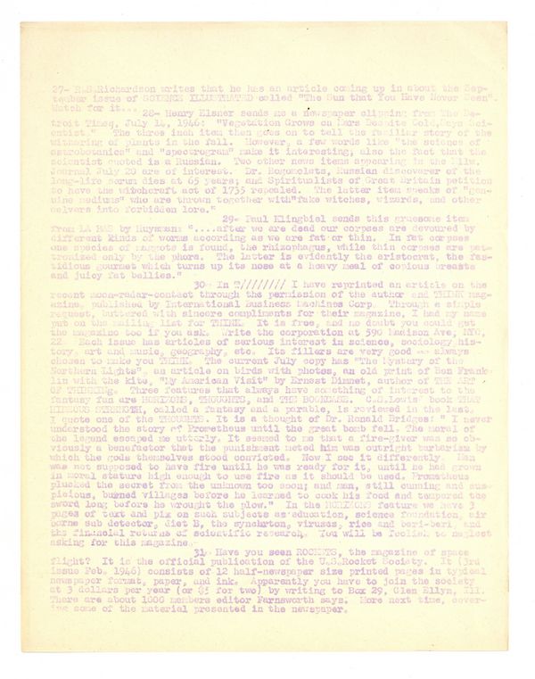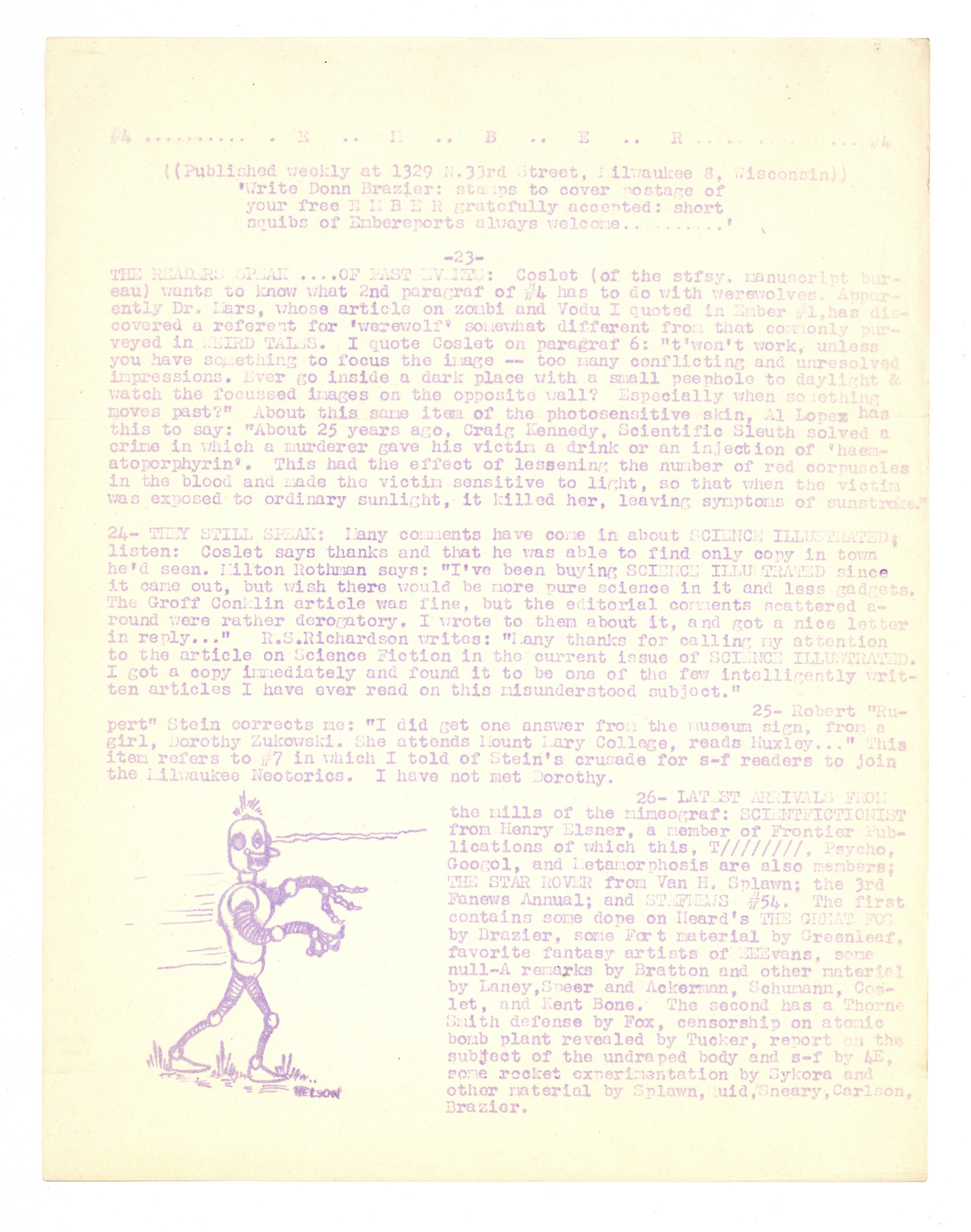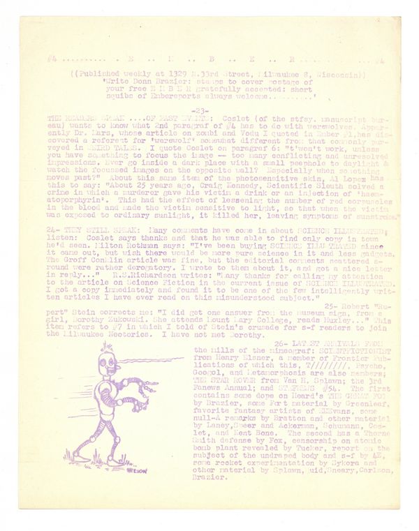 Published Jul 1946 by Donn P. Brazier.$23.00Issue #4. July 1946. Fanzine published by Donn P. Brazier. Single sheet mimeographed on both sides. Folded twice for mailing. 8.5" x 11". Black and white.