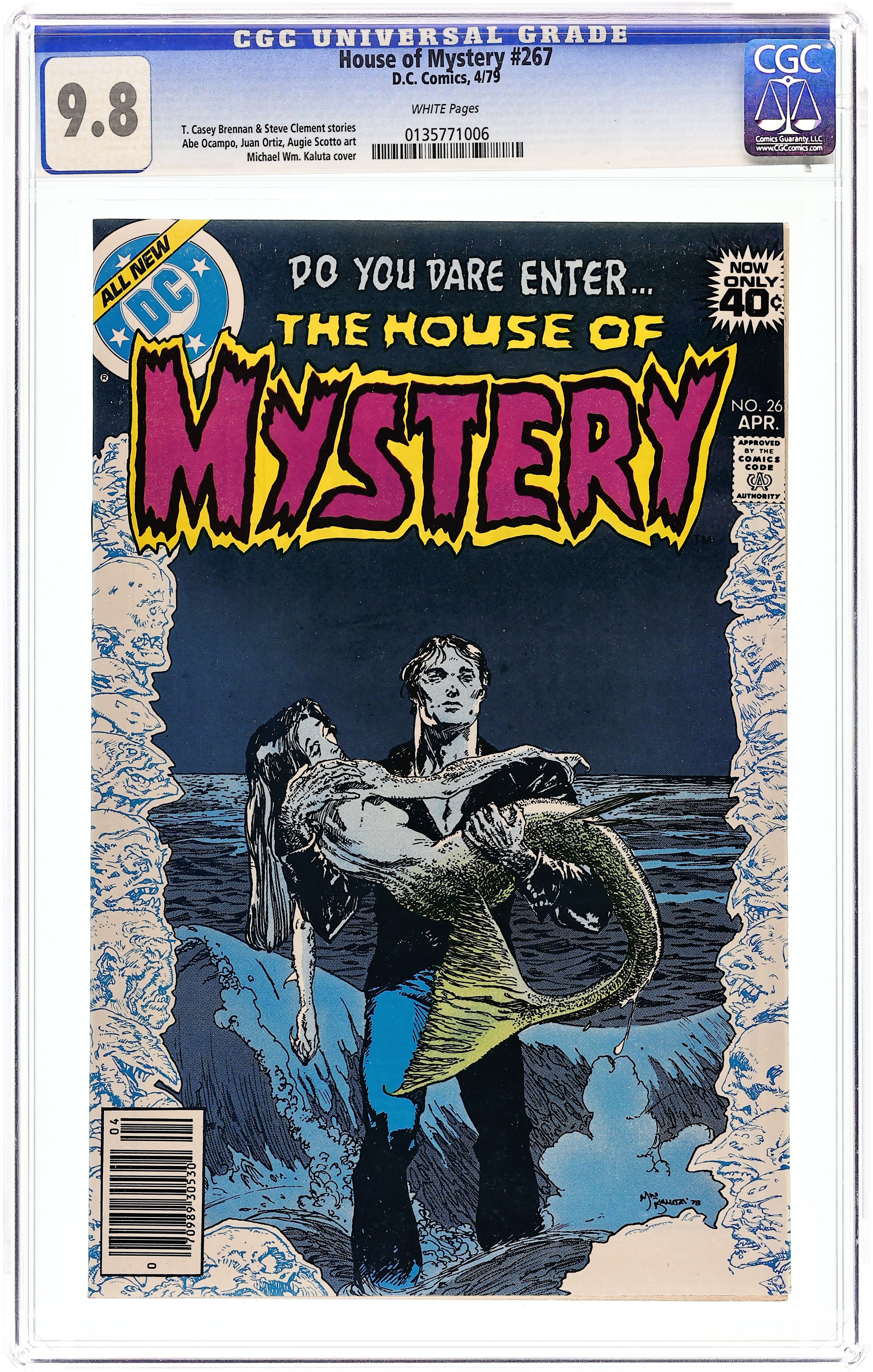 Cover art by Michael W. Kaluta. 1 page House of Mystery introduction, script by Paul Kupperberg, art by Romeo Tanghal. "A Strange Way to Die," script by T. Casey Brennan, art by Abe Ocampo; A man is led to his death by the ghost of the girl he killed in a car accident. "The Mouse of History," script by Don Thompson, art by Ruben Yandoc; A mouse escapes from a cage in research assistant Paul Jonas's lab, and leads him to a magic book that can alter the future; He uses the book to his advantage, but the mouse inadvertently causes his death by chewing parts of the pages away, which changes the words written in the book. "The Golden Treasure" Hostess snack cakes ad with Wonder Woman. Superman ad. "The Lovely Little Lady with the Sea-Green Tail!", script by Steve Clement, pencils by Juan Ortiz, inks by Augie Scotto; A marine biologist finds a mermaid and keeps her captive, but when he tries to lure her mate to add to the exhibit he is eaten by the creature that emerges from the sea. Statement of ownership; Average number of copies sold during preceding 12 months (total paid circulation): 75,650; Actual number sold for issue nearest filing date (total paid circulation): 66,747. 36 Pages, Full Color. Cover price $0.40.