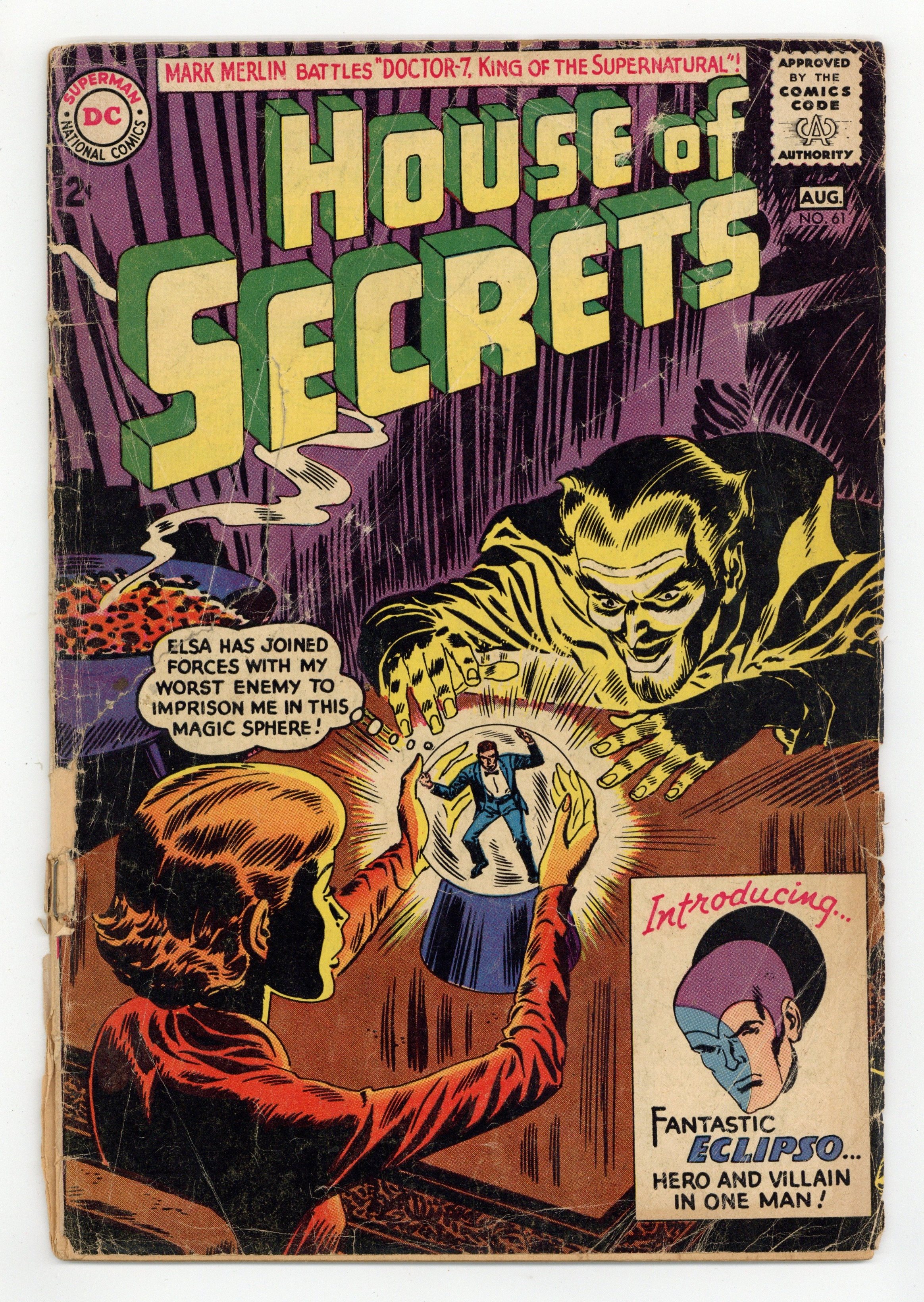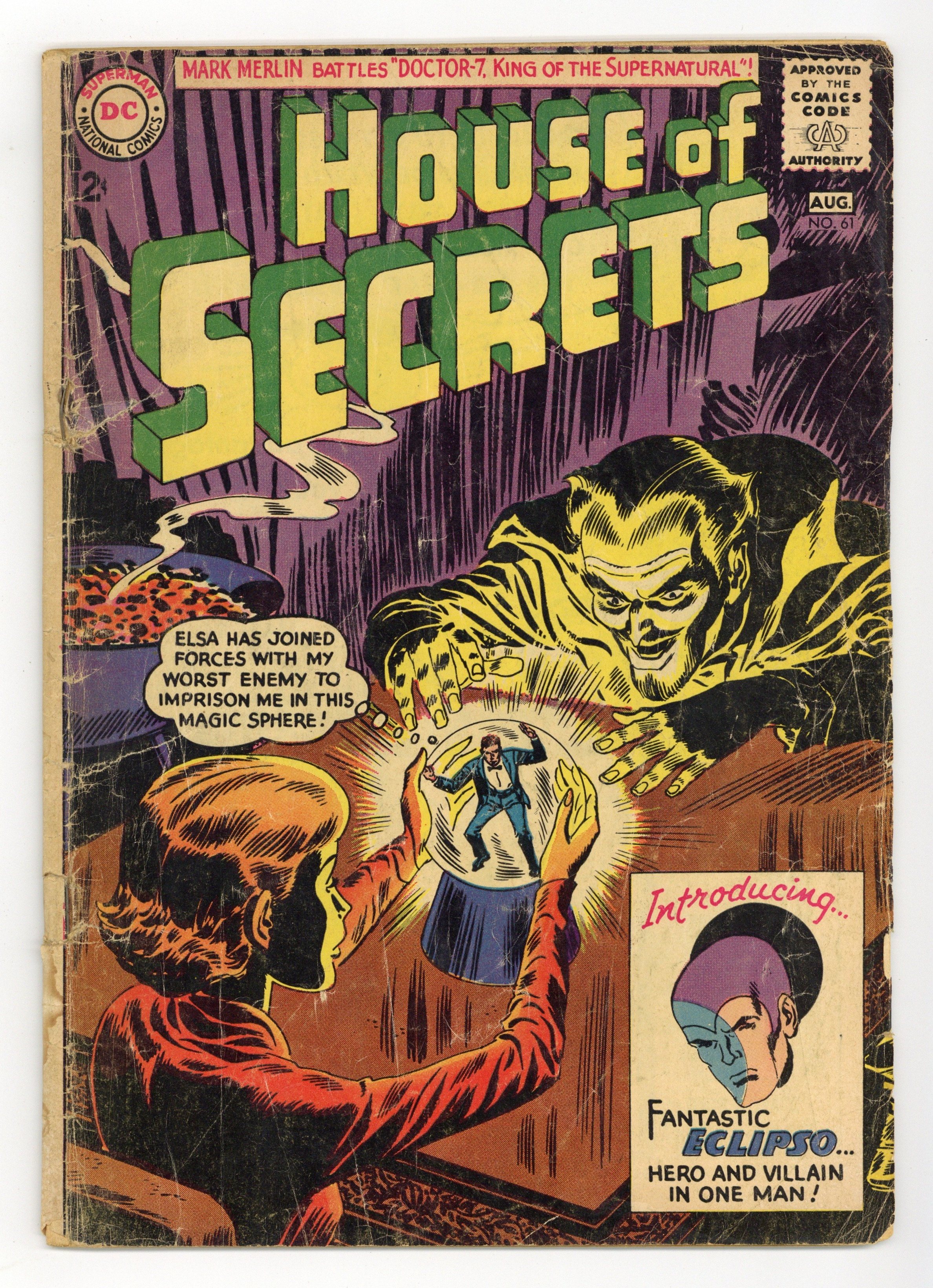 Cover art by Lee Elias. "Doctor-7, King of the Supernatural," art by Mort Meskin; Doctor-7 finds a way to hypnotize Mark Merlin into stealing the ingredients he needs for his magic potions, but he is eventually outwitted by Merlin. The Strange Lives of Batman and Robin ad. "A Tree Grows on Second Street!" public service announcement, script by Jack Schiff, art by Sheldon Moldoff; The Badger Club learns about the rules for planting trees along the streets in their town. "Eclipso, the Genius Who Fought Himself," script by Bob Haney, art by Lee Elias; Bruce Gordon becomes Eclipso for the first time, destroying Solar City, and with the help of Professor Bennett, discovers explains how he was transformed into Eclipso during a solar eclipse. Brief biography of artist Lee Elias. 2/3-page Moolah the Mystic story by Henry Boltinoff. 36 Pages, Full Color. Cover price $0.12.