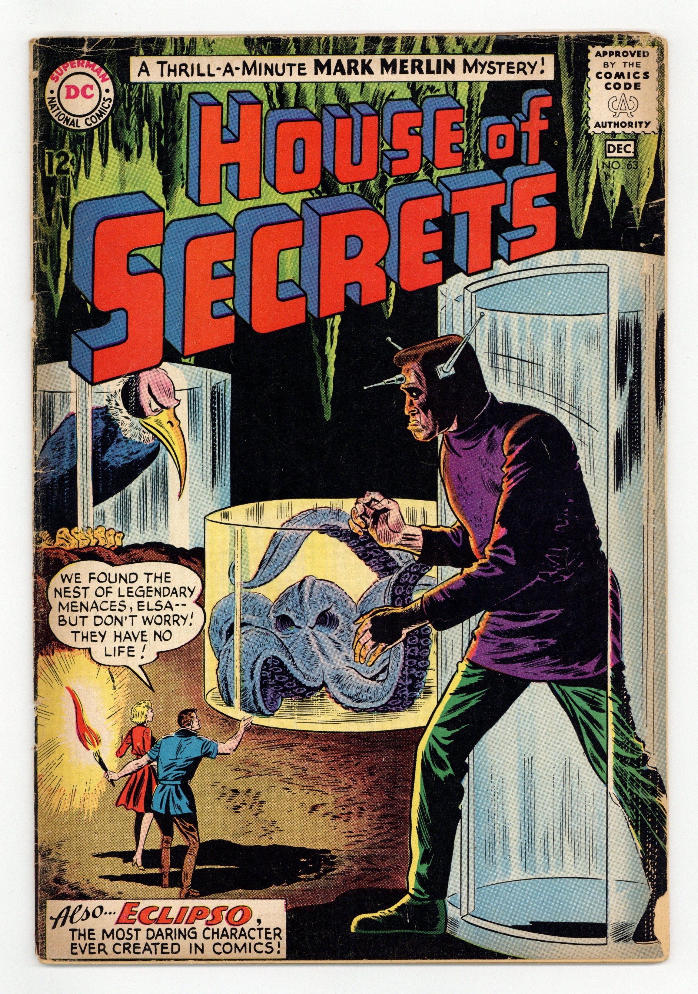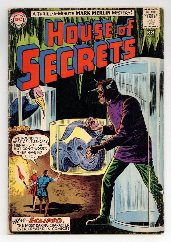 Cover pencils by Dick Dillin, inks by Sheldon Moldoff. "Your United Nations at Work" public service announcement, script by Jack Schiff, art by Sheldon Moldoff; Burmese Lin Tan goes to WHO nursing school in Rangoon; She then is able to diagnose the bubonic plague in her home village. "The Nest of Fear!", script by Arnold Drake, art by Mort Meskin; Mark and Elsa discover a cave that contains legendary creatures such as the roc and the kraken, and they must defeat the creatures when they escape. 2/3-page Peter Puptent Explorer story by Henry Boltinoff. Doom Patrol ad. "Secret Locked in the Ice," pencils by Gene Colan; A thief returns to the Alps to recover a stolen treasure previously lost there but the search ends in his death. The Flash ad. 2/3-page Moolah the Mystic story by Henry Boltinoff. Tomahawk ad. "Eclipso's Amazing Ally!", script by Bob Haney, art by Alex Toth; Eclipso builds a robot Eclipso to fool Bruce Gordon but when the robot Eclipso traps Bruce and Professor Bennett and tries to kill them, Eclipso must help them escape. Ad for Green Arrow and Manhunter from Mars. 36 Pages, Full Color. Cover price $0.12.