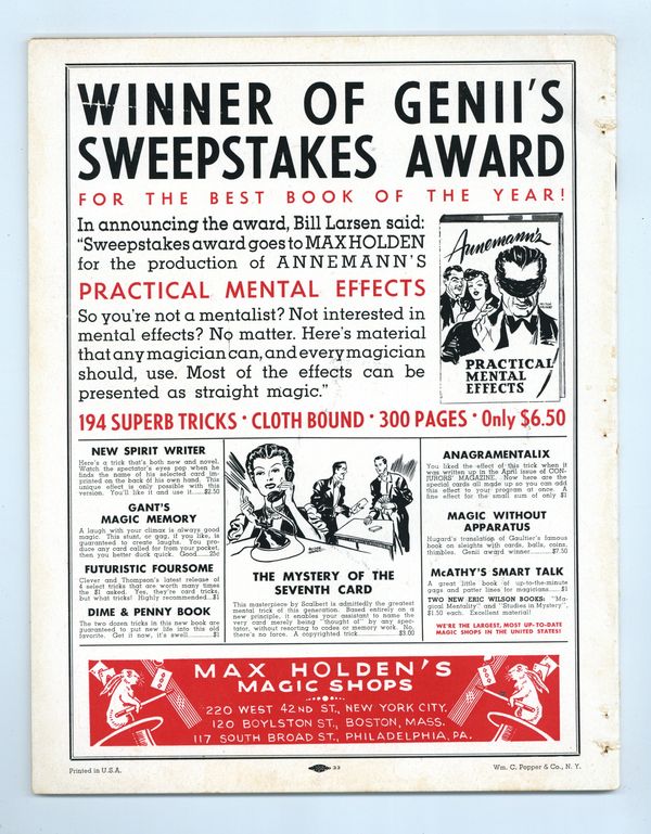 Published Sep 1945 by Conjurors' Press.$9.00- Spine split 20%. Water damage: Slight.