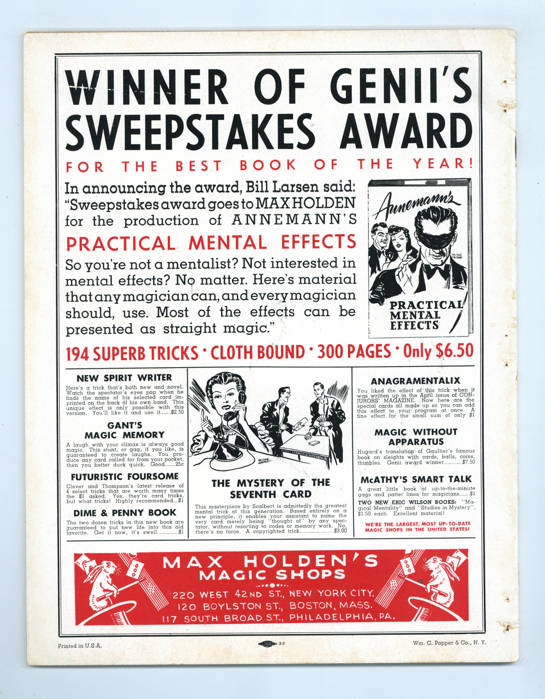 Published Sep 1945 by Conjurors' Press.$9.00- Spine split 10%. Water damage: Moderate. Staple rust: Moderate.