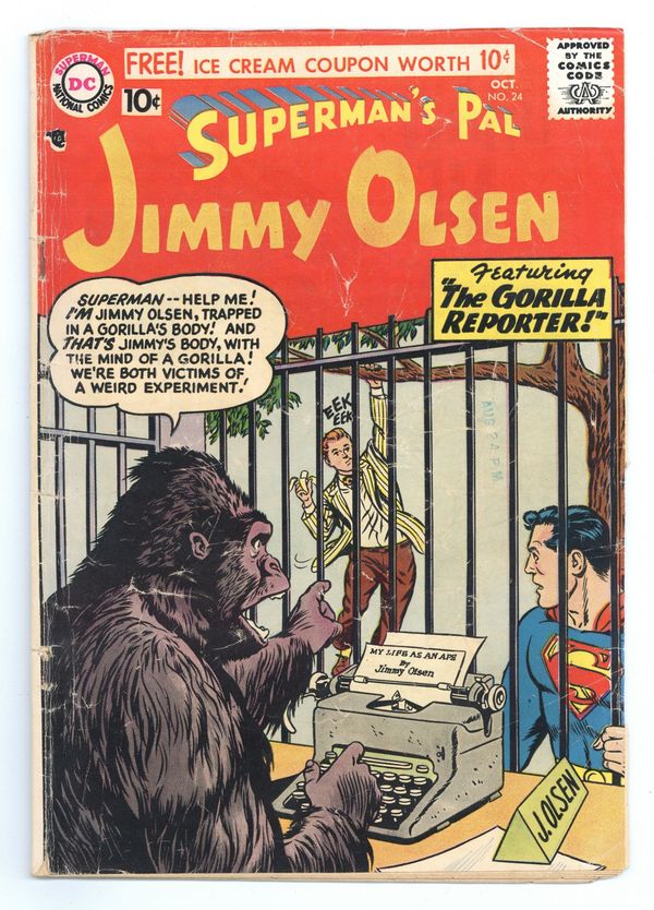 Cover pencils by Curt Swan, inks by Stan Kaye. The Superman Hall of Trophies; tour guide Jimmy Olsen accidentally exposes Superman to Kryptonite. The Luckiest Boy in the World; Jimmy believes a turban he bought at a fair is good luck. Scripts by Otto Binder, pencils by Curt Swan, inks by Ray Burnley. How NOT to Enjoy a Vacation! public service announcement, script by Jack Schiff, art by Ruben Moreira. The Gorilla Reporter; Jimmy's mind get switched out with a gorilla. So You Want to be a Veterinarian article. Tricksy humor page by Henry Boltinoff. 36 Pages, Full Color. Cover price $0.10.