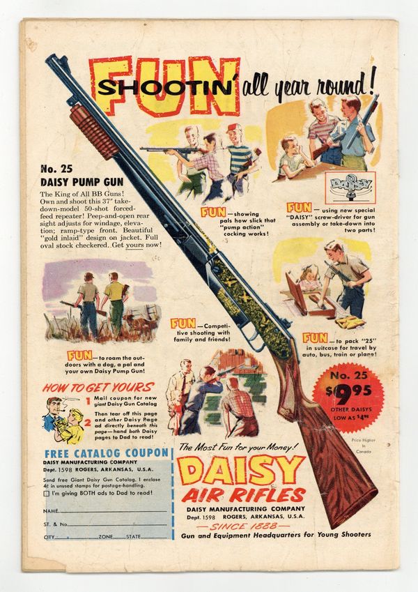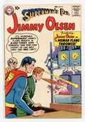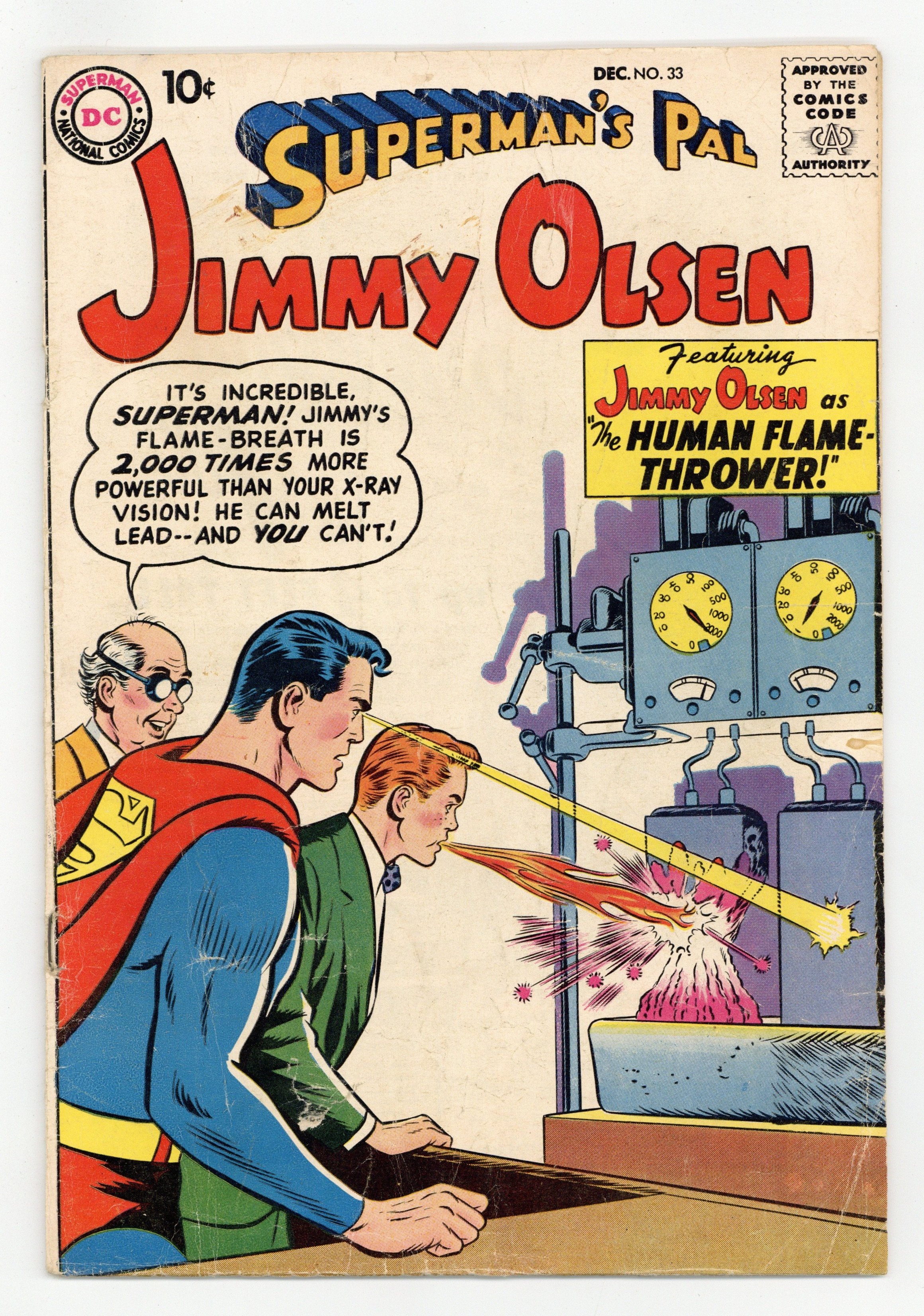 Tags: Superman$17.00Cover pencils by Curt Swan, inks by Stan Kaye. The Legends that Came to Life!, script by Otto Binder, pencils by Curt Swan, inks by Ray Burnley; Jack Frost, Jack (from Jack in the Beanstalk), and the Pied Piper come to life. The Lady-Killer from Metropolis!, script by Alvin Schwartz, pencils by Curt Swan, inks by Ray Burnley. Supergram The Superman Puzzle Game. Meet TV's Jimmy Olsen article bio on Jack Larsen. The Human Flame-Thrower!, script by Otto Binder, pencils by Curt Swan, inks by Ray Burnley; An accident involving an experiment of Prof. Potter's gives Jimmy fire-breath. 36 Pages, Full Color. Cover price $0.10.