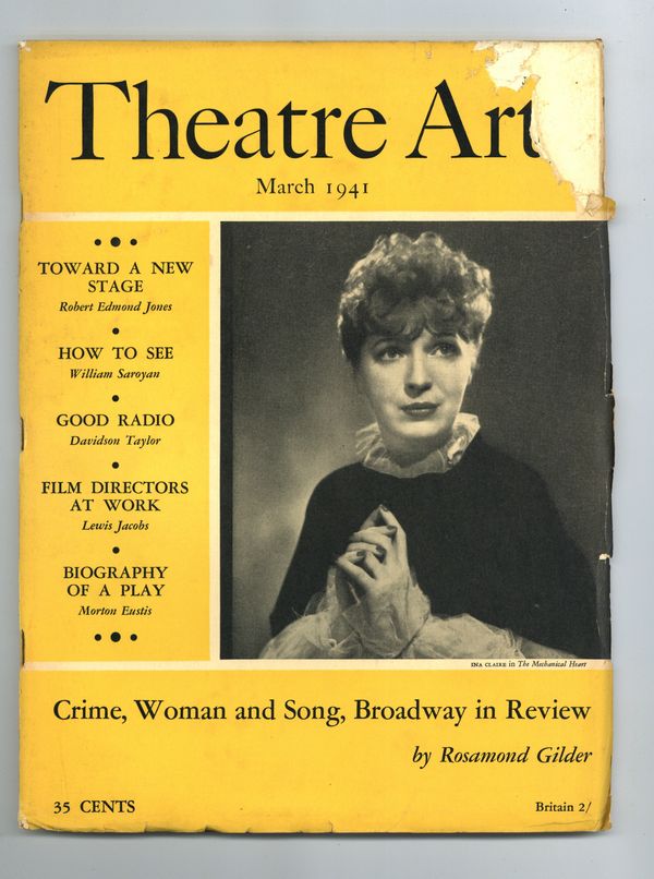 Theatre Arts Monthly (March, 1941). TAM is legendary for its thorough and insightful coverage of the stage, both in American and England. Less well-known is the fact that TAM also provided some outstanding coverage of motion pictures. Broadway and Hollywood. Includes: "How to See" by William Saroyan; photo of Boris Karloff from "Arsenic and Old Lace"; photo of Preston Sturges, Henry Fonda, and Barbara Stanwyck on set of "The Lady Eve"; much more. 8.5-in. x 11-in., printed on a nice heavy stock. Cover price $0.35.