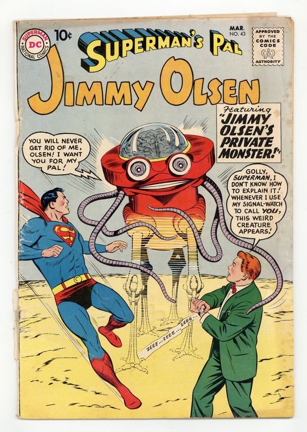 Cover pencils by Curt Swan, inks by Stan Kaye. Jimmy Olsen's Four Fads!, pencils by Curt Swan, inks by Stan Kaye. The Brave and the Bold #28 ad. Phantom Fingers Olsen, pencils by Wayne Boring, inks by Stan Kaye; Jimmy joins a shoplifting gang to find out who is calling the shots. Jimmy Olsen's Private Monster!, script by Jerry Siegel, pencils by Curt Swan, inks by John Forte; A monster appears whenever Jimmy uses his signal watch. 36 Pages, Full Color. Cover price $0.10.