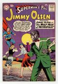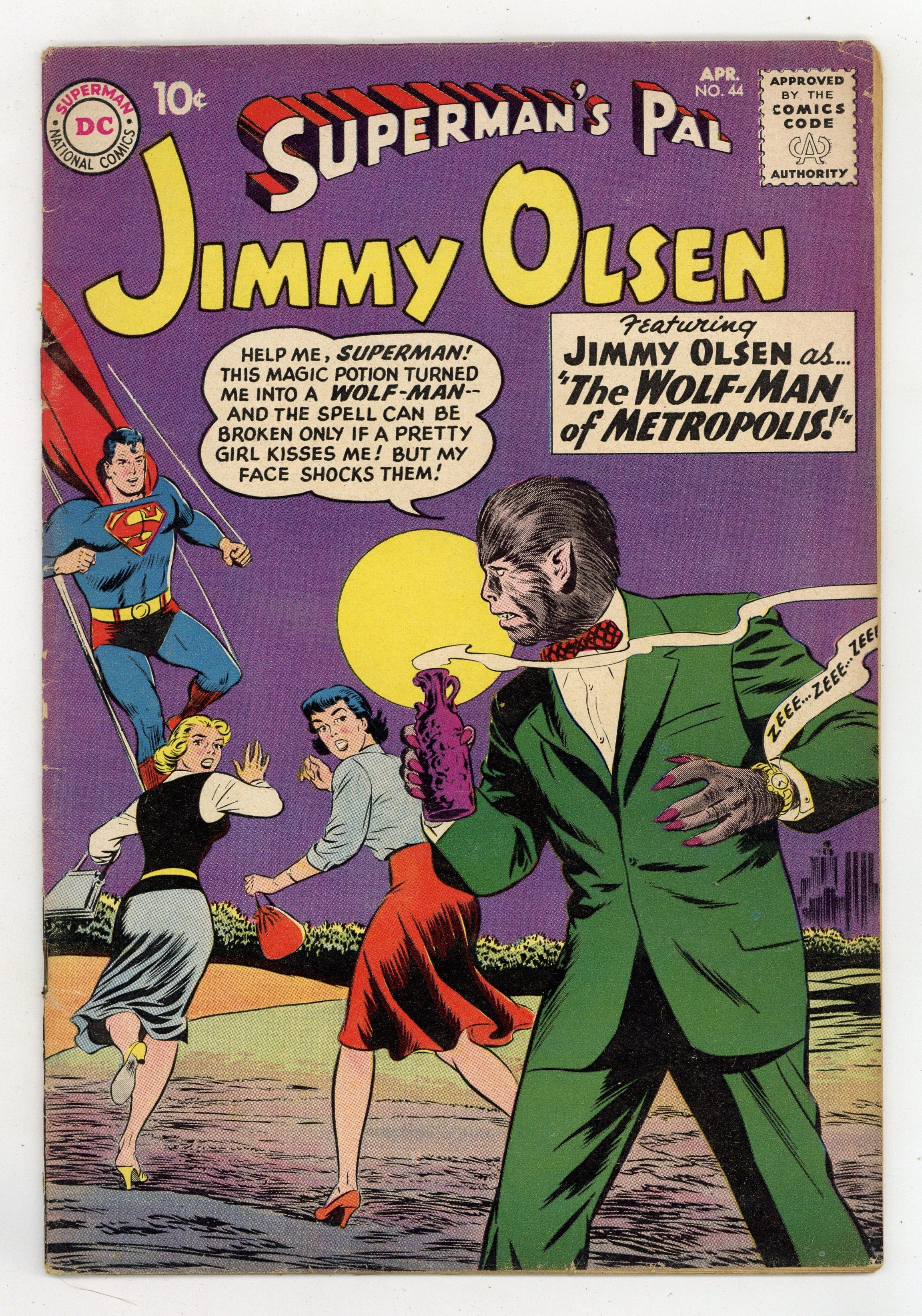 Cover pencils by Curt Swan, inks by Stan Kaye. The Wolf-Man of Metropolis!, script by Otto Binder, pencils by Curt Swan, inks by Stan Kaye; Jimmy drinks a potion left behind by Merlin that turns him into a Wolf-Man every night, a spell which can only be broken by a kiss from a beautiful maiden. Aloha... Hawaii! public service announcement, script by Jack Schiff, art by Bernard Baily. Jimmy's Leprechaun Pal!, script by Jerry Siegel, pencils by Curt Swan, inks by John Forte; Jimmy gets his own personal leprechaun, who is secretly Mr. Mxyztplk in disguise. Miss Jimmy Olsen!, script by Robert Bernstein, pencils by Curt Swan, inks by Stan Kaye. 36 Pages, Full Color. Cover price $0.10.