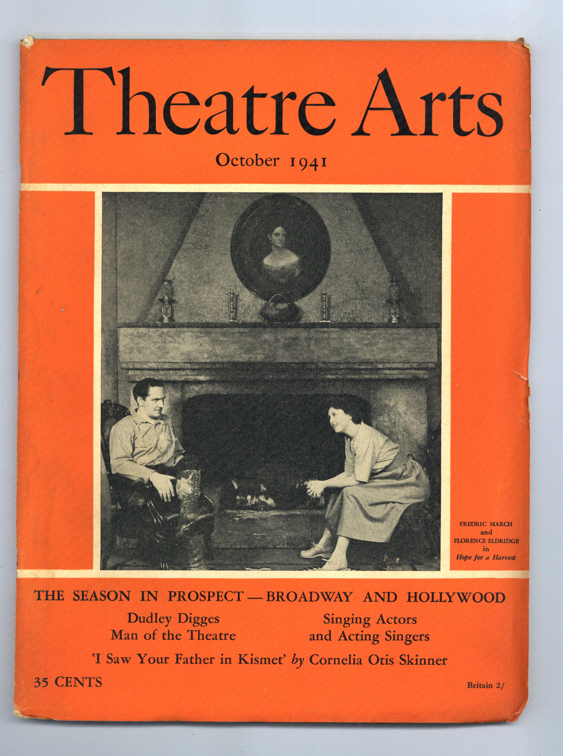 Published Oct 1941 by Theatre Arts, Inc..$2.65Theatre Arts Monthly (October, 1941). TAM is legendary for its thorough and insightful coverage of the stage, both in American and England. Less well-known is the fact that TAM also provided some outstanding coverage of motion pictures. Broadway and Hollywood. Includes: photo of Canada Lee from "Native Son"; photo of Ethel Waters from "Mamba's Daughters"; photo from a production of "The Yellow Jacket" with Harpo Marx in a non-Marx Bros. role; much more. 8.5-in. x 11-in., printed on a nice heavy stock. Cover price $0.35.
