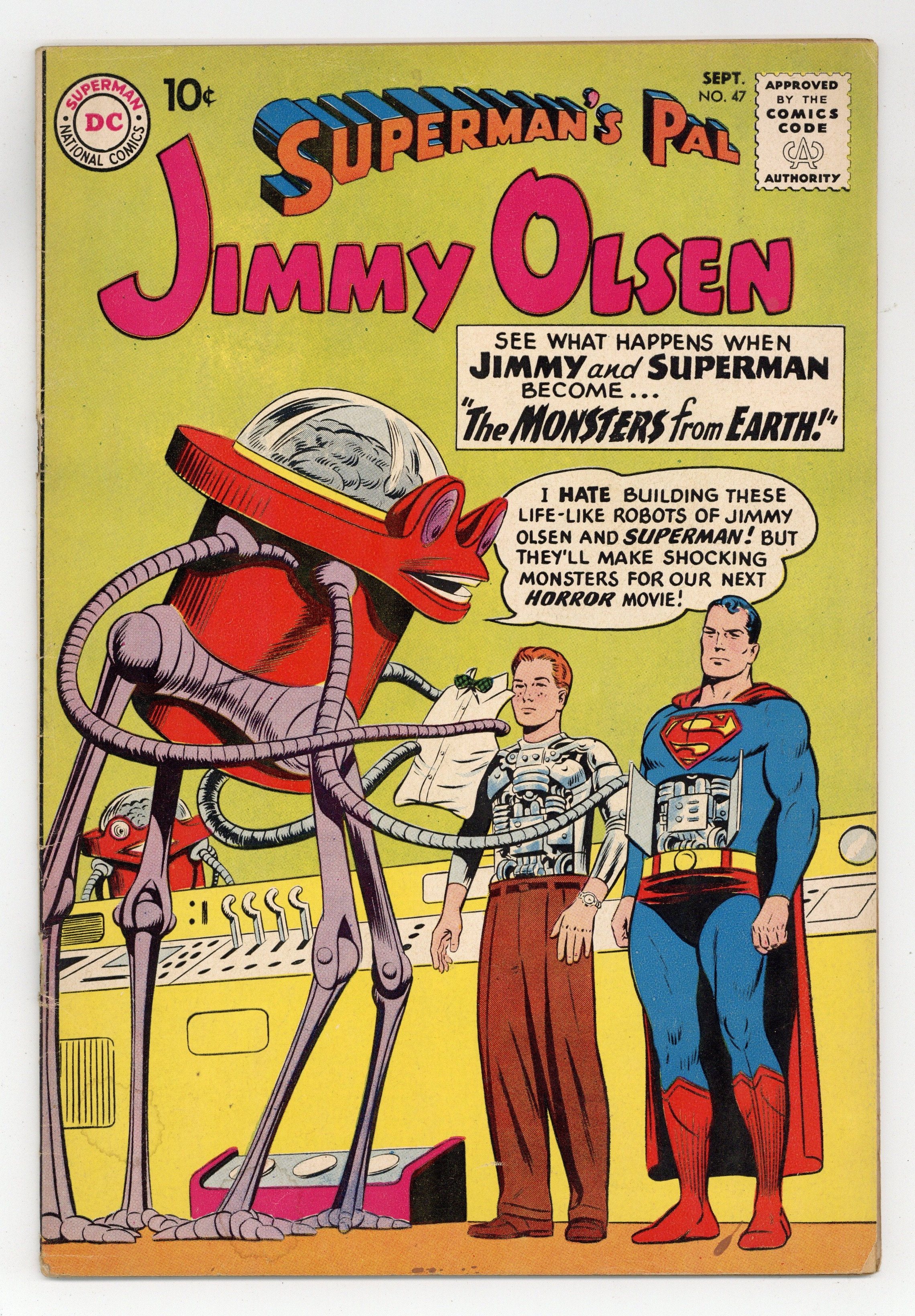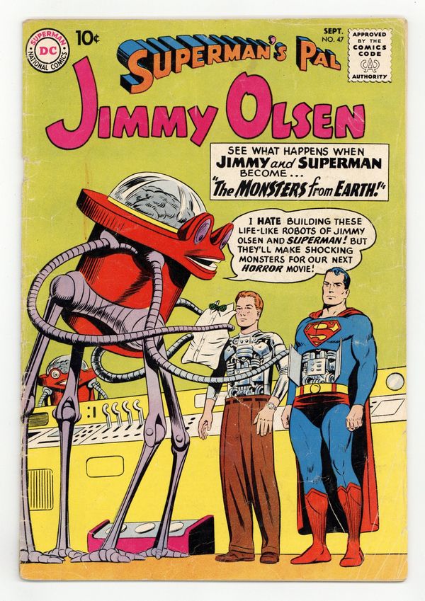Cover pencils by Curt Swan, inks by Stan Kaye. The King of Crime!, script by Robert Bernstein; in order to get a story, Jimmy shaves his head to masquerade as gangster Winky McCoy. Jimmy Olsen Grows Up!, script by Otto Binder; Jimmy drinks a potion to become an adult. The Monsters from Earth!, script by Jerry Siegel. Pencils by Curt Swan, inks by John Forte. 36 Pages, Full Color. Cover price $0.10.