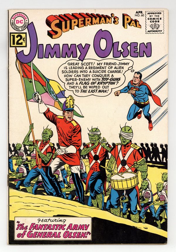 Cover pencils by Curt Swan, inks by Sheldon Moldoff. Super-Mite!, script by Leo Dorfman, art by Al Plastino; Superman gives a sick boy a tiny robot called Super-Mite. The Girl Who Was Lucy Lane's Double!, script by Robert Bernstein, pencils by Curt Swan, inks by George Klein; Jimmy chases Streaky the Super-Cat back to 1692, where he's tried as a witch. Peg humor page by Henry Boltinoff. The Fantastic Army of General Olsen!, script by Leo Dorfman, pencils by Curt Swan, inks by George Klein. 36 Pages, Full Color. Cover price $0.12.