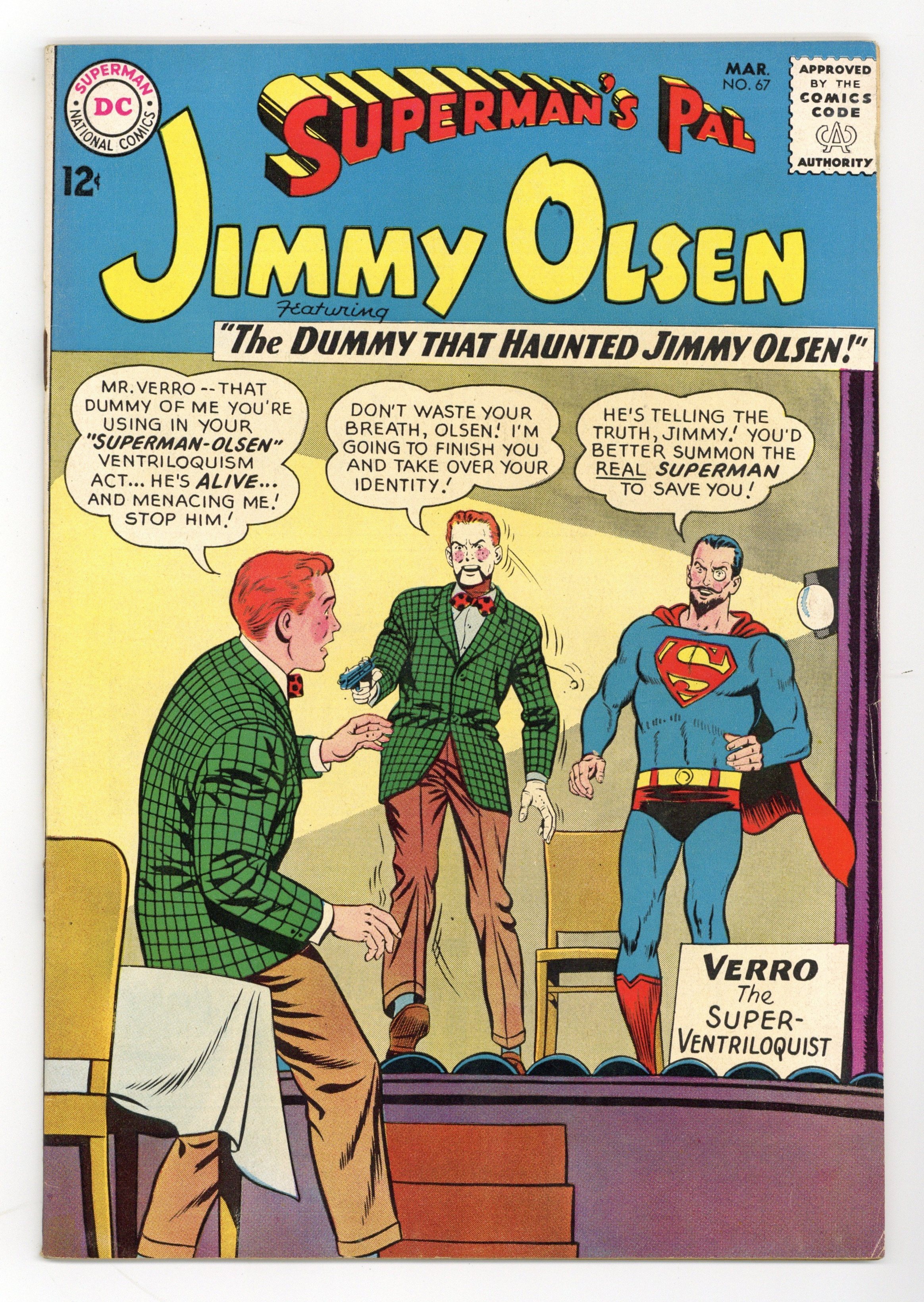 Cover pencils by Curt Swan, inks by George Klein. Safety First -- All Year! public service page, script by Jack Schiff, art by Sheldon Moldoff. The Dummy that Haunted Jimmy Olsen!, script by Edmond Hamilton, art by John Forte; Jimmy is being attacked by a ventriloquist's dummy. Leslie Lowe, Girl Reporter!, script by Leo Dorfman, pencils by Curt Swan, inks by George Klein; Jimmy quits the Daily Planet, but when he discovers he can't get another job he disguises himself as a woman to get his old job back. Super Lucy Lane!, script by Jerry Siegel, art by John Forte. Statement of ownership--average print run 470,000. 36 Pages, Full Color. Cover price $0.12.