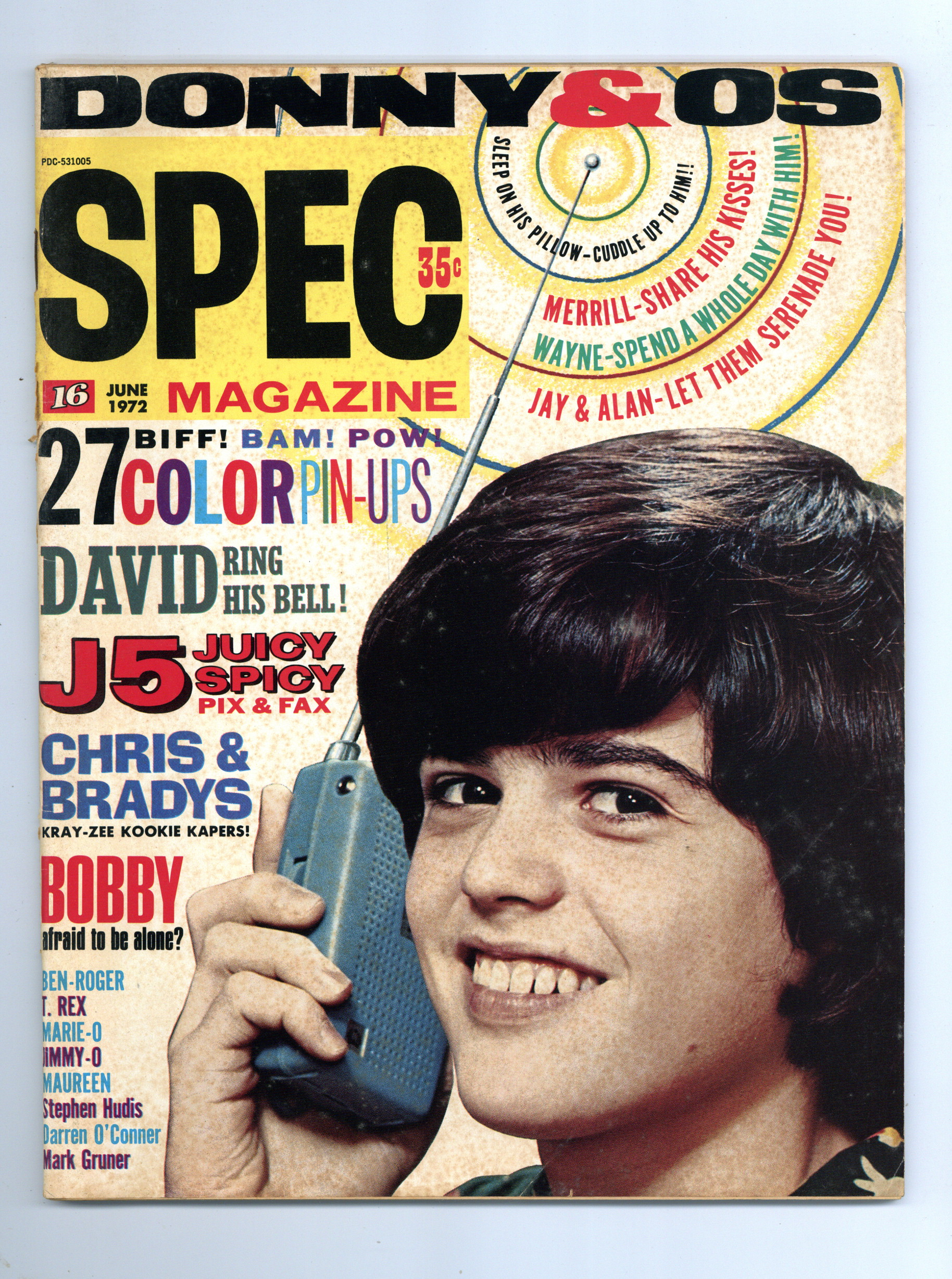 Issue #39. June 1972. Fan magazine aimed at teen girls. Coverage of the Osmonds, Jackson 5, David Cassidy, and more. 8.25" x 11". 66 pages. Black and white with a few color pages. Cover price $0.35.